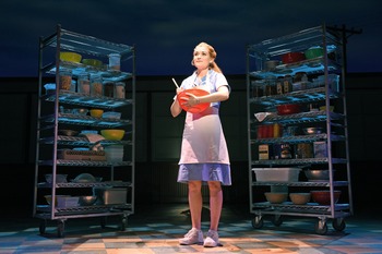 Although there is a fair bit of adultery going on in Waitress, the show is more in line with true "family values" than almost any musical currently playing anywhere. (The two closest current contenders would be Come from Away and The Book of Mormon.) Waitress embodies the ideals of friendship, community, love, self-respect, humility, and commitment to craft in a way that is inspiring without ever feeling preachy or didactic. Jenna (Christine Dwyer) embodies a sort of hard-working Middle American woman that could all too easily drift into clichéshe works in a diner where her crusty boss Cal (Ryan G. Dunkin) doesn't fully appreciate her and customers have odd demands, but is supported by her co-workers: confident, sassy Becky (Anastacia McCleskey) and geeky, insecure Dawn (Jessie Shelton). But bookwriter Jessie Nelson (working from the story and characters created by Adrienne Shelly, who wrote the movie that inspired the musical) manages to avoid well-worn platitudes and present a set of lovingly drawn characters with stories and dimensions of their own. There are no great surprises in this plot, which kicks off with Jenna discovering she's pregnant by her lout of a husband Earl (Matt DeAngelis). But Nelson wrings a lot of humor out of what is a very bad situation. The no-nonsense sassy black woman may be a well-worn comic vehicle, but it comes by that wear honestly, because it works: audiences love to see when someone who has been held down stand up for herselfand like it even more when she stands up for a friend.