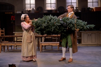 Well, I have good news for you, as The Wickhams: Christmas at Pemberley, now in production at Marin Theatre Company, has a full complement of upstairs/downstairs characters meeting the challenges of life together in a large English country house. Granted, the action in The Wickhams: Christmas at Pemberley takes place a century before the goings-on in "Downton Abbey," but the primary tropes of class distinction, changing times, duty and honor are all on display. The action all takes place in the kitchen of Pemberley Estate (wonderfully realized by scenic designer Wilson Chin), where Mr. Fitzwilliam Darcy (David Everett Moore), the primary love interest in Jane Austen's Pride and Prejudice lives. Now married to Elizabeth Bennet (Melissa Ortiz), the protagonist of the novel, the couple have invited Elizabeth's sister Lydia (Madeline Rouverol) to stay for Christmas, despite the fact that Lydia's husband George Wickham (Kenny Toll), a childhood friend of Mr. Darcy's is most decidedly not welcome at Pemberley, due to his past roguish behavior. Downstairs, footman Brian (August Browning) runs afoul of Mrs. Reynolds (Jennie Brick), the cook, seemingly for being too cheerful and optimistic. "Isn't Christmas supposed to make people merry?" he wonders. Brian is merry, for he has recommended a childhood friend, Cassie, for the position of housemaid, and Mrs. Reynolds has hired her. Ever wise, the old cook can sense the sparks flying between the two, even though Brian insists that Cassie is "a friend, not a ... woman." Preparations for the holidaybaking, decorating (including a Christmas tree, apparently unknown in England at the time, but referenced as "a popular German tradition")occupy both the upstairs and downstairs residents of Pemberley, but the plot only kicks into gear when the banished George Wickham arrives, drunk and bruised from an altercation of some sort, holding secrets that will be revealed in act two. Playwrights Lauren Gunderson and Margot Melconwho also wrote the very popular Miss Bennet: Christmas at Pemberley, which made its world premiere at Marin Theatre Company in 2016have created a delightful, accessible bit of holiday fare that goes down as easily as one of the biscuits (cookies on this side of the pond) Mrs. Reynolds bakes for the guests. In the tradition of the source material, there is a powerful (without being overbearing) feminist message to The Wickhams: Christmas at Pemberley. Elizabeth seems on an equal footing with her husband Mr. Darcy, and Cassie stands up for herself and declares an independence that is unusual for a woman of her time: "I want my own life," she states. "This is more precious than anything a man could ever offer me." The cast is marvelous, playing the comedy gently, and never overworking the drama when it comes. Director Megan Sandberg-Zakian keeps the action moving swiftly, spreading the action through the spacewhich feels more expansive than the confines of the Marin Theatre would otherwise indicate. There is always something interesting to look at, without it ever seeming forced or overly stage-y. Marin Theatre Company, and playwrights Gunderson and Melcon, have created a lovely holiday concoction for Bay Area audiences: melt in your mouth, with just a touch of spice. If it's a bit lightweight, so what? It's Christmas, and a couple of hours in a fictional world where wrongs are righted and charm is the order of the day is just the thing to counteract the stresses of the holiday season. (And will go a long way toward scratching that "Downton Abbey" itch!) The Wickhams: Christmas at Pemberley, through December 16, 2018, at Marin Theatre Company, 397 Miller Avenue, Mill Valley CA. Performances are Tuesdays-Sundays at 7:30pm, with matinees Saturdays and Sundays at 2:00pm. Tickets range from $25-$70, and are available at marintheatre.org, or by calling the box office at 415-388-5208. |