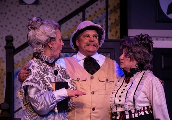 Spinster sisters Abby and Martha Brewster (Karen Brocker and Karen Pinomaki) have a new charitable hobbyhelping lonely old men to a speedy demise with a socko dose of poison in their homemade wine. Fortunately for them, their live-in nephew Teddy (Tim Setzer) believes himself to be Teddy Roosevelt and is happy to dig graves in the cellar, otherwise known as Panama, for each new "yellow fever victim." Teddy's brother Mortimer (Michael Coury Murdock), a well-known theatre critic, has developed a romance with Elaine Harper (Julianne Bradbury), who resides next door to the Brewsters with her minister father (Rick Love). By chance, Mortimer finds the latest victim, elderly Mr. Hoskins, temporarily stowed in the window seat, which leads him to interrogate his aunts, uncovering their nefarious activities that have dispatched twelve men so far. When the third Brewster brother, notorious criminal Jonathan (Michael Schaeffer), unexpectedly returns, bringing with him a crooked Dr. Einstein (Rose Roberts) and a dead body of his own, havoc ensues. Complications abound, the police get involved, but hey, it's a comedy and everything will sort outmaybe. Brocker and Pinomaki are spot on as the charming and determined Brewster sisters, equal parts dotty and shrewd. Bradbury combines a modern spunkiness with feminine wiles to aid Mortimer through the weirdness. Setzer does a delightful turn, thoroughly inhabiting Teddy and his delusions with inspired nuttiness. Murdock sometimes conveys Mortimer's urbanity, but often misses comedic chances and emotional peaks; it's hard to find him convincing. Schaeffer knows how to dominate, threaten and intimidate, slinking evilly about. Sometimes his booming vocals are almost too much for the Andrews Hall stage, but his villainy and depravity are complete, and manage to stay comic. Roberts mostly succeeds with a Peter Lorre impersonation, giving us a hapless, weary cohort in crime. The rest of the ensemble serve the story well, including Miles Ainley, Owen Hardesty, Rick Love and Zachary Stockton as amusing local constabulary, and Richard Romero and George Bereschik in small but memorable roles. Director Michael Ross rushes over some comic opportunities and can't avoid blocking issues entirely, but captures the tone and pacing required. An entirely black and white set by Michael Walraven and similar palette for costumes by Janis Snyder conceptually reminds us of a black and white film era, perhaps, but becomes less interesting over time. When bits of burgundy finally show up it's a welcome visual relief. Sound design by Jess Johnson enhances the action, and lighting by Courtney Johnson effectively creates darkness for action scenes. Wigs by Pamela Johnson look natural and attractive for the aunts and Jonathan, but one wonders why there is no wig for Dr. Einstein. Richard Pallaziol engineers excellent comedic skirmishes. If a chestnut needs staging, it's nice for it to get an enjoyable rendition in an entertaining main stage production, as this one does at Sonoma Arts Live. Arsenic and Old Lace, through February 10, 2019, by Sonoma Arts Live, at Sonoma Community Center, 276 East Napa St., Sonoma CA. Tickets $28.00-$40.00 can be purchased online at www.sonomaartslive.org or by phone at 866-710-8942. |