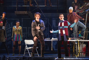With good reason, for despite its age (and the now-antique elements that firmly establish it as taking place in the late 1980s/early 1990spay phones, answering machines, HIV/AIDS as a near-certain death sentence, New York's Alphabet City as a crime-ridden ghetto instead of the more gentrified neighborhood it has become), Rent still packs a powerful punch, with music that is rhythmic and memorable and a cast of characters addressing timeless challenges: love, betrayal, greed, conflict between art and commerce, and the risks inherent in following one's dreams. Rent takes place, for the most part, in and around a warehouse loft being squatted in by Mark (Logan Marks), a budding filmmaker, and Roger (Joshua Bess), a wannabe songwriter and musician. Their building is owned by former roommate and friend Benny (Xavier McKinnon), who has reneged on his promise to let Roger and Mark live rent-free, and is threatening to evict them unless they pay the last year's rent. As an incentive, he cuts the power to the building, which jumpstarts the show as the band tears into the first big number of the night, the titular "Rent." Soon, friends, lovers and ex-lovers gather around Mark and Roger to fight, not just against Benny, but against commercialism, gentrification, HIV, mortality, and for art, love, life, and the family they have made for themselves. Rent has thrived in part becausedespite the many depressive elements of the storyit delivers a message of hope and resolve in the face of overwhelming odds. It's not just HIV that stands in their way, it's a system that works against them, it's the long odds that face any artist trying to find an honest expression of themselves that will resonate with an audience, and the ordinary pains of life and the many small disappointments and petty trials that come to most people, but especially those who attempt to live "la vie bohème." Despite all the curves life has thrown at them (and the unwise choices some of them make), the characters in Rent attempt to approach life in a way that is almost Buddhist. "There is no future," they sing, "there is no past." There is, in fact, "no day but today," one of the show's signature lines, and one that is perfect for today's audiences who may embrace the contemporary take on that sentiment: YOLOyou only live once. But that's easier said (or sung) than done. Life can be messy, chaotic even, with unexpected hurdles popping up along your path. Staying in the moment and remaining true to yourself and your dreams requires a constant struggle, and it's inspiring to watch a group of characterseven if they are unlike you in many waysembrace that struggle. Even when they lose, it's not for lack of trying. It's also inspiring to watch this talented cast living out their dreams as performers, and the energy and commitment they put into their work is clear in virtually every moment of this production. Their joy in performing is infectious, and director Evan Ensign has created an environment in which all are able to shine their own light. The set (by Paul Clay) is appropriately chaotic and colorful, true to a downtown, DIY, jury-rigged aesthetic, and the band led by Matthew DeMaria fills the cavernous Golden Gate Theatre with a huge sound that belies their small (just five pieces) size. This non-Equity touring company is in town for only a brief run, so if you love Rentor have never seen ityou have only a few chances to catch a terrific production of this groundbreaking show before they pack up their tent and move on to the next town. Rent, through June 23, 2019, at SHN's Golden Gate Theatre, 1 Taylor Street, San Francisco CA. Shows are Tuesdays-Thursdays at 7:30pm, Fridays-Saturdays at 8:00pm, Sundays at 6:30pm, with matinees Saturdays at 2:00pm and Sundays at 1:00pm. Tickets range from $56 -$225, and are available by calling the box office at 888-746-1799 or by visiting SHNSF.com. For more information on the tour, visit https://www.rentontour.net. |