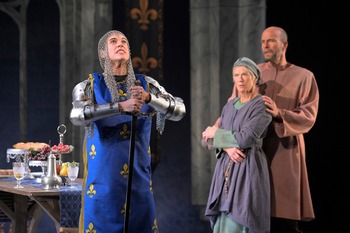 Although Joan is the prime focus of most (if not all) creative works about her life, here the main point of view is that of her mother, Isabelle. As lights come up, Isabelle is sitting in the Arcs' modest home, pulling burrs from wool in preparation for spinning, and telling us the basics of her life. Isabelle lets us know she's not naïve; she understands the fragility of life, having "barely shed a tear" when she lost a child in infancy, and that she "tries to be grateful." She's so prototypically maternal that it would be almost impossible for anyone who ever had a mother not to recognizeand smile ather instincts and her protective nature. When Joan comes in from a day tending sheep, and her mother confronts her with an accusation leveled by a neighbor, Joan confesses that the strange behavior the neighbor witnessed is due to visions she has been experiencing. Specifically, visions of St. Catherine. "Oh, she's a lovely saint," her mother gushesuntil she learns St. Catherine has been telling Joan her destiny is to lead France's armies into battle against the English, who have been crushing the French for decades. Who can blame a mother for not totally getting behind such a plan? Yet, because the Arc family lives in a world where saints are (mostly) accepted as completely real beings, and the pronouncements of clergy like local priest Father Gilbert (Robert Sicular) are taken as infallible dictates from God himself, off goes Joan to a noble's castle, accompanied by her brother Pierre (Brennan Pickman-Thoon), where both will add their numbers to France's army. In the courtbeautifully realized by scenic designer Sean Fanning as a framework of gothic arches suspended above a large sliding platformJoan becomes a bit of a superstar, especially after she leads troops to victory in her first battle. When mother Isabelle and father Jacques (Scott Coopwood) come to visit, they are treated royallydrinking mead from real glass mugs and sleeping in rooms with carpets and tapestriesand the play diverges into a bit of commentary on celebrity culture. Despite its being set around 1430, the language Anderson uses feels almost contemporary, which, rather than pulling us out of the time period, actually reinforces the universal nature of its message of the power of parental love. One could imagine a rewrite set in 2001 with a daughter feeling compelled to enlist in the armed services to fight Al Qaeda. The emotions, the anxiety, the commitmentit would all fit perfectly into Anderson's dramatic structure. In addition to the lovely set, Mother of the Maid benefits from a stellar cast assembled by director Jasson Minadakis. Fracher will touch your heart the way only a mother can and, with her final goodbye to her daughter, break it entirely. As Joan's father, Scott Coopwood is appropriately gruffuntil he delivers a touching monologue at the play's end that will take the pieces of your heart Fracher has broken and try to sew them back together for you. Rosie Hallett imbues her Joan with a fierce passion and a charisma that had me ready to armor up and join her quest. Robert Sicular, long one of the Bay Area's finest stage actors, uses his gorgeously resonant voice like Yo-Yo Ma uses his cello: sure, it's just vibrations moving through air, but through his mastery it becomes so much more than that. Brennan Pickman-Thoon further cements his position as a rising Bay Area stage star by treating us to a youthful exuberance that also, somehow, brings a level of gravitas to the role. For a parent, Mother of the Maid is not an easy play to watch, as we can all too easily empathize with the terror Isabelle Arc feels as her daughter is sent to the stake (even as she comforts and reassures her), but Marin Theater Company presents this fascinating play with elegance and powerdriving home its message with the requisite grace and tenderness to burrow its way deep into our hearts. Mother of the Maid runs through December 15, 2019, at Marin Theatre Company, 397 Miller Avenue, Mill Valley CA. Performances are Tuesdays-Sundays at 7:30 p.m., with matinees Saturdays and Sundays at 2:00 p.m. There is an additional "Perspectives" matinee on October 17 at 1:00 p.m. Tickets range from $25-$70. For tickets and information, visit marintheatre.org or call the box office at 415-388-5208. |