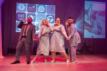 A Grand Night for Singing is a revue containing some three dozen songs by the legendary Broadway team of Rodgers & Hammerstein. The show was conceived by veteran director Walter Bobbie, who includes some R&H songs that have become standards ("Some Enchanted Evening," "Oh, What a Beautiful Mornin'," and "Shall We Dance?"), but also peppers the evening with lesser-known songs from the prolific pair: "All at Once You Love Her," "I Know It Can Happen Again," and "It's Me" (from Pipe Dream, Allegro, and Me and Juliet respectively.) The voices (especially those of Edu González and Alison Ewing) are strong and clear, and each performer clearly relishes the opportunity to dive so deeply into the catalog. And costume designer (and clearly multiple hat wearer) Cindy Goldfield has wisely put the cast in a range of muted grays that don't pull focus from the wide range of songs and moods. But the evening would have been a little bit dull without the projections by Cindy Goldfield, Richard "Scrumbly" Koldewyn, and Mark Mendelson. For each number, this troika created/assembled a set of images that reflect the mood of a song, its subject matter, or even a subtext to which the creators wished to call our attention. During "Surrey with the Fringe on Top," images of the fringe soon give way to images celebrating Hispanic car culture. "We Kiss in a Shadow" brings photos that call to mind the struggle for LGBTQ acceptance and visibility. "Stepsisters' Lament" brings a commentary on media images of feminine beauty. In addition to political/social commentary, the imagery often aims to draw a smile–as when the singing of "Wonderful Guy" from South Pacific is accompanied by photos of dogs, or knowing nods as "I'm Gonna Wash that Man Right Outta My Hair" addresses the ubiquity–and drawbacks–of dating apps like Tinder. 42nd Street Moon has created a delightful evening's entertainment, one that will bring a smile to your lips, perhaps a new thought in your head, and a song in your heart. 42nd Street Moon's A Grand Night for Singing runs through March 27, 2022, at the Gateway Theatre, 215 Jackson Street, San Francisco CA. Performances are Wednesdays and Thursdays at 7:00 p.m., Fridays at 8:00 p.m., Saturdays at 1:00 p.m. and 6:00 p.m., with matinees Sundays at 3:00 p.m. Tickets are $35-$76. For tickets and information, please visit 42ndStreetMoon.org, or call 415-255-8207. |