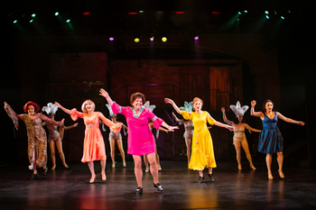 Follies tells the story of an epic reunion party hosted by Dimitri Weismann (Louis Parnell), a sort of stand-in for legendary impresario Flo Ziegfeld. Weismann was the producer of Weismann's Follies, an annual spectacle of showgirls and songs that ran between World War I and World War II. But in 1971, when the show is set, the theatre is scheduled to be torn down to make way for a parking lot. Now he wants to give the showgirls one more chance to see each other–and the decaying Weismann Theatre–before the wrecking crew begins its work. Follies begins with its feet firmly in the past: a bevy of showgirls (well, five) in gorgeous, sparkling, silvery-white leotards and opulent feathery headdresses and trains converge on the stage as the overture plays. These young women represent some of the characters who will soon appear as their much older selves when Roscoe (Frederic Winthrop), the Follies' emcee sings "Beautiful Girls" as the women enter, one by one, down a staircase at stage left. The heart of the story–and there's plenty of story, as well–is centered on two couples: Sally Durant Plummer (Natascia Diaz) and her husband Buddy Plummer (Anthony Rollins-Mullens); and Phyllis Rogers Stone (Maureen McVerry) and husband Ben Stone (Chris Vettel). Sally and Phyllis were best friends back in the day, as were Buddy and Ben. Ben has become a wealthy politician and philanthropist, while Buddy is a struggling traveling salesman. Neither of their marriages is what one would call ideal, for fidelity is a foreign concept to both men, and Sally and Phyllis aren't angels, either. But Diaz and McVerry are both terrific in their roles. Diaz's voice is rich and multi-layered, able to give us all manner of color and tone. McVerry, a Bay Area veteran, impresses not only with her voice, but also her acting skills, especially in the act one closer, "Could I Leave You?," her performance of which teases, cajoles and ultimately rages with passion. Rollins-Mullens' voice is so powerful and his phrasing so elegant, I'm shocked he's not a Broadway baby himself. Adding color and vibrancy to the proceedings are the other showgirls. Solange La Fitte (Jill Slyter) is a coquette who has a very French sense of superiority, which she expresses in the delightful song "Ah, Paris!" Hattie Walker (Lucinda Hitchcock Cone), a brassy dame with a voice to match–and a string of five ex-husbands–gets one of the best songs of the show, "Broadway Baby," and Cone delivers it with the energy and joy it deserves. Then there's Carlotta Campion (Cindy Goldfield), the showgirl who made it big in movies and TV, and she gets an even better song, the survivor's anthem "I'm Still Here." Goldfield, one of the Bay Area's greatest talents, does that rare thing: takes a song that's been done by some of Broadway's biggest stars (Carol Burnett, Elaine Page, Elaine Stritch, Christine Baranski, and Betty Buckley) and gives us her own personal take on the tune. The set, by Bill English (who also directs) and Heather Kenyon, is magnificent: simultaneously grand and dumpy, and situated on a turntable to reveal the action–and there's lots of it–going on backstage. English uses the flexibility of this set to full advantage, keeping the story rocketing forward. The first act, over an hour long, simply flies by. The costumes by Abra Berman are nothing short of perfection. The showgirls get the splashiest togs, but every cast member seems perfectly suited to what Berman has chosen for them–even helping us keep track of the couples through subtle matching of colors, as with Phyllis's brilliant solid yellow gown and husband Ben's yellow-patterned tie and pocket square.