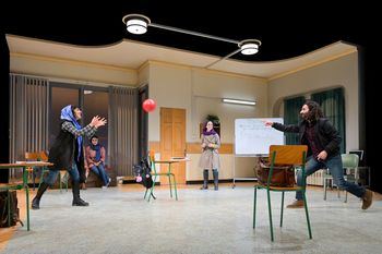 Each of the four has their own reasons for diving into the herculean task of learning a language notorious for its odd rules and pronunciations (e.g., bough, cough, tough–polish vs. Polish) and requiring them to learn an entirely new alphabet. Roya (Sarah Nina Hayon) has a son who has immigrated to "the Canada" and hopes to join him there. Elham (Mehry Eslaminia) has failed the TOEFL (Test of English as a Foreign Language) five times and must pass it before her acceptance at an Australian medical school can be finalized. Goli (Christine Mirzayan), the youngest, seems simply to enjoy the process of learning and has been fascinated by English since she was little. Omid (Amir Malaklou) is both the most and least mysterious of Marjan's students. Most mysterious because he is clearly the most proficient in English–when the students play a game where they must catch a ball, quickly speak a word from a category (kitchen items, say, or articles of clothing), then pass the ball to another student, he is usually the victor. Yet he is also the least mysterious because his agenda seems clear: to spend time with Marjan, an older woman who appeals to him on some level. Omid often stays after class to watch English language rom-coms with her, but the connection feels more maternal than sexual. Although the play is set in 2008 (according to the program), there are no indications of that in the text, allowing it to exist in its own timeframe. We know it's not pre-revolutionary Iran, since Marjan watches Notting Hill (which came out in 1999) with Omid, but other than that, we have few clues as to date, which allows Toossi to maintain focus on the characters and their individual struggles and leave all geo-political considerations outside the classroom. Although English lacks a strong central storyline and there is nothing connecting the characters other than their presence in the same class, each of Marian's students has their own character arc, some of which will lead to surprises–although the denouement for both Elham' and Omid's stories seem to exist as surprise for the sake of surprise, rather than something that is raised or hinted at in the early stages of the play. The greatest treat in the production is watching this cast at work. As Roya, Sarah Nina Hayon carries herself with an almost regal bearing. Her upright posture and gentle nature belie a ferocity and maternal entitlement that will reveal itself in the last third of the play. Mehry Eslaminia's portrayal of Elham is perhaps the most "actor-ly" of the cast, as her swings in mood and her fiery anger are the most pronounced. Yet Eslaminia is never guilty of chewing the scenery or overplaying her role; she maintains a razor-sharp edge. Christine Mirzayan is delightfully energetic and guileless as the young Goli, especially in the first scenes where she giggles her way through telling the class which form of her name she wishes to be called. Sahar Bibiyan plays Marjan with tremendous charm, revealing the joy she feels in her role as teacher but somehow manages to also show a sterner side when her pupils fail to meet her requirement of "English only" during class. Amir Malaklou's Omid is best in his scenes with Marjan, even if his reasons for wanting to spend time with her are never overtly stated. As the only man in the room in a male-dominated culture, he's never threatening, yet he manages to communicate his status as a rooster among hens with a delicacy that builds slowly over 100 intermission-less minutes. Director Mina Morita takes this talented cast and uses their skills to the fullest extent, guiding us through a world few of us have experienced (an adult school in Iran), while simultaneously showing us how frighteningly similar it is to experiences virtually all of us have had: the struggles and competitiveness of a classroom and the terror of not measuring up to a standard–either externally or internally imposed. English runs through May 7, 2023, at Berkeley Repertory Theatre, Peet's Theatre, 2025 Addison Street, Berkeley CA. Shows are Tuesdays at 8:00 p.m., Wednesdays at 7:00pm, Thursdays, Fridays and Saturdays at 8:00 p.m., with matinees Saturdays and Saturdays at 2:00 p.m. Tickets are $43-$119, with discounts available for students, seniors, and groups. For tickets and information, please visit www.berkeleyrep.org or call the box office at 510-647-2949. |