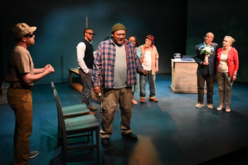 Coming home, Mikey discovers that he isn't the only person who has changed. His mother (Edris Cooper-Anifowoshe) has a new beau in her life, a rather seedy codger named Harris (played by Robert Ernst), and the house has the air of a hoarder's den. Though the set by Mikiko Uesugi, is very spare–a simple platform with steps on either end and space for baskets filled with props underneath–director Sheila Balter manages, via some clever stagecraft, to suggest a level of chaos. Mom, who has a reputation for being a tad profane at times, is now working for a church (which she rarely fails to mention) and has begun substituting "beep" or "beeping" any time she wants to swear, a technique that I believe might work better on the page than it does on stage. (Which brings me to a bit of explanation about the format of Word for Word's shows: true to their name, every word of a short story is spoken, including all the descriptions and indications of dialogue, but they are staged just as a play would be.) As the story goes on, Mikey discovers even more changes to the world he left behind. His ex-wife Renee (Lisa Hori-Garcia) has remarried and her new man, Ryan (Tre'Vonne Bell), is helping her raise Mikey's kids, plus a new baby. Soon Mikey learns–through the arrival of a sheriff–that his mother is well behind on the rent and about to be evicted. Her insistence that she "works for a church" has no effect on the sheriff, and the family is put out on the street. Though Home is a tough story about people going through hard times (at least Mikey and his mother and Harris–sister Renee and her husband Ryan seem to be doing just fine), director Balter and her cast are able to milk the satirical humor hiding in Saunders's text. Everyone seems to be thanking Mikey "for your service," so much so that it becomes (as it seems have become in our world) almost an automatonic response that tries to seem sincere but always seems to come across as lip service. Brennan Pickman-Thoon, who plays multiple roles, gives the ultimate unctuous delivery of the line as a clerk in a store selling a technological device of vague utility. There are some terrific performances here. Brian Rivera is able to present a calm demeanor (and the joy of homecoming), while still giving us glimpses of the regrets and rage that lie just under his calm mien. He has a bulk that is intimidating, but imbues his character with a manner that is (mostly) gentle. Edris Cooper-Anifowoshe is wonderful as Mikey's mother, presenting a woman who feigns confidence, yet whose face often shows the terror she must be feeling as her life begins to come apart. The sound design by Cliff Caruthers is fantastic, reinforcing the horrors of war (especially in the prelude scene of Mikey and his compadres on patrol) and generally enriching the story on multiple levels. Home is a brief evening of theatre (the show runs just over an hour), but it fills a lot in that short time, thanks to a skilled cast under the sure hand of a terrific director. Word for Word Performing Arts Company;s Home runs through April 29, 2023, at Z Space, 450 Florida Street, San Francisco CA. Performances are Wednesdays-Thursdays at 7:00 p.m., Fridays-Saturdays at 8:00 p.m., and Sundays at 3:00 p.m. There is also a 3:00 p.m. matinee on Saturday, April 22. Tickets range from $40-$65. For tickets and information, please visit ZSpace.org or by calling 415-626-0453. |
