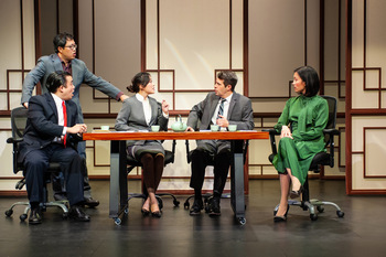 Fortunately for audiences who choose to see David Henry Hwang's Chinglish, now playing at San Francisco Playhouse under the skilled direction of Jeffrey Lo, all those possibilities for miscommunication are also opportunities for some terrific comedy. Add to that the fact that SF Playhouse has cast a brilliant group of actors, and you have the formula for an evening of hearty laughter. The core of Chinglish is the story of American businessman Daniel Cavanaugh (Michael Barrett Austin) looking to make a deal in Guiyang, a "small" city by Chinese standards–with a population of "only" four million. However, as Daniel learns from Peter (Matthew Bohrer), the British ex-pat consultant he has hired to help land a deal to make signs for the new Guiyang cultural center, the local custom is to be self-effacing and humble and allow others to sing your praises. The fact that Daniel is in the sign business (a family-run operation he took over after an embarrassing [to him] stint with a U.S. company famous for fraud) is an apt choice. For Chinglish is, at its core, a play about the clash of cultures as represented by the missteps that occur when translations are less than perfect. There are books filled with examples of mistranslations that may be hysterical to a western sensibility, and several wonderful instances are highlighted here. Part of Daniel's pitch is that he will help the local minister (an hysterically dour Alex Hsu) avoid embarrassment when, for example, the characters for "Handicapped Rest Room" become "Deformed Man's Toilet." When the minister's deputy speaks out of turn, her boss states, "The vice minister can be very passionate," but this is translated to Daniel as "She is a woman–she can be very emotional." The miscommunications are fodder for many of the funniest moments in Chinglish, but they would be insufficient to carry the comic load without the delightfully talented cast. Austin is wonderful as Daniel, a man grasping at a second chance for success after his stateside reputation was sullied by the criminality of his previous employer. His face shows the churning that is going on inside as his comments are misunderstood or mistranslated, each moment threatening to dismantle his plans. As Xi Yan, the minister's deputy, Nicole Tung has one of the juiciest roles, and slurps it up as lustily as a patron at a sidewalk noodle stand. In one scene she is the reserved underling, mostly stone-faced and revealing nothing, and in the next lays bare her own self-interested agenda with a saucy confidence. Bohrer is marvelously unctuous as the consultant ostensibly aiding Daniel, though his British accent occasionally slips southward into an Aussie twang. The entire ensemble, however, is perfectly balanced and in tune with each other. There is no miscommunication among them as actors, only as their characters. The set by Andrea Bechert is composed of a massive collection of sliding screens that smoothly aid the transitions and establish new settings. After two recent misses by the good folks at SF Playhouse (the rather clumsy musical take on Shakespeare's As You Like It and the silly in all the wrong ways Clue), I am heartened to see the return to their usual level of excellence. Chinglish runs through June 10, 2023, at San Francisco Playhouse, 450 Post Street, San Francisco CA. Performances are Tuesdays-Thursdays at 7:00 p.m., Fridays at 8:00 p.m., Saturdays at 3:00 p.m. and 8:00 p.m., and Sundays at 2:00 p.m. and 7:00 p.m. Tickets are $15-$100. For tickets and information, please visit www.sfplayhouse.org or call the box office at 415-677-9596. |