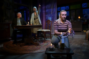 Helen and Elsa spend the first part of their time together catching up on the news. Helen talks about the controversy over the potential opening of a "bottle shop" (liquor store) and the uproar in the village–led by local minister Marius Byleveld (Victor Talmadge)–over this development. Elsa tells how, near the end of her 12-hour drive, she saw an African woman walking along the road, carrying a baby and a scant few belongings in a plastic bag. Elsa gave the woman a ride as far as she could, but the woman still had 80 miles of walking ahead of her. Elsa also mentions that she's in a bit of trouble with the school board for having the temerity to assign her students a 500 word essay on racism. She claims she'd love to stand up to the board and tell them "exactly what I think of them and their educational system." But she decides discretion is the better part of valor, and "as long as I'm in the classroom, a little subversion is possible." These stories seem to speak to the challenges the women face: the interference in their lives by the narrow-minded and the powerful, and the journey that lies ahead for each: Elsa's to discover her singular path, and Helen's to fight off the strictures of the Afrikaner culture–and keep the reverend Byleveld from talking her into taking up residence in the local old age home. What makes this production of The Road to Mecca so powerful is not just the large themes Fugard weaves in his text, but in the undeniably magnificent performances by this small cast, especially stage veteran Wendy vanden Heuvel as Helen. Her eyes are piercing–it's as though her glare alone could bore holes through the concrete creatures she constructs for her garden (owls and camels and wise men, all facing east) or even through the stone mesas surrounding the village. Jackman's Elsa is the equal to Helen, and Jackman plays her with an easy confidence that belies the doubts her character carries with her. Elsa has a mission on this journey, and she will let nothing stand in her way. As scene partners, the two have an easy familiarity with each other, a gentle, affectionate way of being that is almost sisterly in its closeness. Talmadge plays Marius with an undeniable sense of privilege and confidence in his convictions that make him an ominous, even frightening presence–despite his relatively gentle, "man of God" manner. Although The Road to Mecca can be a challenging drama, dealing with deep themes and hard truths, it is also a massively entertaining one, thanks in part to razor-sharp direction by Timothy Near (who also directed the equally amazing Master Harold ...and the Boys at Aurora Theatre a few years back), who keeps the kettle simmering–at least until it almost boils over.