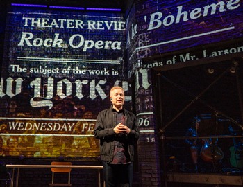 Theatre serves as a safe space to experience these kind of emotions. We can empathize with the characters on stage and even allow ourselves to feel what they are portraying in each moment. With the best live theatre, that empathy is a two-way street: those on stage seem to find a way to sense the audience's emotional state and use that sensation to inform their performance. So it is with Anthony Rapp's performance. As he tells his tale, over the course of about 85 minutes, he not only takes us back to 1994 and the first workshop of Rent, then to its Broadway opening, and onward into his mother's battles with cancer, it seemed Rapp had found a way to make each of us in the audience feel something deep and personal. By now I should probably be doing some of the critical stuff–talking about the taut five-piece band (led by Daniel A. Weiss), or the imagery (by David Bengali) projected on a screen upstage, or the rock show lighting (Eric Southern), or even that Rapp doesn't have a stellar voice or perfect pitch. But that doesn't seem terribly important in this moment. Because as Maya Angelou said: "people will never forget how you made them feel." So when I heard Rapp tell of his mother's suffering–brave and graceful and stoically midwestern–it raised memories of my own mother's passing that caused tears to wet my cheeks. I could hear audible sobs from the woman in the seat behind me, and quiet sniffling throughout the Curran. It's not all tears, though. Rapp takes us inside the early days of Rent: the song the cast learned first ("Seasons of Love"), his first encounters with the saucy Daphne Rubin-Vega, and sharing reviews with his mother. He recalls when Jonathan Larson, not long before his sudden passing, told him, "You are going to bring my friends to life - and I want to thank you for that." By the time those 85 minutes (a very small portion of 525,600) are over, you might want to thank Anthony Rapp for bringing his experiences to life in a way that just might illuminate a part of you to which you hadn't been paying attention, or–better yet–remind you that you're not alone in whatever grief you happen to be carrying. Without You runs through October 22, 2023, at the Curran Theatre, 445 Geary Street, San Francisco CA. Tickets range from $49-$160. For tickets and information, please visit BroadwaySF.com or the Curran box office.