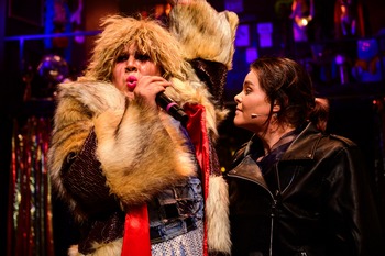 Hedwig is then taken to Kansas, where the marriage quickly falls apart, leaving Hedwig divorced, living in a trailer park, making ends meet by babysitting and doing "those jobs we call 'blow'." She writes an album's worth of great songs, which are then stolen by the boy she was babysitting, who becomes an arena-filling rock star (named Tommy Gnosis) on the back of her genius, while Hedwig and her band, The Angry Inch, end up playing dives like a Sizzler in Junction City, Kansas, or the Ashby Sit 'n Spin, the venue created inside the Ashby Stage (in a wildly graffitied, punked-out set by Carlos Aceves.) Tragedy, right? Well, not so fast. Because, despite all the horrors–perhaps most especially that soon after Hansel becomes Hedwig and leaves Berlin, the Wall comes down and Hansel could have left home intact–Hedwig and the Angry Inch manages to be joyous and life-affirming. Part of this joy comes from the songs, a mix of punk, hard rock, pop, power ballads that howl with rage, irreverence, and righteous anger. The sad tale becomes life-affirming because, despite being victimized–by Luther, her mother, and the fates–Hedwig never feels like a victim. Even when she bemoans her circumstances, treats her husband Yitzhak (Elizabeth Curtis) with haughty disdain, or screams out the door at the sounds coming from a nearby Tommy Gnosis concert, Hedwig carries herself with the strutting confidence of someone who has come to accept who she is and doesn't really care what you think about her. As Hedwig, Colter has the swagger, but she may embrace the joy of the role a bit too much. Hedwig throws shade like a pro, but Colter lacks the bitter edge that I've enjoyed in the previous four performers I've seen play the role (John Cameron Mitchell, Neil Patrick Harris, Darren Criss, and Coleton Schmitto). The bitterness gives the humor its bite, and in no way detracts from the joyous egoism the role requires. In addition, although Colter has a strong belt, she had some trouble with breath control, especially during the first half of the show, and her comic timing was often out of tune with the text. Giving some moments even half a beat more would increase the impact of the many great lines written by John Cameron Mitchell. (Music and lyrics are by Stephen Trask.) Elizabeth Curtis has a great time as the put-upon second fiddle, and her delicious singing voice is a marvelous backup to Colter's growl. When she lets loose on "I Will Always Love You" (which is in the show only to be mocked), I felt the audience sit a little straighter in their seats at the technical skill she shows. The costumes (Kip Yanaga) are a show in themselves–especially Hedwig's pieced denim mini-dress and half faux-fur, half faux-leather floor length coat with a bloody stuffed animal sewn below the back collar. But the real star of the show is the four-piece Black Dyke Rock Band, composed of Shelly Doty and Katie Cash on guitars, Vicki Randle on bass, and Kofy Brown on drums. These women play like rock is a dose of medicine you need to survive and they are committed to making sure you get top-notch treatment, no deductible required. Although I'd rank this Hedwig as the weakest of the five productions I've seen, the show itself is wonderful. Director Richard Mosqueda's artistic choices feel right in tune with the grungy, queer aesthetic of the show, so I'm hopeful that after a few more performances, the cast will find the rhythms required to tell this tragic (but somehow upbeat) story with both the joy and bitterness is requires. Hedwig and the Angry Inch runs through December 17, 2023, at the Ashby Stage, 1901 Ashby Avenue, Berkeley CA. Performances are Wednesdays and Thursdays at 7:00 p.m. (except Thanksgiving - show that week is Tuesday the 21st at 7:00 p.m.), Fridays and Saturdays at 8:00 p.m. and Sundays at 5:00 p.m.. Tickets are $28-$49. For tickets and information, please visit www.shotgunplayers.org. |