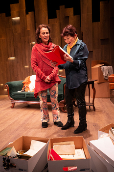 Miriam and Esther grew up in Berkeley with their beloved father, a concert pianist, and their mother, an opera singer. But when dad dies of cancer, mom finds a new husband, Heinrich, a Jewish émigré from Nazi Germany who made a fortune in his adopted country, and the family moves to New York's Upper West Side. For Miriam (Ellen Brooks) and Esther (Janet Roitz), who are somewhat estranged from each other, the process of sorting through the detritus of their stepfather's life (at least what is left after his widow has picked over everything–"she took the Spode!") is a chance for the siblings to reconnect and perhaps settle some old scores. Like an art historian who has discovered a second painting underneath a more recent one, playwright Andrea Gordon has done a marvelous job of gently peeling away the layers of sibling rivalries, regrets and recriminations. There is only a little anger on display here; rather, Gordon has wisely chosen to make the digs (mostly delivered by Miriam) more subtle and polite on the surface, belying the tension underneath. At first, Miriam says Esther can have anything she wants, but each time she makes a request, Miriam replies, "Except that." Esther mentions a ring their mother wore, and Miriam holds out her hand to show she's wearing it. "I never take it off." She offers the ring to Esther, then says coyly, "Oh look–it won't come off." Esther makes her own attempt at a subtle barb when Miriam discovers letters written in German. "I'm fluent," Miriam says, and Esther replies "Well, I know Spanish, which is much more useful." As they work, the sisters help themselves to the liquor left behind, Miriam imbibing quite a bit more than Esther. "That's the magic of being an alcoholic," she says when Esther suggests it might be a little early in the day to get tipsy: "It's never too early, never too late." When ghosts come out of the woodwork–first mother (Merrill Grant), then, much later, father (R.P. Welsh)–it's almost as if they are memories come to life, rather than specters. The ghost mother appears, singing an aria ("O Mia Babbino Caro," from Puccini's Gianni Schicchi) and fluttering around Esther–but never touching her–as she places items in various boxes and garbage bags. Yet when mother appears again, this time to Miriam, she seems visible, as Miriam touches, strokes, and hugs her as she sings, intimating a deeper connection to her mother than Esther has. Over the course of 100 minutes or so, long-buried secrets are brought to the surface, some old tensions are resolved, others will continue to fester, but the experience ultimately heals enough wounds that it seems clear the sisters will be more connected in the future. The set by Nina Ball works nicely, giving the impression of both wealth and chaos. Playwright Gordon also directs, and though the blocking is sometimes a little stiff and unimaginative, she keeps the action moving briskly. The acting is uneven at times: moments when a little vitriol might be called for seem to fizzle, and the chemistry between Miriam and Esther is lacking to such a degree that we don't get a real sense of these two as siblings; they come across merely as actors portraying siblings. Ultimately, however, the voyeuristic thrill of watching Miriam and Esther in their most vulnerable moments makes Miriam and Esther Go to the Diamond District a surprisingly successful immersion into one family's odd dynamics. Miriam and Esther Go to the Diamond District runs through January 28, 2024, at Magic Theatre at Fort Mason, Two Marina Boulevard, Building D, 3rd Floor, San Francisco CA. Performances are Wednesdays-Saturdays at 8:00 p.m. and Sundays at 3:00 p.m. Tickets range from $30-$50. For tickets and information, please visit MiriamandEsther.com, call 415-441-8822, or visit the box office, which is open Monday-Friday from 10:00 a.m. to 5:00 p.m., and on Saturday one hour prior to curtain. |
