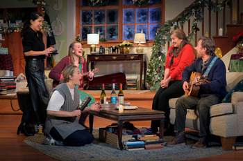 Despite the strictures of their upbringing, the kids seem to have strayed far off the path of righteousness, at least as determined by the elder Dahls' faith. Johnny, the youngest (and always last to arrive for Christmas celebrations), is a recovering heroin addict who has brought along one of his AA sponsees, Loren (Vero Maynez), who is 126 days clear of an Oxy addiction. "What's Oxy?," one of the siblings asks. "It's heroin you get from the doctor," Loren replies. Then there's Mark (Lucas Near-Verbrugghe), who has never quite lived up to his parents' expectations (after Harvard Law and a Supreme Court clerkship, he took a quiet government job) but still maintains a faith in God, while also claiming he's "not a Christian anymore." Evie (Virginia Kull) may have veered furthest from the path her parents set for her: she's a lesbian who has recently married Pippa (Cass Buggé), who is expecting the couple's first child. The only child who seems to have retained her faith is Diana (Kerstin Anderson). She has, in fact, more than retained it–she has turbocharged it, claiming to be a channel through which God speaks, which leads to some uncomfortable exchanges with Evie when she tries to convince her gay sister that "I know the spiritual truth that this is not what God wants for you." The cast is uniformly excellent, playing off of each other like members of a tight, well-rehearsed band. Which is fitting, as the family is a musical one, and the show is filled with music. Dad plays piano, as does Johnny, Mark plays guitar, Evie's ax is the ukulele, and they all sing quite well. But the real star here is the teaming of playwright Leslye Headland and director Trip Cullman. Headland's script is dense with humor, insight, pathos, and a deep understanding of how families communicate. It can be too dense at times, with multiple characters speaking over each other–which got me thinking how interesting this play would be if it were an immersive, interactive theatrical experience, where the audience could move from room to room, watching dad work out his anger in the kitchen all by himself, or to go upstairs with Evie and her husband James (Christopher) to check on their crying baby, or to walk around the dining table once dinner has been served (after Johnny finally arrives) and pick up on all the individual conversations happening. Cullman has made great use of an amazing set, by scenic designer Arnulfo Maldonado, that re-creates a quintessentially middle-class American home at Christmas. We see the entire downstairs: living room with fireplace, staircase upstage, dining room and kitchen stage left, and frost-covered windows with a gentle snow falling outside. There's always action somewhere on stage, and Cullman–in collaboration with his cast–has made every interaction feel like true dysfunctional family dynamics. The hugs, the turnings aside, the retreats to either side of the house–it all feels like you're watching a real family in crisis. And with addictions (mom fills a punchbowl with Manhattans!), zealotry, spousal bickering, and long-simmering tensions coming to the fore, it's a non-stop crisis–that also happens to be very funny. When Loren, the newcomer, brushes off the family's spatting, saying "I OD'd last summer, so this is pretty tame," mom Ginny immediately quips back, "Give it time." Despite the very naturalistic humor–no setup/punchline jokes here–there are some wonderfully deep insights, as well. When she is asked about her feelings on God, Loren, the recovering addict, states that she can "get the idea of a higher power. Like gravity." She then goes on to explain how she sees its effect, may not understand fully how it works, but likes that it doesn't try to shame her. And there is a blistering moment when Rachel, Mark's wife who converted from Judaism for him, tells Diana and James "On the day of judgment, you will see. He will not know either of you." Over its 100-minute, intermissionless running time, Cult of Love manages to cover a wide range of family dynamics, both the good and the bad. In one moment, the kids will be spatting with each other or with their parents, and then someone will pick up a guitar or sit at the piano, and suddenly the family is united in song, each playing their own important part–culminating at the show's end with a gorgeous close-harmony rendition of "Shenandoah." It's a heartwarming end to a heartrending comedy about a family struggling to stay one. Cult of Love runs through March 3, 2024, at Berkeley Repertory Theatre, Roda Theatre, 2015 Addison Street, Berkeley CA. Shows are Tuesdays, Thursdays, Fridays and Saturdays at 8:00 p.m., and Wednesdays at 7:00 p.m. Matinees are Saturdays and Sundays at 2:00 p.m. Tickets range from $22.50-$134. For tickets and information, please visit www.berkeleyrep.org, or call the box office at 510-647-2949. |