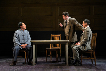 Suh's tale begins in 1910 when Gee (Feodor Chin) applies for birthright citizenship, claiming he was born in San Francisco to Chinese parents. Now working in a Chinese laundry, Gee wants citizenship so he can return to China to see the family he created during previous visits, and not worry about being turned away at the border because of the Chinese Exclusion Act which, beginning in 1882, denied entry (let alone citizenship) to any Chinese. The challenge for Gee as he faces rigorous questioning from the interrogating Inspector (understudy Aaron Wilton) is that he has no paperwork to back up his claim, as all his papers were lost in the fire that followed the 1906 San Francisco earthquake. All the city's birth records were destroyed, as well, so the only hope Gee has is his sincerely rendered claims of honesty. Complicating matters is the fact that many Chinese men took advantage of the conflagration to claim having been born in the United States. The Inspector is fully aware of this, explaining to Gee that, given there are so few Chinese women in America at that time, each of them would had to have borne at least 20 sons to account for all those applications. The stakes are high for Gee but they will go much higher after he ultimately charms the Inspector–with a little help from the Interpreter (Whit K. Lee)–into granting his request. (A note on interpretation: as the Inspector grills him, the Interpreter repeats everything the Inspector says, but in English, not Chinese. When Gee confesses he knows a little English, he speaks in heavily accented, somewhat-broken grammar. We know when he switches back to his native tongue, because he speaks directly to the Interpreter in unaccented, perfect English.) Without spoiling the surprises Suh has suffused throughout this work (which was a finalist for the 2023 Pulitzer Prize for Drama, and to my mind should have won), Gee uses his newly won citizenship to begin a cycle of exploitation of impoverished Chinese that will ultimately result in Gee beginning his own modest dynasty in America. The play–directed with energy and grace by Jennifer Chang and acted with tremendous skill by a wondrous troupe–is a marvel of elegant storytelling. The stakes continue to rise as each scene unfolds itself. The tension is intense for Gee, but it's even higher for Moon Gyet (Tommy Bo), whose mother (Tess Lina) goes deep into debt to have Gee take him back to America, posing as his son. Despite a final scene that might play a touch too long, this production is near perfection. Everything works–the set (by Wilson Chin) is glorious: a flat wall upstage that is a projection surface (for designs by Hsuan-Kuang Hsieh), yet also slides to reveal the farm where Moon Gyet and his mother live. A few chairs, a table, and scores of file boxes reinforce the sense of claustrophobic bureaucratic passage Gee and his pseudo-family must navigate. The choreography created by Erika Chong Shuch isn't quite dance, but it's something much more than simple blocking, and adds to the feeling of endless, chaotic waiting those awaiting processing on Angel Island must endure. There is poetry in Suh's script, both his own and that of immigrants who were interned at the Angel Island Detention Center, and carved their poetry in Mandarin on the walls. (Authorities puttied and painted over the poems, but as the center aged and the putty shrunk away from the concrete wall, they were rediscovered, in 1970, and can be seen today, as the Center has been converted into a museum.) In one especially moving moment, Moon Gyet is asked by his interrogators about what details he had been warned the government might ask of him, and he launches into a litany of items both mundane and sacred that feels very much like a poem itself. The Far Country is so rich, its characterizations so detailed, and its dramatic arc so beautifully rendered, that it's one of those plays you could see several times and still not be able to take it all in. At the end of his life, Gee, being attended to by his faux son's wife Yuen (Sharon Shao)–who feeds him soup I swear you could smell in the theater!–becomes a little forgetful, and delivers a line that will break your heart: "Sometimes the memory is sadder than the forgetting." I for one will remember The Far Country for a long, long time. The Far Country runs through April 14, 2024, at Berkeley Repertory Theatre, Peet's Theatre, 2025 Addison Street, Berkeley CA. Shows are Tuesdays at 8:00 p.m., Wednesdays at 7:00pm, Thursdays, Fridays and Saturdays at 8:00 p.m., with matinees Saturdays and Saturdays at 2:00 p.m. Tickets are $22.50-$134, with discounts available for students, seniors, and groups. For tickets and information, please visit www.berkeleyrep.org or call the box office at 510-647-2949. |