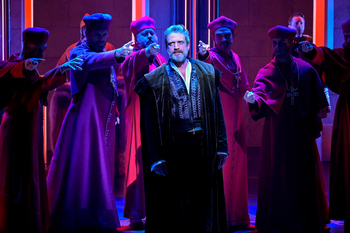 Now we have another chance to see a show that may very well find its way to Broadway, for director Michael Mayer (who also helmed American Idiot and Swept Away) leads the creative team behind a new rock musical about the life of Italian mathematician, astronomer, and inventor Galileo Galilei, entitled simply Galileo. Spectacularly staged in its world premiere in Berkeley Rep's Roda Theatre, the story of one of the world's greatest minds, thwarted by the Catholic Church yet still managing to engage in some of history's most important scientific inquiries, is set to a thrilling rock score by Michael Weiner and Zoe Sarnak. As the show opens, with an illustration of the Earth-centric view of the universe projected on a scrim, we hear the sound of chimes or bells followed by chanting, reinforcing the ubiquity of the Church in the lives of the characters who will populate the stage. We then see the inquisition of scientist Bruno Giordano (Adam Halpin), who refuses to recant his belief that Christ was not divine, Mary was not a virgin, and that transubstantiation (the miraculous transformation of the communion host and wine into the actual body and blood of Christ) was not really a thing. Giordano was burned alive for this heresy, and the scene helps establish the stakes for Galileo (Broadway veteran Raúl Esparza), whose observations had led him to believe in the veracity of the Copernican, heliocentric model of the universe, which contradicted the established Aristotelian/Ptolemaic theory that placed the Earth at the center of the universe, an unmoving orb around which the planets, the sun and all the other stars orbited. A view, importantly, also held by the Church, who charged anyone who suggested otherwise with heresy. Fortunately for Galileo, he has an ally in the Church–Bishop Matteo Barberini (a brilliant Jeremy Kushnier), who will soon rise to the rank of cardinal and then become Pope Urban VIII. Also standing by Galileo's side is his daughter, Virginia (Madalynn Mathews), in love with Alessandro Tarantola (Christian Magby) but unable to marry due to her being illegitimate and Galileo lacking the funds for a dowry that would overcome the challenge of her out-of-wedlock birth. Despite a running time of about 2.5 hours, the show rockets along, thanks to Mayer's skilled direction, a compelling score, and a story of the enmity between science and religion that persists to this day, making this story of 17th century characters as timely as ever. As Galileo, Raúl Esparza is nothing short of staggering. His voice, already wondrous when I first saw him perform live in Sondheim's Company in New York as Bobby, has somehow expanded in power and precision. It cuts through the Roda Theatre just as Galileo's truths sliced through the hypocrisies of the Church and its leaders. Although Galileo was deeply committed to his Catholic faith, he was just as committed to the hope his work could "create a true partnership between science and religion." A lovely idea, but one that his ally, Pope Urban VIII ultimately dismisses, saying "in science, facts are constantly changing, while scripture is constant," conveniently ignoring one of the key aspects of the scientific method: the willingness to adapt to new ideas as the method reveals them. Or, as Galileo says, "a new idea can act as a shining star to guide us." Esparza is well-supported by the rest of the cast. He and Jeremy Kushnier, who plays the bishop who becomes pope, have a delightful chemistry, and Kushnier's voice blends gorgeously with Esparza's tenor. Esparza also pairs well with Madalynn Mathews, their work showing a tenderness combined with authority that often marks a father-daughter relationship. Every aspect of this production is spot-on. The set, by Rachel Hauck, is appropriately massive, even forbidding, and the projections created by Jason H. Thompson and Kaitlyn Pietras show us not only a starry sky, but animate notebooks filled with drawings and calculations made by Galileo. The band is tight, precise, and rocks the room. Sound design by John Shivers is nothing short of perfection: every word can be heard clearly, and though the performers are mic'd, it still manages to feel as if we are standing next to the cast as they sing their hearts out. Sadly, in our current political environment, truth doesn't seem to carry the same weight it once did. But here's one true thing: if you skip this production of Galileo, you will miss something compelling, powerful, even magical. Or you can wait until it transfers to New York. But why? See it now, save the airfare, and you can say you saw it when. Galileo runs through June 23, 2024, at Berkeley Repertory Theatre, Roda Theatre, 2015 Addison Street, Berkeley CA. Shows are Tuesdays and Wednesdays at 7:00pm; Thursdays, Fridays and Saturdays at 8:00pm. Matinees are Saturdays and Sundays at 2:00pm. There are additional matinees on May 23 and June 13 at 1:00pm. Tickets range from $22.50-$145. For tickets and information, please visit www.berkeleyrep.org, or call the box office at 510-647-2949. |