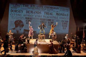 Take the case of Leo Frank, whose tragic story is played out in the musical Parade in a way that is thrilling yet heartbreaking and, importantly, magnificently staged. The 1998 show (with music and lyrics by Jason Robert Brown and a book by Alfred Uhry and which won Tonys for Best Book and Best Original Score) was restaged in 2023 and received the Tony for Best Revival of a Musical; its touring production has made its way to San Francisco for a run at BroadwaySF's Orpheum Theatre. Although the musical takes some liberties with Frank's sad tale–as it must to fit within the confines of a 2.5 hour (with intermission) running time, the incredibly talented cast play the roles of real historical figures. Projections and occasional titles help to ground the show in the cruel realities of the Frank case. If you are unfamiliar with the story, it concerns a young man who grew up Jewish in Brooklyn, received a degree in Mechanical Engineering from Cornell, then moved to Atlanta, Georgia to become the superintendent of the National Pencil Company factory, in which his uncle was a major shareholder. In the early morning of April 27, 1913, 13-year old factory worker Mary Phagan was discovered murdered in the basement of the factory. Although initial suspicion fell on two Black men–the factory's night watchman and a janitor–the police ultimately arrested Leo Frank. Soon after he was indicted, tried, convicted, and sentenced to death. After appeals failed, the governor of Georgia commuted his sentence to life imprisonment, but this was not enough for the people of Georgia, and on August 16, 1915 a mob broke into the jail where Frank was being held, and lynched him. If all this sounds like massive spoilers, you'd be right. But since there is an image projected (on a screen upstage in Dane Laffrey's spectacularly realized set) of an historical marker at the site of the lynching that lays out many of the details of the event, I'm not really giving anything away. Knowing the story's sad conclusion does not detract a whit from the brilliant performances and amazing musicality on display here. Jason Robert Brown's score, while generally devoid of any truly hummable tunes, is nonetheless stirring, at times anthemic, sweetly (and sadly) melodic at others, and the orchestra and wonderful chorus fill the Orpheum with a rich sonic aura. Uhry's book tends to gloss over many of the details of the case–during the onstage trial of Frank, there is no cross-examination of witnesses, nor any defense presented; all we see are the prosecution's assertions and the testimony of witnesses who were allegedly coached by the prosecution. What makes the show most compelling–in addition to the wondrous set and projections–is a cast of stellar performers in each and every role. Max Chernin looks eerily similar to the real Leo Frank, but I'd be surprised to the point of fainting if the real Leo could sing with anything close to the power and gorgeous tonality Chernin brings to the stage. As written by Uhry, Leo Frank isn't especially likable–he's a bit chilly and somewhat dismissive of others. He's slight of build, but carries himself with a certain amount of intellectual swagger. "This is wrong, this is wrong, I can fix this," he mutters as he examines some figures, and it seems to reflect his general approach to life. Sadly, however, there is one thing he can't fix: the anti-semitism and fear of outsiders, especially Yankees, especially Jewish Yankees. Chernin is surrounded by other skilled performers. Talia Suskauer, who plays Leo's wife Lucille, has a sweet soprano that floats through the air as though on silken threads. In the minor role of Frankie Epps, newcomer Jack Roden has an easy yet powerful grace when he moves on stage; I'd love to see him in a role that requires him to show off his clearly top-notch dance moves. The chorus that backs the leads is equally terrific, with strong voices that fill the Orpheum to the very back of the house. Director Michael Arden has filled this production with dozens of tiny touches that might go unnoticed, but nevertheless add to the feelings of ostracism and injustice. Often when the Black characters are onstage, especially in the courtroom, the white characters stand with their backs to them. And during intermission, when the rest of the cast leave the stage, Chernin as Frank remains on the platform at center stage that represents his jail cell, reinforcing his imprisonment. The murder of young Mary Phagan remains unsolved (although the state of Georgia has an ongoing investigation into it), but this production of Parade is like a mirror held up to the racism, anti-semitism, and political power plays that cost one outsider his life. It's a sad story to be sure, but don't turn away from it or you will miss some of the best musical theatre of the year. Parade runs through June 8, 2025, at BroadwaySF's Orpheum Theatre, 1182 Market Street, San Francisco CA. Performances are Tuesdays-Saturdays at 7:30pm, and Wednesdays, Saturdays and Sundays at 1:00pm. Tickets range from $69.03-$260.91 (limited $49 orchestra seats are currently on sale). For tickets and information, please call 888-746-1799 or visit broadwaysf.com. For information on the tour, visit paradebroadway.com/tour |