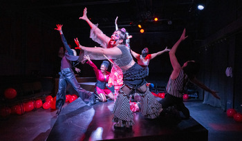 In the very first song, "Wilkommen," the Emcee (a delightfully edgy Deanalís Arocho Resto) tells us to "leave your troubles outside," for "in here, life is beautiful." In the second number, "So What?," Fraulein Schneider (Beth Wilmurt) takes newly arrived writer Clifford Bradshaw's (James Mercer II) offer of 50 marks for a room she rents in her boarding house, even though she wants 100, because "the sun will rise and the moon will set and you learn to settle for what you get." In "Mein Herr," Sally Bowles (played with a delightfully ingratiating air by Sharon Shao) tells men in general to take her for what she is ("a tiger is a tiger, not a lamb") and make no attempt to change her. The haunting "Maybe This Time" has Sally once again accepting her fate, though holding out hope, however meager, for a different outcome. Then, near the finale, the Emcee and the cast tell us "I Don't Care Much": "Go or stay–I don't care very much either way." One of my favorite films is Groundhog Day, in part because of its message. Bill Murray's character Phil ultimately finds love only after he embraces his full, true self. Because, after all, since time is limitless for him, he might as well. But the film tells us that we should all embrace our full, true selves because the opposite is true: our time on this planet is limited. I feel the same about Cabaret: its core message is not to escape to a fantasy world, but to instead take action against fascist/authoritarian attempts to subvert democracy and spread hate. Though the show revels in escapism, in its final moment, Cliff takes action–beginning to tell the story of his time in Berlin as a cautionary tale. With that diversion of critical analysis out of the way, let's move on to this production, which honors the show's subtext and vital themes more faithfully than any production I've seen. The last show I saw at Oakland Theater Project was a powerful production of I Am My Own Wife. If you are unfamiliar with that play, it tells the story of a trans woman, Charlotte von Mahlsdorf, who survived both the Nazis and the communists in East Berlin, and created a safe (relatively) space for queer people in the basement of a house she commandeered for herself. I like to think of this production of Cabaret as taking place inside that basement, populated by a wildly diverse population of queer folks and society's rebels. Because of some illnesses in the cast in the week leading up to opening night, it was actually the first performance in front of a live audience, but you wouldn't know that from the way the show went off seemingly without a hitch, and the cast performing the often-intricate and quite imaginative choreography (by Erika Chong Shuch, who is also the director) without putting a foot wrong, and by the overall excellence of the production. Oakland Theater Project stages most of its shows in this small, black box space that occupies a room off the cavernous warehouse of an art supply store, and set designer Sarah Phykitt has created an immersive environment consisting of a series of platforms that step down in a sort of multi-level runway/thrust which the audience surrounds on all four sides. Upstage and right, the highest platform is where the "orchestra"–a DJ and a single guitarist (Joshua Pollock, who does double duty, also playing the role of Herr Schultz, who, true to the show's theme, blithely dismisses the Nazi threat). Part of me missed the richness of the score as played by a more well-equipped band, but given the relatively large cast–and the shoestring budget OTP operates on–it was easy to put that disappointment to the side and just enjoy the tremendous work on display here. There is so much to love about this production and very little to dislike. Perhaps the voices are not of the powerful, belting nature one might find in a Broadway production, but in Isherwood's novel "Goodbye to Berlin" that was part of the inspiration for Cabaret, the club was a rather seedy place and Bowles was no Liza Minnelli. The costumes (by Ashley Renee) are gloriously diverse, a delightful melange of colors and patterns tied together by a rather punk sensibility. To a person, the performers are never less than fully committed to their roles, and a wonderfully queer air pervades every moment of the show. Beth Wilmurt is wondrous as Fraulein Schneider, the "spinster" landlady who once led a life of luxury but has been reduced to taking in borders. When it comes time for her to sing "So What?," a keyboard suddenly appears and she sits down and plays. She then turns into a ukulele player for the delightful "It Couldn't Please Me More (A Pineapple)," and it turns out to be a perfect accompaniment for the tune. James Mercer II has perhaps the most challenging role, for in the midst of all the fishnet/leather/edgy makeup design queerness of the rest of the characters, his Cliff is the white bread accompanying a spicy stew. But he manages to show his range, especially in later scenes when he realizes the threats the Nazis represent and the heartbreak he feels when Sally abandons him. Ije Success plays prostitute Fraulein Kost with a bitchy, oversexed tawdriness that feels just right for the character. Director Erika Chong Shuch seems to have called on every aspect of her imagination to create an environment that reflects the core nature of the source material. She directs her cast to writhe and slither and scream and soar and generally make every moment special in its own way. She begins "Maybe This Time" as a solo number, as it is usually performed, then modulates it into a duo, then a quartet (with Fraulein Schneider and Herr Schultz), and finally a septet. When Schneider and Schultz announce their engagement, she has the cast lift the bride to be on a chair, calling to mind a tradition of celebration at Jewish weddings, reminding us of the threat German Jews faced. The show is set both in Weimar-era Germany and the present day–something the director most cle