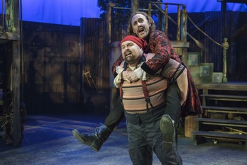Christopher Fitzer has created a fenced-in, run-down, neighborhood playground one might see in the projects where kids themselves have built pieces of it through the years. Weathered-wood structures resembling jungle gyms and tree houses; a swinging bridge, seesaw, and rope swing; and many nooks and crannies where toy trucks and old trunks have long been abandoned become the stage and props for the enthusiastic, energized cast. Director Jeffrey Lo orchestrates the story's telling in such a way that it often feels there is no script but that these kids are making up the story as they go, based on something they have heard others tell in the past. Their tale begins in England in 1885 where two ships are about to leave for some faraway kingdom called Rundoon. Lord Aster is set to sail on the Wasp, the fastest ship in the British fleet, to deliver a trunk with precious cargo for her Majesty, Queen Victoria ("God save the Queen," the entire cast chimes). Because he knows this is a dangerous journey, he sends his thirteen-year-old daughter Molly and her devoted nanny Mrs. Bumbrake on a slower ship, the Neverland. Unbeknownst to him, the crooked captain of the second ship switches an identical decoy trunk (one full of sand) for the one full of supposed treasure and loads it onto the Neverland. Along with Molly and her nanny, he also loads on three orphan boys, sold to him by a wicked schoolmasterboys he means to deliver to the King of Rundoon to be fed to a snake-monster. Those boys (Ted, Prentice, and a no-name boy the others call "Mule") are locked away in the ship's boughs as "pigs," to be fed live worms. Fortunately for them, an adventurous and always curious Molly will discover the boys, becoming instantly their "mother" who will feed them well and tell them their first-ever bedtime story. (Are you beginning to pick up future, Peter Pan references?) The switch of the two trunks becomes a surprise at sea for members of the Wasp's crew, who turn out to be pirates, there to capture the treasure. That their leader Black Stache is decades late to be as world famous as, say, his namesake of sorts, Blackbeard, is just the beginning of his bumbles and stumbles. After discovering the mix-up of trunks, he and his loyal sidekick Smee set course in the faster ship to overtake in speed and then by force, the Waspsetting up a tall tale of adventure that any boy might relish but one that stars as the hero, a girl named Molly. As the high seas tale unfolds amidst hurricanes and ships breaking apart, father and daughter communicate in the language of extinct dodos via a magic amulet each wears. The amulets, like the trunk now on the Wasp, contains "star stuff," bits of falling stars that have landed on earth and have the magical powers to fulfill any wish, for good or evil. They are two of six-and-a-half "Starcatchers" in the entire world (Molly being the half), whose job now is to hide the "stuff" far away in a land where no bad guy can find it. But the worst of bad guys (or at least he would like to believe he is), Black Stache (so named for his debonair handlebar mustache) means to intercept that trunk, which he is sure contains jewels. Prone to more mixing of words than the famous Mrs. Malaprop herself and full of anachronistic one-liners that only Smee seems to appreciate, Black Stache only wants that treasure so that "from now on, it'll be nothing but luxury cruises and the odd America's Cup for me." Will Springhorn, Jr. time and again comes close to stealing the entire show as the evil pirate who is hard not to like. He does his best to be mean, but with Smee (an adorable, good-natured ball of fun as played by Dan Demers) as his "straight man," he becomes more of an ongoing stand-up comedian that is a cross between Red Skelton, Carol Burnett, and George Burns. With lines like "We haven't got all night, Smee ... Some people have paid for nannies and sippy cups," he draws many laughs with a face that is cartoonish in exaggeration, with a body that moves with wild aplomb, and with a voice that will someday be perfect as Captain Hook's. When the moment arrives that will necessitate a hook for a hand in his future, Mr. Springhorn brings the cast's storytelling to a halt with his repeated, pained "Oh, my God's, " leaving everyone on stage grimacing and everyone in the audience howling in laughter. Black Stache's ultimate goal is to find a great hero to battle him forever as the ultimate villain. The most unlikely of heroes turns out to be "Mule," whom the pirate renames Peter. Sean Okuniewicz underplays in all the right ways this shy boy whose self-confidence begins slowly to grow once Molly begins to notice him and treat him as somebody more than just a nobody. He tells Molly early on, "When I was a boy, I dreamed I could fly; eventually we dream other dreams ... nothing lasts forever." At that point, Peter has no idea the adventures that this journey will open up for him, fighting pirates, out-tricking a Mollusk king, and encountering with mermaids. All will help to change his life, find him a home, and make his dreams come true. Sean Okuniewicz transforms before our eyes from a dirty lump in the corner no one would ever notice to a boy who is living out every kid's dream of storybook escapades, exploits, and escapes. And in this telling, Peter does so with a plastic baseball bat for his conquering sword and playground equipment as his island mountains to climb. These two adversaries, who are just beginning their battles full of shenanigans and high jinx that kids for generations to come will relish, are surrounded by a cast who, to a person, plays each part with joy, grist, heart and fun. Adrienne Kaori Walters is Molly Aster, a girl with the head smarts and physical prowess to lead the orphan boys into enterprises they could never imagine going, all backed with a curiosity and drive that shows in her wonder-filled looks and grown-up (for thirteen) voice and mannerisms, always full of boundless determi