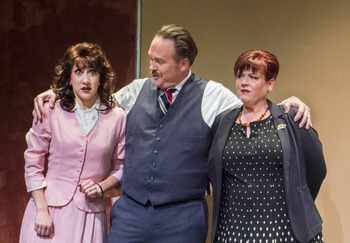 The Foothill production reflects the current mood that women in the workplace are not going to take it any more from their chauvinistic, often abusing bosses. The musical also clearly points out what women are today saying loudly: Women are able to run the business much better than the men who too often ignore, ridicule, and/or sexually assault them on a daily basis. Retained in this production from both the original musical and the preceding 1980 movie are plenty of examples of slapstick humor and over-the-top exaggerations of busts and buns, but the women of this production quickly rise above the stereotypes of the show's 1979 setting to show their grit, their courage, and their ability to take charge. The blonde in tight skirts and revealing blouses is not at all as dumb or loose as she at first seems; and the shy, new secretary arriving in all pink turns out not to be meek at all, once given an opportunity to act boldly. The woman who originally trained her male boss but has since been ordered daily to get him his coffee while being called a "good girl" is actually the one who turns out to know better than he how to make a buck while also how to create an office environment more humane and honoring of its employees. While all these "truths" are present in the movie and in the original Broadway show, under Milissa Carey's direction, the stripped-down version at Foothill allows the core strength of personalities and the powerful transformations of the three starring women to be highlighted even more. The result is that the message of female empowerment that has always been in Patricia Resnick's original book and in Dolly Parton's lyrics takes more center stage with fewer distractions of over-done dance numbers and over-the-top comedic devices. Having been dumped by her husband for a woman half his age, Judy arrives as a new hire with absolutely no obvious skills or appropriate background to be a secretary. Her frilly, lace-bordered hat, her all-pink attire, and her initial tendency to tear up turn out not to be at all who she really issomething that becomes ever clearer as Rachelle Abbey combines her singing voice and increasing swagger to display Judy's growing confidence and determination to succeed by discovering a new self not dependent on a man's domination. The Dolly Parton imitation that Allie Townsend so skillfully and with lots of fun brings to life as Doralee at times almost seems as if the diminutive but feisty star herself has stepped off the silver screen onto this much tinier stage. The distinctive Southern twang that has a little-girl quality (but with an attitude) and the bodily assets that are Dolly trademarks as well as a singing voice that has the required country sauciness and sliding notes are all there. But, like the star herself on screen and in real life, Allie Townsend soon ensures that we understand that Doralee is not the stereotype she appears to be to her boss or her fellow workers (or probably to us)something she defiantly asserts in "Backwoods Barbie." Glenna Murillo brings a particularly captivating persona and set of vocals to the part of Violet, the veteran employee who is up for a promotion to management but finds out that a young, unproven guy she trained has been given the job. As she joins Judy and Doralee in their first of several trio numbers, "I Just Might," Ms. Murillo's strong, snappy, and self-assured manner of sung delivery stands out and proves to get even more impressive as more numbers are sung. When she sings "One of the Boys," Ms. Murillo is able to show that, even if a woman becomes more confident that she is in fact "beautiful, glamorous, brilliant and am'rous," she can also be the one who earns everyone else's and her own confidence as a tough-minded, skilled manager. Backing up this strong trio is a cast who step up to shine in their own particular ways. Aaron Hurley is sleazy, despicable but (unfortunately in too many ways) also believable as the boss, Mr. Hart, who is on the make in the office in between constantly spitting out sexually insulting remarks and jokes. Adam Cotugno is the back-office accountant, Joe, who gingerly (and in his case, respectfully) keeps letting Violet know how much he likes her, with Mr. Cotugno bringing beautiful tenor vocals to bear when he finally gets to duet with Violet in "Let Love Grow." Jorge Diaz breaks his own set of pre-set stereotypes by being an understanding, supportive husband who also has the muscled looks, cocky manners, and slow drawls of a good ol' Texas cowboy. Greg Lynch is appropriately obnoxious and repulsive as Judy's two-timing ex; and Todd Wright walks on near the end with big smiles and big surprises of character as the parent company's CEO, Mr. Tinsworthy. But, most certainly, the minor character many audience members will remember from this cast long after the final bow is Angela Cesena as Roz Keith. Looking and acting a bit like a 1979 caricature of a severe, Soviet Union bureaucrat (who happens to be a woman), Roz marches about in a drab, grey skirt and coat that matches in looks her uptight persona. As Mr. Hart's assistant, she gleefully and meanly barks commands to everyone else while doting on his every word (an adoring sentiment he, of course, ignores, given she is clearly not a former beauty queen). But when Roz is alone and lets her fantasies about Mr. Hart come to full life in "Heart to Hart" and later in "5 to 9," Ms. Cesena breaks out in both seductive voice and body twisting, leg-raising, butt-busting moves that are hilarious and win the evening's biggest laughter and applause. The bare-bones, basic scenic design of Christopher Fitzer rotates on a somewhat slow and a bit clunky turntable but overall works just fine. Choreography by Claire Alexander breaks no new ground and is at times a bit like an aerobics class but is enthusiastically deployed by a cast that is able to make their mark in raised harmonies in the opening and finale "9 to 5" as well as in an especi