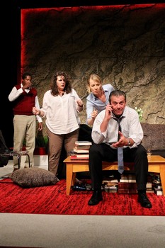 We soon learn that director Virginia Drake has pulled no punches in ensuring that this uproariously funny and furiously outrageous City Lights Theater Company production of God of Carnage will both delight and shock its audience with a terrific take on this dark drama/comedy about modern-day parenting. The Raleighs and the Novaks have never met, even though their eleven-year-old sons, Benjamin and Henry, are in the same class. Alan and Annette Raleigh are dropping by Veronica and Michael Novak's apartment this afternoon in order to discuss diplomatically the incident of Benjamin hitting Henry with a stick on the playground. In between admiring the beautiful tulips, the Raleighs suggest that a write-up of the altercation by the Novaks is a bit harsh when Veronica and Michael say that Benjamin was "armed with a stick," to which the Novaks quickly agree to substitute "furnished with a stick." Even though Henry has lost two teeth, the couples agree that "nothing is gained being stuck in an emotional cul-de-sac" as they proceed to discuss how the boys should resolve the situation and how they as parents should be involved. Treaty negotiations between long-warring nations have probably been easier than what ensues between these parents who have no intention of just allowing the two boys to resolve on their own their own dispute. Yasmina Reza has taken the current term "helicopter parents" and has rendered two sets of busybodies who soon become "fighter-jet" parents. Weapons become many as the afternoon's skirmishes intensify, fueled first by Veronica's prize clafoutis dessert and then by two bottles of Michael's equally prized ten-year rum. Words full of accusations, stereotypes and insults are pointed and harmful enough; but they pale in comparison to flying tulips, a purse full of personals, a hair dryer turned on high, and worse. And then there is Nibbles the hamster who becomes a central figure of contention in the ever-mounting conflicts. Besides the wonderful mix of tactics employed by director Drake during this hour, twenty minute conflagrationincluding deliciously hilarious and effective uses of sudden and complete silencesthis cast of four takes advantage of every word written by the playwright as well as the guidance of the director to score big time hits as each has a moment (or actually many moments) to reign supreme. Side conversations marked by philosophizing on world events, reminiscing about childhoods, or talking about art and business are at first intermingled and then later overridden by bouts of laughing deliriously with edged-cynicism, yelling in a combined chorus louder than a street full of angry protestors, or crying tears of crocodile size either alone or in a wailing duet. As the wars continue, sides of allies continually shift, and battlegrounds are drawn at times not just one couple versus the other, but one sex against another, wives versus husbands, or three against one. In other words, battles flair seemingly at the drop of a word, the scowl of a look, or the accidental bump of an arm; the last minute's friend is this minute's sworn and forever enemy. And all we can do as an audience is laugh aloud with eyes wide open to yet another atrocious occurrence in an apartment that begins to look like the bloodied field of Armageddon. As Alan Raleigh, Erik Gandolfi arrives suited and in the tie of a high-powered New York lawyer. He soon takes the first of many cell-phone calls as he advises his big-pharm client about the current accusation that the company has not advised the public about dangerous side effects of one of its drugs. ("Goddamn inconvenient," Alan admits.) As he barks increasingly louder and with more four-letter words into the cell (while pacing the entire apartment), the other three at first look stunned, then embarrassed, and increasingly irritated. But Mr. Gandolfi's Alan never understands, much less cares about, his effect, eagerly jumping back into the fray after each call as if nothing has happened. In fact, he is more than ready to declare his own son a "savage" and then equally eager to go to war to defend the boy's reactions like those he remembers on the playgrounds of his own childhood. Along the way, his treasured cell becomes yet one more bullet for the opposing side. When the phone becomes a central weapon of revenge, his Alan withers in a masterful portrayal of the high-and-mighty suddenly defeatedfor a few minutes, that is. Openly scowling about the ringing interruptions but at first remaining silent is Alan's wife Annette. April Green allows her character to emerge like the peeling of an onion, with each layer becoming more and more expressive, assertive, and finally downright aggressive. Along the way, she unexpectedly suffers from something she previously ate or drank. Ms. Green's graphic, pained portrayal of her sudden infirmity actually made my own stomach have more than a few, uneasy twitches. That his son Henry has a gang and that he did not allow Benjamin to join it (probably the main reason for the stick incident) actually does not bother Michael that much. In fact, he finds something that he and Alan can have a few, good-ol'-boy minutes reveling in their stories of "beating the shit" out of other kids when growing up. Avondina Wills is all smiles as he does all he can to extend olive branches in the beginning of the afternoon's têté-á-têté (trying to ignore or make light of his wife's more fiery statements of fault and needed retribution). But add enough rum and his Michael transforms from Jekyll into Hyde, calling his son a "nine-year-old snot nose" and declaring, "Children consume our live and then destroy them." When his wife at one point asks, "Why are you choosing to show yourself in this horrible light," Mr. Green's Michael defiantly, triumphantly responds, "Because I feel like it." His sense of newly found freedom from societal (and spousal) expectations is written all over Michael's proudly positioned body. As wonderf