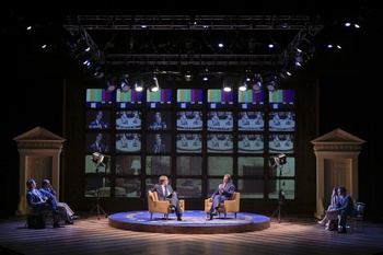 Perhaps no president's legacy has been more emblazoned through the lens of a television camera into the collective memory of a nation than that of Richard Milhous Nixon. In his 2006 play and 2008 movie, Frost/Nixon, Peter Morgan (with a generous dose of literary license) creates with cameras rolling an incredulous string of events that leads in the play's version of history to Richard Nixon's admitting in almost a whisper to British TV star David Frost, "I was involved in a cover-up." TheatreWorks Silicon Valley is currently staging its own Frost/Nixon in a version where many in the audience probably have at least seen the Oscar nominated movie if not the play, where most if not all know the play's outcome, and where everyone will still find themselves breathless and on the edge of their seats as the tension in the Mountain View Center for the Performing Arts meteorically rises just as those same words are finally said. Along with a superb cast who have no problem convincing us they are the famous people they portray, the real stars of this TheatreWorks production are Leslie Martinson and David Lee Cuthbert, director and scenic/media designer, respectively. No fewer than thirty-five television-shaped screens form a massive backdrop with roving TV cameras often projecting live, close-up shots of the proceedings on stage. Those same screens serve as projected scenic backdrops of vintage film clips or network talking heads. Video projections on roving panels allow offices, hotel rooms, and airplane interiors to appear/disappear in a blink. The seamless shifts in scenes move at a pace that increases the sense of urgency while never seeming too rushed, with the director even allowing pauses of complete silence as principals and we have a chance to reflect on the gravity and incredulity of what is occurring. The result is a seventy-minute replay of both well-known public and unseen background scenes of a history that eerily, disturbingly feels like it could be a precursor to what is about again to occurbut perhaps this time in an even more bizarre manner. With hands massive and familiarly emphatic in their movement, a walk whose amble is immediately recognizable, and a voice whose words have that mouth full of mashed potatoes sound that only could be Nixon's, Allen McCullough captures so many of the president's defining characteristics while at the same time bringing to light aspects few of us would ever associate with Tricky Dick. With only a few hints of the famed anger we have all read about, the playwright and the actor team to surprise us with other, lesser-known sides of this president many still love to hate. For example, employing true gentility and graciousness, our Nixon charms David Frost's girlfriend Caroline Cushing (Elena Wright), acting fatherly as he chitchats amiably on their first meeting. The Nixon before us can be funny and self-deprecating about his sweaty upper lip and can be naively awkward as he wonders in a silly voice to David if the Brit's expensive shoes are not "too effeminate." As much as many of us who lived through the Nixon years of lies and atrocities do not want to admit, we begin to find that there are aspects of this Nixon we almost like and come close to admiring, even weakening to a point of feeling some sympathy. While we cannot help but root on David Frost's efforts to force the inevitable confession from this guilty president, when the admission comes, Allen McCullough's now-relieved Nixon is someone we almost want to hug and say, "Thank you." The unlikely key to this improbable set of interviews with an outcome no one believed could happen is jet-setter, socialite-extraordinaire, and talk show host to the likes of Hollywood starlets and rock bands, David Frost. Jeremy Webb brings enough aspects of the flashiness and shallowness of such a TV star that we can understand why the journalistic world of 1977 (along with potential TV sponsors and funders) all turned up their noses in disbelief and disgust at the idea of David Frost interviewing Nixon. But Mr. Webb's Frost brings an inner sense of confidence and maybe just the right amount of cockiness that somehow convinces us that, yes, we can see how the real David Frost could have been the one to take on Richard Nixon. Director and playwright again combine forces to orchestrate a near-intimate relationship between these two adversariesone that is best illustrated in a late-night (and totally fictitious) phone call from Nixon to Frost just hours before the next day's last and all-revealing interview. In one of the best scenes of the entire play, both actors take the cues from script and director and create a sequence funny, touching, and humanely haunting. But during the actual interviews, the heat rises. Called breaks appear like those given warring boxers in a ring as they go to their corners to receive coaching and commands from their managers. In Nixon's corner is Jack Brennan (played by Craig Marker), the extremely straight-laced, blindly loyal, and quick-of-temper chief of staff for the ex-president. David Frost's background team of particularly brilliant strategists and real-time interview coaches consists of Stephen Muterspaugh as Robert Zelnick, Adam Shonkwiler as John Birt, and Kenny Toll as the firebrand Jim Reston. The last member also serves as our ongoing narrator, bringing his rapid, excited rat-a-tat-tat to bear, leaving no doubt in our minds the reason he has joined David Frost's team: "I want to give Nixon the trial he never had." Jim Reston's initial reluctance to help Frost is because he immediately understands that the world of serious-minded journalism is being invaded by late-night, mindless televisionperhaps understanding that once invaded, it's never to be the same again. Somewhat sleazy, nasal-voiced "Swifty" Lazar (Patrick Russell) is everything Jim Reston fears most. He is the Hollywood agent who solidifies the deal between a Nixon who is looking for a safe way to redeem himself