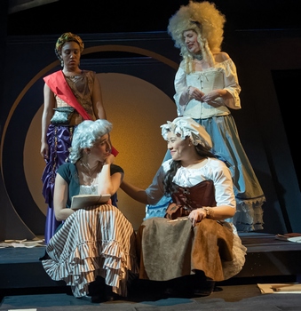 Three of these women find their way to that lone surviving female playwright in Paris at the height of the French Revolution. Each is on a mission to have words written for her own just cause in order to influence history. The woman with the pen wants none of their distractions as she is busy writing a comedy for the stage as her own act of artistic defiance in the face of national crisis, but both a severe case of writer's block and foreboding fears of a trip to the guillotine are inhibiting her creativity. Lauren Gunderson imagines a sorority of sorts forming among these four unlikely friendsthree real, one fictionalwith portraits of their bravery, foresight, and revolutionary spirits emerging in a dramatic play that is also very much a comedy. In a wonderfully conceived and acted production of The Revolutionists by Dragon Productions Theatre Company, their mostly untold/unknown stories reign forth in a play whose brilliant script speaks both truth and fiction as laughs rain down from the audience, even as the scaffold's blade hangs over the necks of all four. Olympe de Gouges is stressed that the current revolution of 1793one we now know as The Reign of Terroris in full swing and "everyone is making history without me." She wants to quill a play that cannot just tell, but "force" people to feel. Better yet, she wants one that "could be about women showing the boys how revolutions are done." As she envisions a new work that might start as a comedy but end as a drama, little does Olympe know that is exactly the same idea that the woman penning her story, Lauren Gunderson, has in mind. The play Olympe hopes to pen and that her creator, Lauren Gunderson, does write is one of feminism in the face of terrorism, of facts enriched by fiction, of art's role in promoting activism, and of a song of liberation that is sung even as the scaffold looms. Maria Marquis is stoically marvelous as an Olympe, who is full of serious intent to leave her mark on history, who holds herself in a posture proud of her accomplishments and possibilities, and who also is frightened that her play will have an ending which even the very thought of terrifies her. Dressed in her subdued but professional best in the French style of the time, Olympe struggles to begin a play whose first words will not come. Out of the blue, her friend Marianne Angelle arrives in a blast of urgency, wearing colorful attire speaking of her native Saint-Dominque (a French colony in the Caribbean) with a red sash across her chest declaring "Revolution for All." Jenafer Thompson forcefully, determinedly and passionately plays the island rebel who has remained in Paris to gather information as a self-declared spy while her husband has gone home to fight in a revolution against French slavery of their people. She wants Olympe to write her a pamphlet exposing the "immoral and hypocritical actions" of a nation that is now itself in rebellion for "liberté, egalité, fraternité," while at the same time running a slave colony. Much to Marianne's irritation, Olympe would rather make decisions if her desired play should have puppets or be a musical (but certainly not a musical with that sound bite of an anthem they keep hearing from something the world will someday know as Les Miz). As the two debate what is to be written, two more visitors arrive in the writer's study. First is Charlotte Corday, bursting in with brashness befitting a woman on a killing mission, which in fact she is. With a knife in hand, she is out to murder the notorious Marat, a journalist who continues to create lists in the newspapers of people who end up losing their heads. Charlotte realizes her act will leave her in the same headless state, and all she wants is "a line"some last few, heroic words she can yell out that people will repeat in the centuries to come. Melissa Jones is an enraged and engaged, manic-minded, blade-swerving Charlotte who is just looking for a few last words"something with a lot of 'fuck you' in it." And as the heat rises among the three of whose words will be written by a playwright who yet has to pen one word on paper, in enters a joke just waiting to be told, their former queenthe only one of the four with half a chance to be long-rememberedMarie Antoinette. Dragon founder and former Artistic Director Meredith Hagedorn comes close to stealing the entire show every time her wig-heavy, makeup-laden Marie opens her mouth to let out another inane remark. Marie is intent on Olympe writing something to correct misconceptions about her. "Just to be very clear, I did not say that bit about the cake ... That was out of context ... I thought I was ordering lunch." Amidst puns, anachronistic references, and accidental and purposeful jokes and ribs, the four women slowly jell into a sororité of women who begin to understand that the play that is to be written is the play they are in. "The story is real when it starts," says Olympe. That story, she notes, "might be fiction, but it's not fake." And even as she still tries to decide what story and even whose story to write, Olympe tells her gathered sisters, "I don't know what I'm writing yet, but I know that our voices deserve the stage." With Lauren Gunderson's captivating, amusing, but highly educating and impacting script, these women do get a moment in the stage's spotlight finally to tell their story. Without the playwright saying so, we understand these four are standing in the stead of thousands of women like them throughout history's important moments of revolutionary and evolutionary changes whose stories have long faded behind those of their husbands/brothers/sons, compatriots, and even enemies. Director Caitlin Papp has taken this script full of comic and historical punch and added many touches to enhance the fun and the funny but also the serious. Her intent both to draw laughter and to elicit new insight from the Dragon audience is further enabled by outstanding efforts from her creative team. Natha