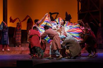 A crazy mixture of musical genres, clever lyrics that span the millennia in references, and a story of biblical proportions about a boy's dreams that save a nation and his family all combine to make Joseph a perennial favorite of young and old alike, no matter how many times it is revived. Knowing that, Broadway by the Bay is one of the latest companies to stage the Webber/Rice classic with a Joseph and the Amazing Technicolor Dreamcoat that soars to the heavens. A cast of thirty-six sing and dance with enough zeal for the story and zest for its delivery to raise the roof of Redwood City's venerable Fox Theatre. As eleven adorable kids gather around her, the Narrator sings in a voice enticing and inviting, "All I need is an hour or two to tell the tale of a dreamer like you." In a stunning, red jumpsuit, Chelsey Ristaino begins her ever-present roam of the stage to provide in song the missing pieces of the storyline not told in the other songs of the biblical story's main characters. Throughout, she brings a voice capable of electrifying with its clarity and a personality that sells the story of this boy Joseph and his life of ups and downs that ends in triumph of spirit. As three hieroglyph-covered panels withdraw, Joseph walks down the pyramid-like steps of Kuo-Hao Lo's designed stage to sing, as if already declaring victory, "Any Dream Will Do." As Joseph, Matt Ono looks around him with the wide-eyed wonder of a boy, as if seeing each and every thing for the first time. But he quickly shifts into a cocky, show-off, smirky grin that drives his eleven brothers nuts as the dreamer walks around smugly reading a yellow and black covered "Interpretation for Dummies." Joseph only mocks them more as they try to snarl and snare at him with a few thrown punches whenever the boy's adoring father, Jacob, is not looking. Once he dons the magnificent coat of many colors that his father gives him and starts parading around bragging, "I look handsome, I look smart. I am walking work of art," the plotting of the brothers for Joseph's demise is already in the making as they sing, "We have never liked him all that much before, and now this coat has got our goat" ("Joseph's Coat"). Adding fuel to the fire, the brothers' wives become enthralled with Joseph's coat, forming a circle around him and showing off the coat as they raise its spangled glory while he and they go round and round. (The fabulous coat is just one of scores of eye-popping, glittery, spangled costumes designed by Bethany Deal that together are a show unto themselves.) Matt Ono's Joseph continues to reign supreme throughout his soon-forced saunter into slavery in Egypt, providing many more sung ditties that dazzle with his inherent charisma. However, one of his most impressive moments will be from a dungeon's cell in Egypt where a forlorn, near-defeated Joseph sings a probing "Close Every Door," a precursor in tone and sound to Jesus's "Gethsemane" of the next Webber/Rice collaboration, Jesus Christ Superstar. Where any production of particularly shines and delights audiences again and again is in its array of musical numbers that span a wide range of styles and time periods, usually delivered in part or whole by a stage full of the eleven brothers and an ensemble of their wives or of female Egyptian servants/dancers. In a number with all the twang, stomp, and kick of a western hoedown, Reuben (Scott Taylor-Cole) leads his brothers and wives in "One More Angel in Heaven." Reuben hilariously feigns sorrow as he tells Jacob that Joseph has been massacred in the desert by a goat, turning the funereal scene into a Saturday night hootenanny as soon as poor ol' Jacob (played with ancient dawdling by Chris Fernandez) wanders off weeping. The 1920s revive in a roaring manner as the pyramid-enriched Egyptian owner of now-slave Joseph, Potiphar (Nathan Temby), sings a number bearing his name while his wife (Jennifer Martinelli) entices a naïve Joseph to her bed. Several musical decades are jumped as a 1970s go-go number ends the first half, with the full cast in varying shades of pink, encouraging Joseph (now in his jail cell) not to give up. Singing "Go, Go, Go Joseph," they swim, do the chicken, the jerk, and anything else that brings back the hopping, bopping moves of the Sha Na Na period. Once Joseph interprets Pharaoh's dreams and becomes the ruler's number two man, his brothers (still back at home and now in the midst of Joseph's predicted famine, swatting flies for a dinner's meat) sing one of the evening's best staged numbers, a French ballad called "Those Canaan Days," with Brother Simon (Jay Thulien) in red beret leading forth in a heavy French-accented solo. The inventive, tongue-in-cheek directorial and choreography geniuses of Stephanie Renee Maysonave and Christina Lazo, respectively, come to full bear in a reenacted scene of the Last Supper where plates, cups, forks and napkins becomes instruments for the brothers to put on a dazzling show of coordinated sitting/standing movement and dance. What tour of iconic, musical genres would be complete without the King himself. As a sparkly caped Pharaoh, Manuel Caneri joins the throngs of other Elvis impersonators before him, thrusting his pelvis; shaking his bell-bottomed, Egyptian leggings; and declaring to the fainting, screaming common folk around him "It's good to be the king" in a stage-romping "Song of the King." Brother Judah gets his turn to swivel his hips in a more Caribbean manner as Montel Nord brings the accents of the islands to clip off in true calypso flair, "Benjamin Calypso," a number of cat-and-mouse chasing as the brothers try to save their younger brother Benjamin from a scheming Joseph out to teach them all a lesson. Alicia Jeffrey leads a Broadway-sounding orchestra of fifteen as the tour of musical styles proceeds. Their big sound explodes particularly in the "Joseph Megamix." The full company returns after the beautifully harmonized, show-ending reprise of "Any Dre
