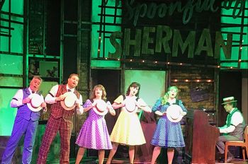 In a heartfelt biographical and musical tribute to his grandfather, father, and uncle, A Spoonful of Sherman, Robert (Robbie) J. Sherman (book) takes us through a ninety-year tasting of fifty-five of the songs his familyincluding himselfhave written, picking them from the more than 250 others he could not include. Premiering in the U.K. in 2014 and having since toured extensively there and in Ireland, A Spoonful of Sherman now has its U.S. premiere at San Jose's newest venue for live productions of musicals, Guggenheim Entertainment's 3Below Theaters and Lounge. With a cast of five who sing, dance and cavort with much talent and glee through the plethora of lyrics and tunes, 3Below's A Spoonful of Sherman is overall delightful and a temptation for humming and singing along that is difficult to resist. Taking turns in providing tidbit details about the family history, cast members begin by relating how that first song of Al Sherman, "Share Your Sorrow," was published just in time for his first royalty check to pay for the delivery of his first son, Robert. But it was Al's next published tune, "Livin' in the Sunlight, Lovin' in the Moonlight," that particularly made him famous, with its being sung by Maurice Chevalier in the movie, The Big Pond. In big voice with his big eyes sparkling, Steve Guggenheim sets a high standard that he and his castmates will continue to meet as he sings yet another example of the happy-go-lucky lyrics the Sherman patriarch wrote to set the standard for his progenies: "Living in the sunlight, loving in the moonlight, having a wonderful time." (The 1930 song went on to become a "SpongeBob SquarePants" opening episode tune with the 1968 version by ukulele-plucking Tiny Timjust one example of scores of other Shermans' songs that have had long, long legs.) The musical biography progresses through the decades, with songs reflecting the flavor and the events of the times, usually offering a romantic, hopeful, and even funny slant on even the worst of those times. One prime example of such a period song that rings with early 1950s richness is Al Sherman's last big hit, "Comes A-Long A-Love," sung on this stage by Shannon Guggenheim. Her clear, jazzy, sparkling vocals deliver the night's first real showstopper, with Ms. Guggenheim adding a big-smile personality that in enhanced by her smoothly performed dance of both hands and feet before she ends with a belting that shakes the timbers. Throughout the show, Ms. Guggenheim will bring a contagious spring in both voice and step to numbers she solos (e.g., "The Wonderful Thing about Tiggers") and to the many on which she is joined by the entire company. In 1951, we are told, Bob and his brother Dick began writing songs together after the challenge of a bet by their dad that they could not do so. The life-long partnership is best described in their 1972 theme from Snoopy Come Home, "The Best of Buddies," as sung for us with brotherly gusto by Steve Guggenheim and F. James Raasch: "Me and you, a two man crew, side by side we're unified, and we will never be divided." As we hear song after song from such family-friendly movies (many with Disney in the title) as Winnie the Pooh, The Jungle Book, The Aristocats, Chitty Chitty Bang Bang, and of course, Mary Poppins, the two brothers found a winning formula that led them to writing more songs for more movies than any other writing team in history (over thirty-five). "You're Sixteen," the brothers' first big hit, has been re-recorded many times since rockabilly singer Johnny Burnette initially sent it flying high in the charts (including a 1973 re-release by none other than Ringo Starr). Bringing his cheerful, attractive vocals that cannot help but elicit a smile from those listening, F. James Raasch is joined by Theresa Swain in a '50s-style jitterbug while he croons away, "You're sixteen, you're beautiful, and you're mine." Theresa Swain also has a number of opportunities to shine as the song catalogue of the brothers mounts ever fuller from the 1960s through the rest of the century. "Pretty," "pleasing," and "perfectly pleasant" may not be words we normally use today to describe one's vocal excellence; but in listening to Ms. Swain sing a number like "My Own Home" or "Suddenly It Happens," these are words that cannot help but come to mind. But when she has the honor of leading the company in "A Spoonful of Sugar" (just one of nine Mary Poppins numbers the company brings exuberantly to the stage), Theresa Swain glistens with a chipper, crisp voice only Mary Poppins herself could actually have. She is joined by a hilariously pecking "robin," James Raasch, whose whistling drew a mid-song round of applause. Rounding out the cast of five is Susan Gundunas, who like the other four has starred in past productions of 3Below's Guggenheim Entertainment. Ms. Gundunas' "The Whistle Tune" is one of her best numbers of the evening, offering her emotionally powerful voice in the soft, low registers where it particularly shines. When singing as a total company, the cast offers both beautifully intertwined harmonies ("There's a Great Big Beautiful Tomorrow" or the barbershop quartet-harmonized "That's What Friends Are For," for instance) as well as comically produced numbers where silly monkeys ("I Wanna Be Like You"), life-size bugs ("The Ugly Bug Ball"), or licking cats ("The Aristocats") are part of their otherwise well-sung deliveries. Taking direction from the choreography designed by cast member Shannon Guggenheim, the company steps, kicks, turns and twists with precision through the decades' styles and through movie numbers we all immediately recognize (e.g., "Step in Time" from Mary Poppins). Scott Evan Guggenheim deftly directs the constant changes in blocking and stage set-up, with the stage's two upright pianos constantly being rolled into another configuration for the cast to use as props, hallways and tables. Pianist Barry Koron never misses a note and is joined by various cast mem