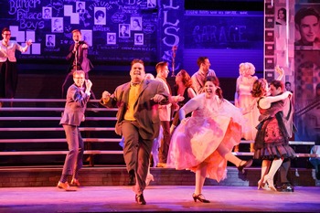 So why are over one thousand people inside the Fox on a sunny Sunday in order to see yet one more Grease, this time presented by Broadway by the Bay's cast of twenty-two? Probably it is because we just cannot get enough of songs like "Summer Nights," "Greased Ligtnin'," and "Beauty School Dropout" or that we just one more time have to see a stage full of teeny-bopping kids hand-jive with hands and feet moving so fast that even we are sweating in exhaustion. We all know the basic story. Sugar-sweet and new-girl-in-town Sandy Dumbrowski arrives in her poodle skirt and curls on the first-day of school at Rydell High to be greeted by leather-jacket boys priding themselves on being greasers, and tight-pants girls cliqued together in a gum-smacking group called the Pink Ladies. To the surprise of both, Sandy and the Greasers' oh-so-cool leader Danny Zuko run into each other after having met at a beach resort that summer and fallen in serious puppy love. The two have just described different versions of their summer together to the "tell-me-more, tell-me-more" girls and guys respectivelyshe, "He got friendly holding my hand" while he, "Well she got friendly down in the sand." But when they see each other, our Sandy and Danny, Kylie Abucay and Alex Alvarez, have what will be their best moments together of the afternoon as they silkily slide up and down the scale together, singing of their "Summer Dreams" in a hugging harmony. As the relationship pretty quickly hits snags and as they bit by bit work their way to a climactic, sung realization that "You're the One That I Want," this duo unfortunately never quite captures again after this first meeting the sparking electricity that makes it convincingly clear they are meant for each other. Part of the reason is that this particular Sandy time and again under-sings her opportunities to sell us on her teenage angst and her love for Danny. That is especially true for a very anti-climactic end to the first act when Sandy falls short in terms of convincing us that she is "Hopelessly Devoted to You." This Danny fares somewhat better in portraying the cocky but also lovesick teen, but he too fails to quite hit that edgy, confident, yet lovable Danny we have all become used to seeing. Fortunately, in this Broadway by the Bay production, the minor characters save the day time and again by knocking number after number out of the schoolyard park. Doody, while hanging out on the bleachers, picks up his string guitar to show his buds the few notes he has learned, with Ted Sclavos starting off in a tentative teen voice and slowly graduating into full vocals that climb sky-high with ease, backed by echoing, smoothly moving girl-and-guy pals in "Those Magic Changes." During a hilarious sleep-over of the Pink Ladies in the all pink bedroom of Frenchy (a big-hearted, fabulously funny Kate Byrd), one Lady named Marty (Samantha Arden) breaks syllables apart (lu-uv, blu-ooo) in "Freddy, My Love," with the full-throated sounds one expects to hear coming from the background radio playing Frankie Valli hits. And to add to the audience's full delight, two teens getting downright serious about dating each other, Roger (Nick Quintell) and Jan (Katharine Andrade), send us all swooning in our seats as they sing in back-and-forth echoes a "Mooning" where Roger's notes especially slide lightly, easily into falsetto heights with Jan answering them in heart-pounding clarity. And the hits keep coming as the story progresses through the trials and tribulations as well as the equally strong joys and jubilations of being a teen. When pink-haired Frenchy quits high school to learn how to be a beautician, she ends up in the late-night dumps when curling others' hair does not work out for her. To her aid comes her own fairy king with great advice in the form of a singer and a setting worthy of a 1930s musical. Her Teen Angel, decked in sparkling glisten, is joined by dancing beauticians coming down the bleacher staircase while Daniel Lloyd Pies does his own version of crooning and swooning into falsetto paradise in "Beauty School Dropout." Top-notch throughout in director Alicia Jeffrey's fast-paced, smartly blocked Grease is the 1950s jitterbugging, jiving choreography created by Allison Paraiso and Zoë Swenson-Graham. A particular highlight is the stage-filling "Greased Lightnin'," which begins with car-slapping, arm-pumping, and rag-waving motions around Kenickie's (Anthony Maglio) new jalopy and then becomes a host of tires and steering wheels twirling with their dancing holders across the stage. Of course the stage goes high-stepping, floor-hugging crazy during "Born to Hand Jive" when the school's dance contest becomes an opportunity for couples to out-match each other in dance calisthenics, only to be interrupted by a massive demonstration of everyone performing incredibly fast hand-jiving. As always, costumes and hairstyles are important elements of any audience's enjoyment of Grease, and costume wiz Merissa Mann and hair/make-up artist Alexis Lazear not only do not disappoint, they both exceed expectations with their end results being both eye-popping and big-smile-producing. Kelly James Tighe's bleacher-dominated set design serves many mixed purposes, and the backdrops of high-school and period pictures and posters provide a great palette for the bold lighting scheme designed by Marcia Madeira. At the performance I attended, a major issue that showed up early and was never corrected was a too-oft imbalance between the hidden, elevated band of seven and the singers on stage. Time and again the fine playing of the musicians conducted by Nick Perez simply drowned out the vocals of soloists and even the entire ensemble. Other times, a more serious problem was that an individual singer or speaker's mike did not function or functioned on and off. The excellently voiced Katharine Andrade, for example, was completely lost in the duet between Jan and Sandy ("It's Raining on Prom Night")
