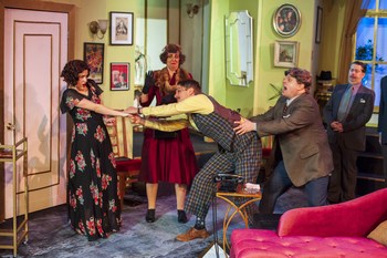 Pear Theatre presents in its intimate setting a Present Laughter that bursts at the seams with riotous comedy propelled by a stage full of memorably quirky characters who get themselves and each other into a myriad of messes through adulteries, seductions, threats of blackmail, star-worshipping, and a star's ego that knows no bounds. In doing so, the Pear proves once again that this is the small-size theatre that can take on big-stage ventures with full aplomb and total success. Charles Woodson Parker steps into the part of 1939 stage star Garry Essendine, a role the playwright himself played in the 1942 London premiere and one that likes of Douglas Fairbanks, Jr., Peter O'Toole, George C. Scott, Victor Garber, and most recently, Kevin Kline have undertaken in the subsequent decades. Even with such an illustrious train of Essendines preceding him, Mr. Parker brings his own fresh, fussy, and funny flavor to the role of this actor whose every waking moment is spent as if always on stage in front of an adoring audience. His delivery of even the most simple, everyday remarks is as if delivering a script just written that moment for him, with gestures grand, poses purposefully dramatic, and facial expressions that no longer need rehearsal since they are already so well practiced. He moves about as if the spotlight is always on him, even noting to no one's surprise, "I'm always acting." Garry is soon to leave for a theatrical tour of Africa, but in the meantime, he is fighting at forty-two a bout of mid-life denial by bringing home young women who fawn over him and seem always to lose their own abode's latchkey after a night of revelry with him. Twenty-one-year-old Daphne Stillington is the latest to arise the next morning from the extra bedroom, entering in men's pajamas and robe and demanding of household staffwho hardly seem to notice her, their being evidently used to such early morning entrancescoffee, breakfast, and Mr. Essendine's immediate awakening and presence. While the first two requests are perfunctorily delivered, the last is not one to be touched. Much to her pouty protests, none of the staff dares to wake Garry until Garry wants to emerge from his upstairs bedroom. Jennifer Chapman is a delicious delight as the whiny, spoiled child who determinedly declares she is now an adult worthy of Garry Essendine's devoted love. Even after he arrives and sends her back to the extra bedroom, there to eat her breakfast and then to dress, it is clear that she is not going to allow herself to be just another one-night flirtation of his and is not yet done in her pursuit of his affection. As she retires, the apartment Garry calls his studio becomes more and more like a Grand Central Station. Already running in and out are his bustling staff members: Fred (Tyler Pardini) is a former cruise line steward who seems to play much the same role for Garry, prancing (nearly peacock-strutting) about with a big smile and unctuous politeness. Quite the opposite is the absolutely hilarious interpretation that Monica Cappuccini gives to the rather ancient housekeeper, Miss Erikson. She bangs her way into the living room through a swinging door she kicks with the might of a star soccer player, wagging a cigarette from her red-smudged lips and generously applying an always-present feather duster to whatever and whoever is in her path. She is gruff and growly but clearly a household treasure to be tolerated and even loved by all. Into this domestic mix enters each day Garry's long-time assistant, the exacting, sophisticated Monica Reed, who is never afraid of taking on Garry with a tit-for-tat round of insults while also always trying to amend the difficulties his wandering eyes and too-easily-given promises seem to get him into. Caitlin Papp's Monica talks in a mega-volume voice that usually supersedes the levels of all those around her, and her voice wonderfully climbs high mountains and dips quickly into low valleys as her tonal effects move several octaves in scale in only one sentence. On this particular morning, the arrivals soon become an onslaught of ever more fascinating visitors. Garry's ex, Liz (who is still legally married to him), arrives asking, "What's God up to?" and enters just in time to see Daphne emerge from the spare bedroom, now in her full evening and formal attire. Liz is not shocked and slightly smirks at the sight of the girl, but she does subsequently embark into a lecture to Garry, noting with a wry, knowing smile, "You have reached a moment in life when a little restraint would be becoming." Kristin Walter is a powerhouse as the cheerfully opinionated is-and-isn't wife of Garry who still knows how to pull his strings, to punch his hot buttons, and to do both while observing with amusement the fray of chaos usually erupting around him. Along with Monica, Liz is part of an inner circle of Garry's that also includes his manager Morris Dixon (John Stephen King) and his producer Henry Lyppiatt (David Boyll), both of whom soon also arrive. While this is a group of friends who readily share their views about what is best for Garry, the things the five do not share with the others are more interesting. Among them, there are secrets of their own and each other's adultery and intrigues of deceit. But the room still has more space somewhere, and into it has already stumbled a clownish fellow named Rowland Moule. Much to his present consternation, Garry has agreed to give his opinion on a play the young man has scribed. Alex Draa wins the night's award for the funniest of all, with his Rowland nearly shaking loose each hand from its arm of any one he meets, with a body that moves in full speed across the room while leaning forward waist up as if he is about to fall any second, and with a set of exaggerated expressions and emotional outbursts that are then suddenly punctuated with moments of total and paralyzed quiet. In later acts of this three-act, three-hour venture of silly shenanigans (wit
