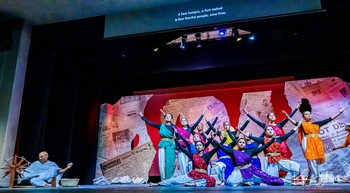 The resulttold in a mixture of Hindi, English, and Gujarati with English supertitlesis much like a live documentary, packed with so many events, news headlines, and people (both famous and unfamiliar) it become, at times, such a swirl of facts and figures that any one detail is difficult to remember a few minutes later. But the power of this theatrical biography is not particularly in its myriad of parts but in its gestalt, in an overall new understanding of this incredible man. And in that regard, Naatak's Gandhi more than achieves its purpose. We are told at the beginning of an old Indian story about a scraggly dog that runs between the legs of two bulls pulling a cart, thinking all along that he, the little dog, is actually the one pulling the cart. That thin, scrawny dog, we will come to learn, is the man whose name titles the play we are about to see. For so much of his life, he is surrounded by those with much more power; but in the end, he rules the day by being a persistent, courageous, daring yet small and meek fellow life-traveler with the mighty around him. We meet Mohandasplayed in act one by Ritwik Vermaas he petitions in 1888 a local council for permission to take his young wife Kasturba (Kinnari Barot) and baby son to London to attend law school. On his journey, he is given a book written by a pioneering, English advocate of vegetarianism (Henry Salt). As he reads, a stage full of beautifully and colorfully attired women dance in traditional Indian formations, while onstage vocalists and instrumentalists perform both traditional and original native-language music (under the direction of Nachiketa Yakkundi). These twelve outstanding dancers return time and again throughout the two-hour, forty-five-minute extravaganza to dance in mime the action of specific events, to celebrate important moments, or to offer an emotionally charged component to something just occurring (all designed by a team of choreographers: Soumya Agastya, Shwetha Subraya, and Nisha Natraj). The haunting chants, delightful ditties, or mournful dirges of the five excellent vocalists kneeling on the side (Nachiketa Yakkundi, Anupama Chandratreya, Tejaswini Narayanan, Shouvik Neogi, and Shirshanka Das) are accompanied by the harmonium of Dilip Acharya, the tabla of Ajay Sundar Raj, and the flute of Niranjan Pagetogether greatly enhancing the story with their sounds of Indian music. That book on vegetarianism becomes a major influence on the young Mohandas whom we will watch become simpler and simpler in his daily life habits, eventually leaving behind not only meat but also cow's milk, salt, shoes of leather, manufactured cloth, and even all clothes save a simple wrap around his waist and legs. Habits of weaving cloth an hour or more each day, of abstaining from sexual contact with his wife, of walking five or more miles a day (barefoot, of course) are practices he follows and advocates of otherssome of whom dutifully follow him but many more who either admire and ridicule but themselves abstain. As Mohandas moves from London to South Africa to India (with repeated journeys back and forth between the three) and attains the honorific name of Mahatma along the way, we see him conceive, develop, and hone to his own sense of high standard the concept of nonviolent resistance, further strengthened by his repeated and oft lengthy and near deadly fasts. Using his legal knowledge and his sense of justice for all, Gandhi from an early age organizes wherever he resides the likes of peasants, farmers, and mill workers against excessive poll taxes, discrimination in voting rights, and more. But as most of us know, his focus increasingly turns to independence of India from English rule (since England refused time and again to honor India with the status of "dominion" given Canada and Australia). The always savvy and smiling Gandhi even picks the location of his bare-necessity, communal-like residence near a local jail, knowing that he will likely reside there from time to timesomething that of course proves true. Relating sixty years of such a man's life onstage is accomplished by a continual flow of people coming and going from all directionssome announcing the latest headlines, some running and screaming across the stage as rioters or attackers, some appearing in meetings and caucuses as members of the Indian National Congress which Gandhi founded. Named characters from history appear (even King George V himself), though few stay long enough for us to register much about them. But under Sujit Saraf's astute direction, there miraculously never seems to be a glitch or a pause in the scores of scenes that are presented. Although the acting abilities range widely among this dedicated, community-based troupe, never does even one person appear to stumble with their lines that often involve naming long lists of communities, of particular people, or of eventsdetails that frankly often do not seem necessary and only lengthen an already long production. While impressions of many performers fade away quickly due to the rapid scenes and scores of characters, Natraj Kumar is particularly impressive as act two's Gandhi. It is uncanny how much he physically resembles the Gandhi many of us know, the bare-chested, bare-footed, bald with wire-rimmed glasses Gandhi. As this Gandhi ages into his seventies while still continuing his protesting fasts, his weeks-long walks through the poorest countrysides, and his minimalist lifestyle, Natraj Kumar weakens before us, his body seeming go from thin to skin-and-bones, his ability to walk greatly impaired, and his voice barely a whisper. Yet at the same time, his Gandhi exudes a remarkable spirit still very much alive, with a determination to use whatever ounce of energy he still has to make a difference in the world around him. Until the end, his Gandhi thrives in taking controversial stands, turning friends into enemies and enemies into reluctant admirers. Certainly, as I left Palo Alto's Cubb