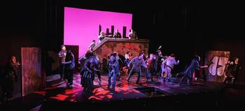 "It's the oldest story: Penelope Pennywise (Angela Cesena), UGC matron of Amenity Number Ninethe public toilet reserved for the poorest and probably mostly homelesssteps forward further to instruct us that "It's a Privilege to Pee." With mop-like gray hair stringing over her forehead, Pennywise sings in an astounding big voice that pierces the air with a knife's sharpness a number that strongly recalls "Peachum's Morning Hymn" from The Threepenny Opera. As her voice rises arrestingly to the heights, she explains to us and once again to the poor souls gathered before her, counting their pennies, that "the politicians in their wisdom saw that there should be a law" that "you come here and pay a fee for the privilege to pee." Pennywise's assistant Bobby Strong (Steve Roma) begins to question the morality of such a law, especially after his father Old Man Strong (Randy Wise) is hauled away by Officers Lockstock and Barrel to Urinetown. He particularly is inspired to "Follow Your Heart" after accidentally finding on the street Hope (Jessica Ellithorpe), the collegially dressed young woman who joins him in a song that sends them into Titanic-familiar territory of immediate love for each other and all humankind as they sing, "We all want a world filled with peace and joy ... With plenty of water for each girl and boy." Roma's Bobby Strong becomes an Everyman and the musical's hero, singing always in a voice clear, inspiring, and determined to do good (as in the rousing "Look to the Sky," with its supporting chorus of red-flag waving, marching peasants ready to march for "pee-dom"). Ellithorpe's Hope Cladwell is a bouncy, chirpy, recent college grad with a naïve, almost childish, air about her who has arrived to work as a "fax-and-copy girl" for her father's UGC. Ellithorpe's speaking and singing voice has a Disney cartoon twitter to it, making her duet with Roma's more grounded, serious Bobby all the more wonderful and funny, even with its serious tones. Now that he has Hope (so to speak), Bobby is inspired to lead a people's rebellion for the freedom to pee anywhere, anytime, and with whomever they want. The Les Misérables call to action scene leads to a stampede of the urinals and toilets at Amenity Number Nine. That does not sit well with UGC CEO Caldwell B. Cladwell (Ben Hatch). With a voice that rings with a breathy threat but always reflecting his somewhat sleazy smile, Hatch is a handsome, Vegas-dressed Cladwell who goes to strange lengths with mixed metaphors about rabbits driving cars and living in shoeboxes to try and convince his daughter "Don't Be the Bunny" and not to be taken in by weak riffraff like Bobby Strong. But Hope does return to Bobby just as the uprising hits its act one finale, in a number that reprises the Les Misérables marching and anthem-like singing and leads to a mob running and singing in slow motion to escape Lockstock and Barrel. Many twists and turns follow, and the roads unfortunately do not lead to happy endings. This eventually confuses Little Sally, who wonders exasperated to Officer Lockstock, "What kind of musical is this? The good guys finally take over and then everything starts falling apart?" Lockstock just shakes his head, smiles knowingly and says, "Little Sally, this isn't a happy musical." After all, this is Urinetown, so how happy can Sally or any of us expect the show to be? But under the direction of Thomas Times and especially the choreography of Derrick Contreras, there is a lot to like and be happy about in the journey to a hopeless (pun intended) ending. Especially fun are the three opening numbers of act two when we watch parodies that are heart-pounding, full-voiced homages to some of our best-loved musical moments. Little Becky Two-Shoes (Emma Blickenstaff, who is anything but little in voice or presentation) and Hot Blades Harry (an equally strong and raw-voiced Peter Spoelstra) lead a stage full of the down-and-out in a series of horas and Russian-step dances straight from "To Life" in Fiddler on the Roof while singing "What Is Urinetown?" The gym scene from West Side Story informs the finger-snapping choreography and singing of "Snuff That Girl," while the revival sounds and hallelujah-hands of "Don't Rock the Boat" (Guys and Dolls) become a raise-the-roof "Run Freedom Run." In that number, Bobby climaxes the scene by leading his army of peasants like an over-enthusiastic director of an a cappella church choira group who gloriously sing in heavenly, water-falling harmonies. While the name of this company includes the word "community," there is nothing "community theatre" about the fully professional production of Sunnyvale Community Theatre's Urinetown. That goes for all the outstanding voices, the flawless and vigorous choreography, the hilarious acting, as well as a creative team superb. Sean Kraemer's set from its floor of camouflaged colors to its graffiti-decorated sewage setting to its corporate skyline in the distant horizon is a perfect palette for the changing hues and well-placed spots of Edward Hunter's lighting design. Angela Yeung and Chris Beer have ensured we hear all the deliciously in-poor-taste words and lyrics of this twenty-seven-person cast through an excellent sound design. The balance between singers and music director/conductor Ande Jacobson's seven-piece orchestra is never imbalanced as the musicians play Mark Hollman's varied score with edge and beauty. Finally, the costumes designed by Sylvia Chow are both jocular and pointed in their looks and meaning. It does not take much to see mirrors of our own local homeless or of our 1% elite when looking at those on the stage. All in all, Sunnyvale Community Theatre's Urinetown is a destination that needs to be on every mid-peninsula musical theatre lover's calendar over the next couple of weekends. This is a don't-miss-it, community-based triumph for sure. Sunnyvale Community Players' Urinetown runs through November 10, 2019, at Sunnyvale Community Center, 550 