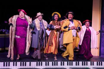 Decked in the first half in brightly colored frocks to be replaced by even more colorful and lavish furs, silks and satins in the second (Jasmine Williams, costume designer), the Hillbarn cast members bear the names of the original Broadway stars of 1978 who all returned ten years later for a much-proclaimed revival. When this cast performs as a total ensemble, voices blend exquisitely, as in "Jitterbug Waltz," where rolling, counter-melodies construct a hypnotic, mesmerizing atmosphere as each member also waltzes with an invisible partner. When the heat turns up, as in "How Ya Baby," the five not only sing with abound but also dance with high kicks, side jumps, and body splits while all the time arms and legs seem to move simultaneously in every possible position and direction. Lining up across the stage in "Handful of Keys," they become a piano keyboard, sounding off with notes from the lowest bass to the highest soprano that combine to produce fun and funny. But it is when at one point all five members sit motionless and solemn on arranged stools that the evening's best ensemble song, "Black and Blue," moves us in a haunting manner. Close harmonies make way for individual lines to be passed from voice to voice in beautiful echoes. Lyrics take on renewed, even more startling meaning given today's Black Lives Matter: "I'm white inside, but that don't help my case; 'cause I can't hide what is on my face." And when they end with "Why was I born?; What did I do to be so Black and blue?," the almost century-old song becomes sadly current, reflecting sentiments of how many Blacks report experiencing life in America today. Some of the evening's best moments occur when individual performers take the stage solo and/or in duets, giving each a chance to shine and show off a wide range of possibilities. As Armelia, Phaedra Tillery-Boughton early in the show alerts us that there is a down-low, sexually titillating quality to many of these Tin Pan Alley and Harlem club songs that were often originally performed in the wee hours of the morning. As her hips swirl and her arms caress her body slowly and sensuously, her Armelia sings in tempting, teasing manners, "Oh, Daddy, squeeze me and kiss me some more ("Squeeze Me"). For her part, Majesty Scott, as Charlaine, knocks it out of the park as she brings crystal-clear brilliance and a nightclub-star quality to her "Keepin' Out of Mischief Now." Her ability to sell, sell, sell a number is proven again in her solo section of "I've Got My Fingers Crossed." In the night's first solo ("Tain't Nobody's Biz-ness If I Do"), Dave J. Abrams, as AndrĂ©, quickly establishes his incredible talents in two ways: a wowing voice with a sharp edge that cuts to the heart of the song's lyrics and an ability, while singing, to simultaneously twirl, jump, twist, and dip in speeds and heights that are eye-popping. In a totally different genre, his AndrĂ©s slithers, swoons, and slides in both voice and movement in a weed-induced, dreamy state in "The Viper's Drag." Somehow, he moves from one side of the floor to the other seemingly without his feet ever leaving the floor. As Ken, the big bass of the group, Anthone Jackson time and again sings forth in a deep, rich tone that sustains notes most impressively (e.g., "Honeysuckle Rose"), but it is when he turns to comedy numbers that he is the king of the night. His "Your Feet's Too Big" is a big-voiced, hilarious set of insults to an unseen table partner. When he is joined by Dave J. Abrams, the two are like a vaudevillian comic duo with side-splitting one-liners tossed back and forth in "Fat and Greasy." The joy exuding from Anthone Jackson's vocals make it difficult not to smile every time he steps onto the stage (as in "I'm Gonna Sit Right Down and Write Myself a Letter"). But, just as it was true in 1978 and again in 1988 when Nell Carter reigned forth and won multiple awards for her Nell on Broadway, Katrina Lauren McGraw is truly the commanding force on this Hillbarn stage, as her presence dominates every time she steps forth. Like Nell Carter, this Nell brings a wonderfully enticing, slightly nasal yet big-throated quality to her numbers that provide an authenticity to the sound of nightclub basements of 1920s New York. Whether with slow, seductive beginnings that soon pick up in energy and speed ("Cash for Your Trash") or with soulful reverberations in tones round and luxurious ("Mean to Me"), Katrina Lauren McGraw proves time and again she is worthy of stepping into the shoes of the incomparable Nell Carter. There is a slight lopsidedness in the evening's two acts. A three-song comic sequence in Act One ("Ladies Who Sing with the Band," "Yacht Club Swing," and "When the Nylons Bloom Again") is uneven compared with the rest of the evening. Voices sometimes become too affected, exaggerated, and even shrill (the high sopranos, especially). Falling toward the end of Act One, the energy in the room seems to change to something a bit too silly. However, Act Two does not miss a beat from beginning to end, bringing the audience to its feet for a well-deserved standing ovation. Hats off to director and choreographer Kevin Smith-Kirkwood–with few exceptions, there is hardly a minute that this cast is not moving in coordinated waves, dips and steps, with all parts of their bodies being called upon to sell the songs they are also singing so well. That musical excellence is certainly in large part due to the music direction of Jasmine Butler. Her band of six is a show unto itself, especially with pianist extraordinaire Nancy Godfrey making the keys almost bounce off the keyboard as she gleefully pounds away at a furious speed. The nightclub setting designed by Matt Owens combined with the designs of light and sound by Pamila Gray and Angela Yeung, respectively, do their parts as this director, cast, and creative team ensure that Hillbarn Theatre's production of Ain't Misbehavin' is a fun, funny, and fabulous night of live theat
