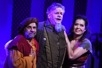 At the door leading to this compound stands a sour-looking guard in dark glasses and a red cap (one can almost imagine seeing "MAGA" on it). One by one, scared souls clearly of varying nationalities slink along the theater's aisles and guardrails, only to be grabbed at the gate by the guard, roughed up, and pushed inside. Soon, the cast for the evening's musical are all on stage, facing us with frightened faces, hands up against an invisible fourth-wall fence separating us and them. All, that is, except for the final two, who now arrive with large trunks. One wears a long, ragged coat with a yellow Star of David on it, reminiscent of the Holocaust. We soon learn they are two actors forced that evening off the stage and imprisoned here among what appear to be present-day, undocumented immigrants. As other prisoners begin pilfering their trunks to grab warm things to wear, we learn the two are playwright, actor, and tax collector Cervantes and his manservant. Both have been brought here as part of an ongoing church-state-led inquisition–his crime being to foreclose a monastery for not paying its taxes. (Here is where the present day holding cell for immigrants and the late 16th-century Cervantes caught up as a victim of the Spanish Inquisition leaves one scratching their head a bit in reconciling how both can be happening at the same time.) When Cervantes' fellow prisoners charge him as "an idealist, a bad poet, and an honest man" and threaten to put him on trial, Cervantes asks to speak in his own defense and to do so as a "charade." Receiving permission from a sympathetic prisoner others call The Governor, Cervantes begins a transformation into a wandering knight-errant, adding bushy eyebrows, scruffy beard, and other hilarious but effective costume pieces (also designed by Julie Engelbrecht) befitting a traveling actor doing his best with makeshift items from the trunk. And thus begins a play within a play as the prisoners join now as actors in this charade trial. Cervantes directs them as they enact a tale about an old man named Alonso Quijano and his country squire–an elder who through all his reading so many books about man's injustices to others, has convinced himself that he must become a "knight errant and go into the world to right all wrong." In doing so he renames himself yet again as Don Quixote of La Mancha. The perennial lead actor of most San Jose Playhouse musicals, Stephen Guggenheim, once again brings to the stage his rich, operatic-trained voice as he introduces himself and his mission in "I, Don Quixote." Sitting atop an imaginary carriage next to his squire, two prisoners in horse and mule masks and hands gloved as hoofs (Isai Centeno and Brian Conway) pull their passengers along as they prance and dance with high and jolly steps, with the knight making his way into his make-believe world of adventure. His first encounter is against what he sees as a monster, no matter how many times his faithful squire Sancho tries to convince him it is a windmill. As prisoners now fully get into the act, tying the foil blankets onto sticks and twirling them furiously around the sword-flailing knight, they become a windmill that is to him an ogre. As he declares victory waving his now twisted sword, we and the prisoners themselves quickly become endeared to this old man and his undaunted optimism, fool-hearty bravery, and incredible naiveté. Every Don Quixote is only as successful as his loyal sidekick Sancho Panza, and Jeff LaGreca has the looks (short, wiry, big-eyed, a face that metamorphoses into a thousand grins and grimaces), the demeanor (respectfully blind to and denying of his master's insanity even as he rolls his eyes), and the movements (something between a goofy clown and an overly confident alley cat) to pull off a fun, funny, and totally lovable Sancho. Out of the blue he blurts out statements like "They say one madman makes a hundred and love makes a thousand," only to brush off "What does that mean?" with a smiling "I don't know." When he delivers songs such as "I Really Like Him" and "A Little Gossip," he sings with a boyish voice searching vigorously for notes with an occasional scratchiness that matches so completely his scruffy personality. Don Quixote's illusions continue and only amplify as the two arrive at a wretched roadside inn now full of prisoners turned into rough and crude muleteers. The two travelers are welcomed by a gentle-souled innkeeper (Jackson Davis) who reluctantly but then willingly complies with the notion that his humble inn is now a noble castle and he is its ruling lord. Quixote's niece Antonia (Emily Song) arrives at the inn with her uncle's elderly Housekeeper (Katya Roemer), trying to solicit the help of a local Padre (Jim Ambler) to convince the illusion-filled Cervantes to come home. In one of several scenes where Scott Guggenheim flouts his prowess as director, the three sing in a quickly assembled church (complete with Sancho serving as Christ on the cross and other prisoners as saints' busts on the imaginary walls) a wonderfully voiced "I'm Only Thinking of Him" in which each singer enhances a character's personality with vocal precision. In this same run-down inn that Quixote has dubbed a royal abode, he eyes across the room a brassy barmaid and part-time prostitute named Aldonza whom he immediately identifies as his long-sought lady, Dulcinea. With notes that slide lusciously into their position and willing to linger long enough to impress, Stephen Guggenheim woos us as audience with his version of the much-loved "Dulcinea" but does little but flabbergast and annoy the fiery Aldonza, who wants nothing to do with this crazy old man. Sandra Raquel Bengochea excels as a flirty, hip-swishing Aldonza who also continually fights off with fierce resistance the pawing hands of the muleteers she serves. She has a bitter outlook given the bleak life she lives, cynically snarling at one point to Quixote, "The world's a dung heap, and w