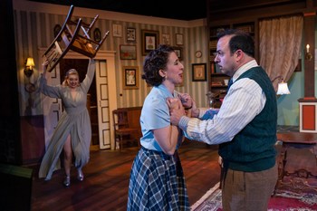 Escaping to the shores of Wales from London's nightly blitzes of horror, it seems that nothing could be more natural and timelier for Noël Coward than to help himself and his audiences forget the war for a couple of hours by writing a new script guaranteed to elicit giggles and guffaws. Opening in the West End in 1941, his Blithe Spirit (written in only six days) set records as London's longest-running non-musical ever, and the delightful, over-the-top comedy of manners has continued to this day, sending audiences into spasms of howling laughter. That certainly is the case at City Lights Theater Company as a fantastically directed, hilariously performed Blithe Spirit reincarnates this Noël Coward treasure in which an eccentric medium, a mischievous ghost of a past wife, a not-too-pleased present wife, and a husband rather enjoying sudden bigamy together occupy a house full of spooky surprises. Charles Condomine wants to do some research for his next book by inviting to his home in Kent, England a local woman who delves freely into the realms of otherworldly spirits. Also at the dinner are his wife Ruth and their friends, Dr. Bradman (a skeptic of such things) and his wife Violet (a professed lover of fortune tellers). Even numerous pre-dinner martinis can hardly prepare them for the entrance of Madame Arcati, who arrives on her bike with a long, velvet skirt hiked up over a man's belt around her waist, revealing her bare legs. Like Charles, she is also a published author–her books being "whimsical children's stories" and "enthusiastic biographies of minor royalty"–but her real claim to fame is as a medium whose first, self-induced trance was at the age of four and first manifestation of a spirit from the beyond at the age of five-and-a-half. She has arrived to conduct a séance with a foursome who are doing all they can not to snicker at her strange, most peculiar mannerisms and séance preparations. Madame Arcati walks outside to chat with a nearby cuckoo bird; she strokes and smells and then quickly rejects the table proposed by Ruth for the séance; and she marches around the living room, humming in strange tones and frantically fanning her face with outstretched hands. But when she starts singing in a child's voice, "Little Tommy Tucker," while playing hopscotch on the carpet, followed soon by sudden shrieks and guttural sounds, it is all the four can do not to burst into laughter as they now sit at the table with hands on its surface and fingers extended and touching the others. (We in the audience, on the other hand, are in continuous stitches.) Madame Arcati is trying to arouse her spiritual go-between–seven-year-old Daphne who died in 1844–who might connect them with some dead soul wanting to return to this life. That something might go wrong has already been hinted at several times by Coward's clever script. Ruth early on says to her husband, "I have a feeling this evening is going to be awful." (She has no idea!) Madame Arcati reacts to the evening's menu including meat to warn, "I make it a rule never to eat meat before I work; it sometimes has a very odd effect ... [but] if it's not very red ... we'll risk it." And when Madame insists that they play a phonograph of Irving Berlin (because "Daphne is attached to him") and chooses "Always," the disturbed and almost frantic look on Charles' face says it all: That love song was special for him and someone he would rather not see again tonight. After Madame Arcati collapses onto the floor to enter into a trance, a female voice calls, "Good evening, Charles"–a voice only heard by him but one he immediately with shocked and disbelieving ears recognizes as the wife, Elvira, who died seven years prior. The séance ends with everyone believing nothing really happened, except Charles and a suspecting but not sure Madame Arcati. By the time the guests have all left, the real evening's entertainment is just beginning, at least for the audience. When the patio doors suddenly open with a sounded breeze, a beautiful, young woman enters with an impish grin, wearing a stylish gown with a skirt cut to reveal lots of leg and a bodice purposely showing tempting breasts. That she can only be seen by her once-husband and not by his now-wife is perfect for what she has planned; but for the irritated Charles, it is a nightmare in the making. As he shouts in response to her teasing inquiries and remarks, "Shut up" and "Be quiet ... You're acting like a guttersnipe," Ruth becomes more and more irritated, thinking he is talking to her. As the next few hours and days progress, husband, live wife Ruth, and dead (or at least once-dead) wife Elvira now cohabitate in a household packed with fits and fights, plots and ploys, surprises and suspicions as well as marital passions both rekindled and those on the fast wane. The cast assembled could hardly be better than this group of seven fine comedic actors whose varied, British accents and mannerisms all are like watching a BBC special. As Ruth, Maria Marquis finds a hundred ways to convey the increasing irritation and indignation she as current wife feels toward both her husband and the unseen, deceased wife she finally has come to believe is actually there–from pouting lips to sharp consonants to looks that could kill. On the other hand, Georgia Ball's Elvira is clearly having a ball being back on earth and being a pain in the side of Ruth. Her Elvira teems with a plethora of devilish and scheming expressions. Her expressive eyes full of sparkle, smirking lips of fiery red, and taunting moves of temptation are parts of her lurking presence that only Charles can see but Ruth increasingly can sense. As Charles, George Psarras soars every moment he is on stage, especially as events unfold in which one wife's plot backfires to change the destiny of the other. How many ways can he have emotional outbursts and tantrums? Now he is like a little boy pouting; now he is a hurt puppy whimpering; now he is a