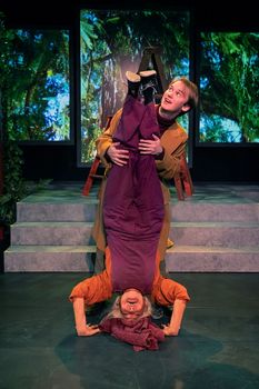 On the brink of exiting his teen years, Harold Chasen is a quiet, well-dressed, rich kid obsessed with death. For recreation, he attends funerals in between visiting junk and demolition yards. In his room are a collection of daggers, a skeleton, and an electric chair. He has faked his suicide seventeen times, and that does not count all the made-up maimings. Today he is hanging head-bent and unmoving with a roped noose around his neck in his mother's lush flower garden just as she is orienting the new maid–a young girl who screams in horror as she looks out the window at what appears to be a quite dead body. It is just another typical day in the Chasen household, with his exasperated mother sighing, "Oh, Harold, I have one-hundred-and-one things to do, and you are not even dressed for dinner." Katelyn Miller sends her voice through rounds of vocal calisthenics, jumping to upper octave heights with an exaggerated feigned-aristocracy accent as her perky Mrs. Chasen never misses a chance to talk incessantly, giving whomever she is conversing with–including her son–little chance to respond. She is determined to make her life easier and to marry Harold to someone/anyone, first setting him up with a local psychoanalyst–Dr. Matthews played with calming cool by Steve Allhoff–and then registering Harold with the National Computer Dating Service for three blind dates. The only problem with the latter plan is that Harold greets each potential date (all hilariously played by Michelle Skinner) only after another of his incredibly realistic brushes with death. (Gotta a match to light the kerosene?) Harold escapes his mother's silver-service tea times with potential brides by attending funerals of people he does not know. It is at one such solemn event that he meets an elderly woman munching on a bag of nuts and offering him an orange just as the eulogy is about to start. Introducing herself as Countess Matilda Chardin, the exuberantly pleasant (and also constantly chattering) woman dressed somewhere between gypsy and hippy tells him just to call her "Maude." And thus begins the unlikeliest of friendships that leads to adventures the young Harold could never have imagined in all his death-focused past. Living life to its fullest is the very essence of this eccentric, diminutive lady of almost eighty. That she rescues a City Hall tree in a cement pot only to try and replant it in a graveyard, that she has a seal named Mister Murgatroyd in her tub which she released from its dirty-water pool in the zoo, or that she frequently steals (temporarily) any nearby car when needed using a set of keys once given to her by a follower of Zen as he left the penitentiary–these at first somewhat shock Harold but soon just become the very reasons he genuinely likes her. And the fact that he does not judge and comes along willingly for the ride is more than enough for the cheerful, mischievous sprite to befriend him as well. As Maude, Lillian Bogovich glides about the stage as if her feet never touch the ground. She is a delight to behold and a great source of laughter from an audience that clearly learns to love Maude nearly as much as does Harold. Her movements are often like that of a ballet dancer, with hands that express in ever-flowing manners the joy she sees in a sunflower, a majestic tree, or the last sight of her dear seal now heading out to sea. Maude sparkles from head to toe as she introduces Harold to music, to waltzing, or to his first experience with such "organics" as champagne and weed. The unquestionable sincerity and deeply defined genuineness that Maude exudes lead neither Harold nor us to question the merit of her self-made art pieces like "Rainbow with Egg Under Elephant" or a fireplace adorned with a nude of herself. Neither he nor we bat an eye when she strikes a chime and music suddenly fills the air. And the fact on her eightieth birthday she is now standing on her head (Bravo, Lillian Bogovich!), but of course. Maude is Maude. Equally impressive but for reasons mostly opposite is the performance of Max Mahle as Harold. More often than not–at least before he learns to abide by Maude's cheer of "Go, team, go ... L-I-V-E"–his Harold is a boy of under-expressed emotions and reactions, even as his mother is peppering him with questions or reprimands. With head often half-bowed and totally deadpan looks as once again he pulls off a prank like chopping off a hand or bringing a smoking rifle in to meet a potential date, Harold moves about almost as a ghost. Only after he meets and spends time with Maude climbing trees, smelling "Christmas in New York" from her invented "odorifics" machine, or singing "If You Want to Sing Out, Sing Out" with her joyfully and off-key, does Harold transform into a much lighter, expressive, wide-eyed boy who is quickly learning what it might be like to love as a man. Filling out this splendid cast is Jonathan Covey as the local parish's shy and interpersonally awkward Irish priest, Father Finnigan, who becomes tongue-tied flustered around Maude and her latest, outlandish act. Marc Berman and Joshua Klein are officious but never odious as gardeners and constables who seek quite unsuccessfully to steer Maude into the straight and narrow. Erica Racz is the maid who says few words aloud but speaks volumes with rolling eyes, lips silently tut-tutting, and a face full of disgusted dismissal as Harold tries yet another of his false attempts to exit life. Gary Landis clearly has had a ball directing this fine cast and exceptional creative team, pulling out stop after stop to amuse and amaze the audience. Serving as also set and projection designer, he has created homes for the Chasens and for Maude that fit their personalities and individual quirks to a "t"the two living areas are separated by an elevated, indoor terrace leading to projected gardens, forests, and seaside scenes created by Landis' projections. Hats off to Erica Racz for the hundreds of often fanta