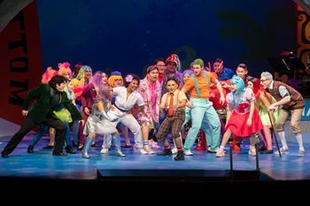 Thus, with some trepidation but also curiosity, I ventured into the packed, highly hyped-up, and majority kids-and-teens audience at Lucie Stern Theater to become fully surrounded and somewhat amused by the pumped-up, hormone-raging energy and enthusiasm of a youthful cast of twenty-three as they presented The SpongeBob Musical. In the end, I left no more a fan of SpongeBob than I was before, but I remaining a firm admirer of Palo Alto Players for the eclectic array of musicals the company continues to produce year after year and particularly, in this case, for introducing a new generation of the younger set to the might and magic of musical theatre. For those readers like me who may not be familiar with SpongeBob, I offer a quick primer. SpongeBob SquarePants is a yellow, square-headed sponge who lives in an underwater kingdom called Bikini Bottom. The township's citizens are all sorts of sea creatures, including SpongeBob's best friend Patrick Star (as in starfish), his neighbor Squidward Q. Tentacles, Mr. Krabs his boss at the Krusty Krabs Restaurant, and Pearl Krabs, the blue whale daughter of Krabs. Another friend of SpongeBob is a squirrel named Sandy Cheeks, who exists underwater in a diving suit. A scheming, slimy plankton named Sheldon and his computer wife, Karen–yep, a mixed marriage for twenty years between a single-cell organism and a PC–run a not-so-successful Chum Bucket dive that those in the Bottom world avoid like the plague. In the musical's opening "Bikini Bottom Day," all of these and others like Mrs. Puff(fish), Perch Perkins, and Larry the Lobster are each introduced in a rambunctious, romping number written by Jonathan Coulton–just one of more than fifteen different songwriters ranging from Cyndi Lauper and Sara Bareilles to David Bowie and Yolanda Adams. (The full list of the original song creators is listed at the end of this review.) With other creators including The Flaming Lips, They Might Be Giants, and Panic! At the Disco, the music is a hodgepodge of rock, pop, hip-hop, country, gospel, Sesame Street, and everything in between. The accompanying choreography designed by Stacey Reed to match such a wide range of beats and rhythms varies from the opening number's cheerleader-like jumps and air-pumping arms to hip-hop's fast footwork, freezes, and power moves. Full stage stomping or high kick stepping give way later to feathery fish all tap-dancing. Needless to say, the pace is often near frenetic; the energy level is usually bubbling vigorously; and there is tongue-fully-in-cheek intentions on full display during every second of the two hours, twenty minutes (with one intermission). Into this blissful community of sponges, sardines, and an underwater snail named Gary (SpongeBob's pet who meows), the news arrives that doomsday is only a day away with a nearby volcano (Mount Humongous) about to erupt and wreak the havoc of lava and boulders over the entire town. Panic (meaning lots of running and screaming) sets in (and returns often), but the science-minded squirrel, Sandy Cheeks, has a plan to create am Erupter Interrupter to insert into the volcano's crater and turn its lava into harmless bubbles. SpongeBob and Patrick are ready to help scale the treacherous mountain with Sandy, but the evil plankton-computer duo of Sheldon and Karen have other nefarious ideas of how to use this opportunity to take over Bikini Bottom and win everyone over to their unpopular, ill-tasting chum. With a nod to current issues of our world, the two convince the Bikini-ites that a foreigner such as the land mammal Sandy Cheeks, who is spouting a bunch of science crap ("Who believes in science anyway?"), cannot be trusted, setting up a group of marching, sign-carrying, angry citizens calling for the squirrel's expulsion. The musical is now set for a fight until the end–literally as a doomsday clock ticks away–between ever-plotting villains and unlikely heroes with a population of jellies, fishes, and crustaceans in the middle, easily duped and heading to their demise like lemmings stumbling toward the cliff. Resembling a mixture of Peter Pan, Pinocchio, and one of the lollipop Munchkin kids from The Wizard of Oz, Joe Galang zings with charisma, character, and charm as SpongeBob SquarePants. His diminutive size belies the giant presence he commands on stage, with a personality that pops with energy, emotion, and excitement for his life in Bikini Bottom. Where he falls short is in delivery of SpongeBob's songs, with his pleasant, rather youthful vocals sometimes being too softly sung either as a solo or in duet with others whose more powerful voices overpower his. (On the night I attended, I think that this could also have been a miking issue where his volume was not turned up enough since in the second half of Act Two, suddenly his voice was somewhat stronger and surer.) As SpongeBob's best pal Patrick Star, Rocky James Concepcion combines sizable presence bodily and personality-wise to be the perfect partner with his smaller-physique pal, with the ability to catch the flipping, jumping, flying SpongeBob in his arms. Concepcion sings with aplomb and flair and can blast a song-ending, sustained note quite impressively, as witnessed in a gospel, go-to-church number ("Super Sea-Star Savior") as he is surrounded by a stage-full of evangelical-pumped-up, pink-from-head-to-toe sardines. With seemingly countless costume changes among an ensemble who swim on and off stage as cartoonish species of sea folk dressed in an fantastical array of colors, feathers, glitter, and materials of every sort, Raissa Marchetti-Kozlov is the monarch of the underwater world as costume and hair/make-up designer. Perhaps her most memorable creation is the four-legged (two feet in each of two, opposite directions) Squidward, whose every step and move is another reason to laugh aloud. When Andrew Cope, as Squidward, is joined by a dozen, dancing fish floating in feathers and glitz, they produce the nigh