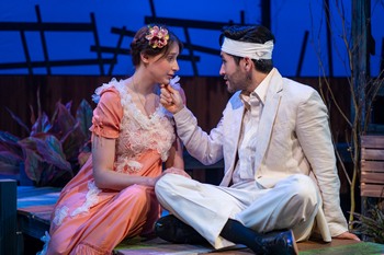 As the bride-to-be, Belmira opens our tale by throwing her father's fish bait into the river that runs next to the family's jungle abode. To a chirping dolphin eagerly accepting her tossed gifts, Belmira expresses her excitement for a marriage to childhood friend Duarte, whom she is sure will help her escape this remote village for a more exciting life in the city. Belmira is the center of her own universe and believes that even the sky's lightning is "announcing my wedding with a drum roll all of Brazil can hear." She is also a constant plotter and a manipulator who will do anything to ensure the desired escape from this poor fishing village, including moving in and taking over any beau–like she did with Duarte–who tries to date her older sister, Helena. As Belmira, Salma Zepeda excels in every respect as a daughter and a sister who must be in the spotlight, no matter the cost. With her sarcastic smirks and taunting voice and haughty flips of head and hair, she unashamedly pushes her sister aside in order to home in and take over any and all conversations. Even though she has triumphantly won her first love, Duarte, away from Helena and is only hours away from the altar with him, Belmira ostentatiously and with no shame flirts with a handsome, well-dressed stranger whom her father and Duarte have rescued from the river, appropriately named Moises (like the Biblical Moses, "drawn from the water"). Her aggressive fangs sharpen even more as the debonair Moises begins courting her sister. The more Helena begins to fall in love with the family's guest, the more Belmira slinks and smiles her way into their moments together, even as her wedding hour approaches. Ricardo C. is the soft-spoken, exceedingly polite Moises, exotic and sexy in both accent and looks. Arriving out of the murky, river waters clad in a snow white suit and straw hat, polished boots, and a bandana-wrapped head, he immediately looks longingly at the reticent, reserved Helena, soon bestowing her with gifts uncommon in the remote jungle and predicting to a skeptical Helena, "When you give your love, you will change your man." Marisa Lopes's Helena does not vary her affect much–vocally or expression-wise–even as the striking stranger ups his romantic approaches. Her hesitation to accept as true the increasingly wooing words of Moises or to give into his sense of urgency for a yes to marriage is clearly proof of a risk averse nature, one expressed when she tells him that even if she sees something in the water she might want, "when you reach in, you might lose your hand." As her own words begin to soften to his approaches, it is sometimes difficult to believe she really means them, given the lack of much variation beyond the bland looks and voice Lopes uses to express Helena's emotions. Much more expressive along every dimension are Sr. and Sra. Costa. Each is a joy to watch as they tell others how they met each and fell in love in only three days. Their love is visible in the way the two radiate from head to toe when together. Sergio Davila's Sr. Costa is a gleeful bundle of energy and excitement, immediately finding a kindred soul with Moises. When he tells Moises of a recurring dream he has involving being in the water swimming alone, his exuberance is contagious and his telling is one of the evening's highlights. Likewise, Carolina Perez's Sra. Costa glows when talking to Helena about first meeting her husband, with her aim in no subtle manner to help her daughter find that same kind of catch in this man just drawn from the waters. Arturo Montes solidly rounds out the cast as Duarte. Toward Moises he is openly belligerent and distrustful. Toward Belmira he is like an obedient puppy. When looking at Helena from an unseen shadow, his eyes show sad resignation and longing. John R. Lewis achieves the relaxed, rhythmic feeling of the Amazon region with a pace that is never rushed but always flowing forward with purpose. Poet-turned-playwright Orta brings a stunning, musical quality to her dialogue that appreciates a director's pace that allows the audience moments to savor the beauty of it all. The lush lagoon setting designed by Ron Gasparinetti, while humble, is palpably romantic with its multi-colored dock winding along a sparkling, plant-bordered river and butting against the wood-plank, one-room house. Spenser Matubang's lighting adds to the magical feel of the jungle with its sudden storms of lightning and its dappled sunlight through rain-forested canopy as does the symphony of insects, a river's water, rain, and tropical-based music as created by the sound design of George Psarras. When all of the creative team's efforts are combined with the tropically colored, celebration-ready costumes designed by Kailyn Erb, we are lured into believing that the family's chatter and teasing of each other, the planning of Belmira's and Duarte's wedding, and the emerging love between Helena and Moises will lead in the end to a happiness that mirrors what we see in the love between the sisters' father and mother. But as storm clouds, thunder, and very strange lightning of multiple colors erupt the peaceful setting, we also realize that this fairy tale may be grimmer than we had earlier supposed. Whatever the ending, the telling of this tale of The River Bride by City Lights Theater Company is a journey into the Brazilian jungle well-worth exploring. The River Bride runs through June 11, 2023, at City Lights Theater Company, 529 South Second Street, San Jose CA. For tickets and information, please call cltc.org. |