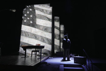 As the gentleman slowly climbs the steps to the stage to center himself behind a desk and face us, we realize that those words in many ways define the question that one of America's greatest playwrights, August Wilson, sought to answer in writing his monumental American Century Cycle, ten plays representing ten decades of Black history in our nation in the twentieth century. Before us stands the embodiment of that great man as TheatreWorks Silicon Valley presents in August Wilson's own words and writing, How I Learned What I Learned (co-conceived with Todd Kreidler), an autobiographical play Wilson wrote, which first premiered in 2002, three years before his death. In the hands of one of San Francisco Bay Area's most-celebrated, longest-career actors, Steven Anthony Jones, How I Learned What I Learned is a captivating, enlightening, and often wonderfully humorous must-see gem. After his hat and jacket are carefully removed, the August Wilson in front of us reveals a t-shirt that on the back in bold letters says, "I am an accident; I did not turn out right;" and on the front, "I am supposed to be white." After the audience's laughter dies down, we soon learn that August Wilson in no way believes the writing on the shirt he now sheds. He reads from the mammoth "Webster's Third New International Dictionary" that Blacks are "outrageously wicked, dishonorable, connected with the devil" while whites are "notably auspicious, fortunate, decent, sterling." However, Steven Anthony Jones as August Wilson is quick to tell us in no uncertain terms, "We are not Black by accident of our births; our births are moments of profound creativity engineered by genetic muscle as it aspires toward perfection." And thus begins a near two-hour gentle rambling and remembering of experiences, philosophies, and learnings in which Steven Anthony Jones is most believably, astonishingly August Wilson. Time and again his August uses humor to land a stark point about the reality of Black history in America. Noting his family arrived on these shores in the early 17th century, August wryly states that for the first 244 years, his ancestors had no problem finding work, but since 1865, "It has been hell." His mother became part of the "Great Migration" to the North in the early twentieth century, landing in the Hill District of Pittsburgh, where he tells us with a smirk that in 1955 lived 54,997 Blacks and three old white ladies. Those three were the only parishioners who came back to a Catholic congregation the week after the monsignor announced that Blacks would no longer be welcome as worshipers. The harsh reality of what it was like in the mid-1960s to be a twenty-year-old Black man in the Hill District comes home in several anecdotes that Mr. Jones relates of August Wilson's attempts to get a job. The young August does not last long at a series of positions, told upon hiring in a toy store's stock room, "If I catch you stealing, I will shoot you"; asked to stop mowing grass after the home's white owner screams, "Get him off my lawn"; and admonished severely for being twenty seconds late as a restaurant's dishwasher. In every case, the young man desperately in need of a job immediately quits, having learned from his mother, "Something is not always better than nothing." We meet many of the Hill District's residents who often became prototypes for characters in Mr. Wilson's plays, people like Chawley Williams, Willa Mae "Snookie" Montay, and Barbara Peterson. Then there is the sax-playing Cy Morocco, "an African lost in America," who was surprised his love of saxophone did not mean he could just pick it up and play it with no practice. The young August learned that the same principle applied to his desired career. From knowing Cy, he learned one of several life lessons he relates to us during the evening–"You want to be a writer ... then learn how to do it"–inspiring the happy-go-lucky high-school dropout to take his love of reading and poetry and seek someone who could teach him how to write well. The flow of stories is full of such short portraits of the people who later populated the scenes and scenarios the playwright would re-create of his beloved Hill District. Steven Anthony Jones gives no less than a tour-de-force performance as he embodies the almost larger-than-life persona of the aged August Wilson. His deep, gravelly voice hypnotizes the enrapt audience, a voice that also has the ability to produce a roller-coaster of low-to-high pitches and sounds as he imitates the people he has met in his life. But most profound is the actor's ability to punctuate his stories with verbal exclamation points as his voice rises in anger and indignation of how Blacks have been treated throughout August's lifetime. And when he makes pronouncements of his life learnings, one can hear the firm period placed at the end of the statement as we know well that we have just heard a truth worth remembering. Former TheatreWorks artistic director and now in that position at the Oregon Shakespeare Festival, Tim Bond, returns to direct with much personal insight and inspiration this staged memoir of the man whom he personally knew and with whom he collaborated, August Wilson. Nina Ball has once again outdone herself in creating a massive set of over-lapping, giant walls that bring to mind the brick buildings of the Hill District but that also can be seen as the hundreds of stacked books that August Wilson loved to read and often now quotes during his verbal meanderings. She has also ingenuously incorporated in the stage's foundation and on its side objects that represent Wilson's ten plays, from a lone light pole to a twisted set of piano keys to an old fence lying in a pile of rubble. Xavier Pierce takes advantage of the huge walls to design a lighting scheme that often employs colors one associates with Black America: green, red, yellow, along with rich hues of purple. Rasean Davonté Johnson has wonderfully created projections that ca
