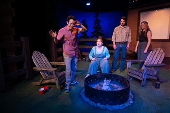 Heroes of the Fourth Turning provides this audience living in an area known as one of the most liberal and progressive in the nation the rare opportunity to walk in the shoes of those we often see as "them" in our currently politically divided nation. As much as we personally might disagree with many of the positions being so ardently proclaimed, we soon begin to understand that there are many degrees of differences among those we so often want to categorize as all the same–much as many on the right certainly feel about those they see as the radical left. Returning young alum Teresa represents in some ways our worst nightmare of those on the far right–a young, cocky, sure-of-herself blogger for an alt-right site whose personal hero is Steve Bannon. Sarah Thermond gives an award-worthy performance of a Teresa whose arm-waving intensity, emphatic delivery, and almost messianic charisma is mesmerizing to watch while her message is often nauseating to anyone with even a slight bent to left of center politically and socially. Her Teresa is always on the soap box and speaks to her three friends in the volume and manner of addressing a huge auditorium. Teresa is evangelical as she describes her full, undying belief in William Straus and Neil Howe's generational theory that outlines how in every eighty years or so, history goes through stages that end in a "fourth turning" of "crisis" where "heroes" stand up to fight (with arms and ammunition if necessary) to save democracy. She adamantly believes that we are now in that stage and that she and her friends are the Millennials who must be ready and prepared to be the fighting heroes to defeat the progressive left. Teresa's world is one of "we/they" and "blow for blow," where being "empathic" to anyone on the other side "breeds complacency" and is "politically irresponsible." However, Teresa's three friends–all whom give at least lip service to her repeated declaration that abortion is "murder"–do not all fit neatly into her band of waiting heroes to take up arms. Justin, whose cabin is the site of the late-night party-of-sorts, has chosen largely to withdraw from society. He believes that the best way to defeat "the nice young liberal people" who are "trying to wipe us out" is to "block them out [and] focus on the Lord," "try to outlive them," and "bake bread, make wine, and work the earth." Will Livingston's friendly, country twang, easy interaction with his nearby guitar, and overall quiet, easygoing nature cannot hide the stark dichotomy of the pistol he carries in his back pocket or his hateful spew against all LGBT people. Kevin is in many ways the opposite of Teresa, even though he so wants to be one of her heroes and to prove to her that he is a real warrior. Kevin not only is a drunken mess much of the evening, but his own sense of self-worth is on the other end of the scale from Teresa's overblown ego and self-confidence. "I think there is a demon in me ... I'm not OK ... I'm the worst," he moans and cries in many different ways (often with alcohol-enabled, remorseful tears while wallowing on the ground). He has questions that range from why Catholics must love the Virgin Mary ("Why do I feel so angry about [her]?") to why Catholics must always be conservative politically–questions that show he has both doubts and curiosity while he also struggling to be as hardcore as he thinks Teresa wants him to be. Tim Garcia is magnificent as this blubbering mess seemingly on the verge of a total breakdown. His body seems to be made of rubber as he twists and turns his bony hands, flails like a madman with his arms, or wraps his torso into a near pretzel, all the while raising with pointed clarity questions that make his friends uneasy. The character who has perhaps the most conflict with the arch-conservative belief system she still from time-to-time purports is Emily, daughter of the president-to-be and victim of a debilitating, unnamed disease (most likely Lyme disease). Even as she struggles to walk a few steps with cane in hand or bends over gasping in sudden attacks of sharp pain, April Culver's soft-spoken Emily exudes a sunny disposition, constantly assuring, "I'm OK; I'm OK." But weak she is not as she quietly but adamantly suggests that some of the people she has met on that other side of Teresa's great divide (e.g., a woman who works for Planned Parenthood) are actually "kind," "altruistic," and "good"–claims that lead Teresa down a path on the verge of equating Emily's more liberal friends to Nazis. Emily is a believer in practicing empathy even for those with whom she fundamentally disagrees. Emily's fevered dream born from that empathy for a Black woman seeking an abortion gives actress April Culver the opportunity to give the most stunning and disturbing performance of the evening. Into this mix of twenty/thirty-something friends who waver between moments of playful re-bonding and periods of pointed, hurtful clashes comes sixty-something Gina, the now slightly tipsy honoree of the day. Gina is at times motherly to these, her former students (with a "dear" and a "honey" sprinkled around to all). At other times, she lashes out with a sharp tongue, especially when she takes on the beliefs of Trump/Bannon-loving Teresa. Gina is a self-reported "Goldwater Girl" who at one time wanted Pat Buchanan to be president. However, she is appalled and expresses deep disappointment in the alt-right declarations of her once-star-pupil, Teresa, setting up a war of words and insults between these two conservatives that would likely make any such meeting between a liberal and a conservative seem mild in comparison. As this representative of what the Republican Party once was, Lee Ann Payne impressively employs a slight Southern drawl as Gina soothes and supports her former students while at the same sharpens her tone to counter the more recent Trump-era beliefs that are even more far right than her own faith-and-conservative-based ones. Thus, 