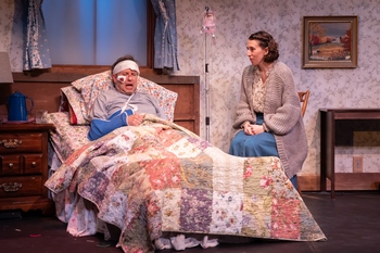 Uber-popular novelist of Victorian romances, Paul Sheldon, wakes up in January of 1987 to find himself in a strange bedroom and with both legs broken and his right arm in a sling. He discovers that his car went off the road during a massive blizzard near Silver Creek, Colorado, where he has just finished his latest manuscript. He is soon grateful that a local woman–and resident of the rustic, woods-secluded home where he evidently is now–saw the wreck, pulled him out of the car, and brought him to her home. And it seems that his good luck out did itself in that Annie Wilkes is both a former nurse (and thus able to care for him) and his self-proclaimed "Number One Fan" of the many novels about a nineteenth-century woman named Misery Chastain. To show his gratitude to Annie, Paul has shared the typed manuscript of his latest novel which–unbeknownst to Annie–is to launch his "post-Misery" period. Thrilled, Annie sits up all night listening to Liberace and reading, only to burst in the room screaming, "Every other word is the F-word ... My mother would have washed your mouth out with soap." Her wrath is visible, and there is more than a hint that she is not going to tolerate her favorite author ruining his (and thus, Misery's) reputation in this way. That the manuscript will never leave this house is not yet ordained– but the writing seems already to be on the wall. However, to our and Paul's surprise, Annie returns the next day a bit more forgiving, especially when she walks in with a copy of Paul's latest published book, "Misery's Child," which the local bookstore has reserved especially for her. As bedridden Paul signs her copy, "To Annie Wilkes, who by saving me, saved Misery," little does he know that this obviously quite obsessed fan will soon believe that she has been ordained by God to be Misery's savior once she realizes how this latest book actually ends. Anyone who has ever read a Stephen King book must know that given we are barely fifteen minutes into the ninety of this stage version, there are still many terrible, horrible things to happen. To reveal any more of what happens over the next days and weeks of Paul's confinement and of Annie's overseeing his road to recovery would ruin chances for future audience members to have their fair share of the ever-mounting surprises and shocks–for both Paul and Annie. A perky but pesky sheriff named Buster (Zachary Vaughn-Munck) also keeps knocking on Annie's door, adding a bit more suspense as he is searching for any clues of what happened to the now-long-missing, famous author from New York City. A perennial favorite of local stages, Maria Marquis, is absolutely the hilt of both charming and creepy, sweet and scary, motherly and monstrous as Annie Wilkes. Her Jekyll-Hyde sides are fascinating and frightening to watch as she sometimes switches persona in the opening and closing of a bedroom door. One moment she can be cooing comforts to her patient, assuring him that as his greatest fan, she has now been granted by God a chance to make him and Misery "the envy of the world." In the next, such a rage can so overtake her that her hands shake uncontrollably, her eyes seem to emit fire, and a trembling, tumultuous voice sets forth a torrent of threats. And do not think that this quite slender, somewhat delicate-looking woman does not have fierce strength in those arms. Just wait! The power of William Goldman's script, Kimberly Ridgeway's direction, and especially Maria Marquis' skill is that this Annie actually more often than not elicits our sympathy, understanding, and even pity in between horrifying us with her demonic desires and plans. Hers has been a lonely and isolated life–and it seems that her one and only friend has been Misery Chastain. As Paul Sheldon, Christopher Mahle also rises to stellar heights in a prone position in bed as he portrays the pain of a debilitating accident, the fear of what may come next from a woman totally obsessed by his fictional character, and the sheer drive to survive in a situation where more and more, to do so seems impossible. When given a creaky typewriter and a ream of his favorite paper, his Paul cannot resist beginning to crank out a new manuscript with zeal and ardor, even as he is looking over his shoulder to see what misery (excuse the pun) may be coming his way next. While not on stage, a major character of the play's action is Christian Vaughn-Munck, the production's fight captain whose resume is long and revered here in the Bay Area. Without telling too much, suffice it to say that there is a lot of physical action that becomes very realistic in sound and sight. That there are no actual injuries in all the mayhem that ensues is a credit to his skill. As scenic designer, Gillian Ortega places us in the backwoods of Colorado and in a home that gives us a good idea–along with the properties designed by Kevin Davies–of its owner. Roosters by the dozens adorn the kitchen wallpaper along with an iron pig hanging on its walls; a deer's head hangs in the parlor along with a large, framed picture of Annie's favorite author, Paul Sheldon; and a large crucifix dominates the sparsely decorated bedroom. All and more tell of a woman still living much like her mother probably did. The three rooms spin slowly on a turntable, usually as we hear the piano mastery of Annie's other fave in life, Liberace. There are several times when, during costume/scene changes in the ninety-minute, no intermission production, that the twirling of the stage from empty room to empty room becomes a bit annoying and a momentary energy drainer. Edward Hunter's lighting also places us both in dense woods and in the midst of mystery and dread. Defining forest shadows and spooky, dappled lighting in the midst of night are coupled with startling light as Annie makes the latest discovery bound to result in something not too pleasant. The sounds of midnight storms are just one of the effects Samuel Fiedel masterfully
