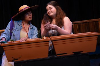 The plays are all written by members of the Pear Playwright Guild, a group of Bay Area playwrights who meet every two weeks to help workshop each other's plays. The variety of tone/setting, reality/fantasy, serious/funny is a wide range among the eight plays, this year with four each directed by Arcadia Conrad and by Troy Johnson. Six screens variously shaped like art pieces hang on a wall to provide vivid projection backgrounds for each play and are designed along with scene- and mood-setting musical selections by sound and projection designer, David L. Hobbs. Simple, easily assembled, effective set designs by Louis Stone-Collonge quickly move into place while Pati Bristow's animal, human, and otherworldly costumes magically transform the cast members from one play to the next in mere minutes. A partying sister mistakenly drinks her brother's green-glowing concoction, sending her and the whole world into chaos in the initial offering of the night, Accidental Immortal, by Sophie Naylor. Both this opening piece and the evening's final, The Tarot Reading (also by Naylor), in which a fortune teller's cards come into full life, are frankly this year's weakest slices of the Pear offerings. Neither really works well in terms of script nor acting; and each is rather awkwardly presented with not much power to draw an audience's attention or interest. However, the good news is that the other six plays inside these bookends are a delightful collage of appealing premieres. Bezachin Jifar and Vivienne Truong leave strong impressions as they portray two ex-spouses–Donny and Ruby–returning from the funeral of Donny's more recent wife, Sharon. Christine C. Hsu's Cleaning Up is a heartfelt, few minutes of their remembering the brave battle Sharon fought and lost against cancer–one that Ruby also underwent more successfully alongside Sharon as the two wives of Donny became unlikely best friends. Troy Johnson's direction is particularly powerful as each actor employs silences, far-off looks, and quick but tentative physical contact to convey unsaid messages and to suggest new possibilities. Memories also play a large role in Bridgette Dutta Portman's Fertile Soil as a mother Susan (Vivienne Truong) and her daughter Leah (Jenna Ruby Marvet) prepare the soil to plant flowers and herbs in Leah's yard. Leah is largely unengaged, becoming only slightly more animated when she suddenly finds a millipede "with a million legs" or a yucky earthworm with "no legs at all." But as her mother tries to console her for reasons soon to become clearer, Leah also finds curious things in the soil, like a basil plant's label, a pencil, and a peace-symbol earring. Unseen by them is the twenty-something (much the same age as Leah) Iris (Lizzie Izyumin), who appears in and out of our sight wearing outfits of a period when hippies and love power were all the rage. For each item Leah finds, we witness how it was once lost. A further item ties the two young women together and creates the foundation for a story that is both heartbreaking and uplifting. Characters from "The Three Little Pigs," "Little Red Riding Hood," and an IPhone's Siri combine in one of the evening's true highlights, Paul Braverman's Brick House. The lazy Pig 2 (Lizzie Izyumin) and her equally easygoing brother Pig 3 (Arohan Deshpande) are having fun mocking their bricklaying brother Pig 1 (Bezachin Jifar), whom they believe is way too cautious and much too worried about the Big Bad Wolf. After all, their new best friend Fox (Vanessa Alvarez) has assured them that the Wolf is long gone from these parts, making it OK that Pig 2 is rebuilding her house once again with straw (but this time using spit to hold it together better) and that Pig 3 will rebuild his stick house, this time with twine. The three Pigs bring hilarious antics, voices, and oinking grunts to their parts (and wait until you see their dinner manners). There are laugh-out-loud twists and turns to come in this turned-upside-down children's tale, with Siri (Jenna Ruby Marvet) ready to step in and take the starring role. The next particularly strong entry in the evening's lineup comes from Greg Lam with, and it's another update of an old tale, this time a remaking of the final, tragic scene of William Shakespeare's Romeo and Juliet. Juliet's Post Credits Scene opens with the distraught Juliet (Jenna Ruby Marvet) about to take the plunge of a knife into her gut when she is interrupted by none other than Horatio (Bezachin Jifar), one of the few surviving, final-scene characters from the Bard's Hamlet. Horatio arrives with a bound copy of the complete works of Shakespeare with the mission to work his way through the tragedies in search of a heroine to save from the playwright's deadly script where "we are all puppets of a hidden master." His plan: Find the girl and head toward the happier plays set in places like nice forests. Lam's script is a hoot for any Shakespeare lover as we accompany these two, who try to outwit the words embedded in the pages of his famous plays. A backyard meeting of two school moms–both volunteers for this year's fundraising book fair–becomes a setting for an uneasy debate about what constitutes child abuse versus parental discipline. Lizzie Izyumin and Vanessa Alvarez bring different perspectives into Backyard by Cherielyn Ferguson as the two await the arrival of the school's star volunteer and now candidate for the school board, Robin (Vivienne Truong). While we never see Robin, we certainly hear a lot from her from the backyard next door. The playlet raises important and troubling questions but leaves any resolution up to us as the audience. The evening's one solo-performer play, I'm Not Her by Teresa Veramendi, is perhaps the strangest of all the offerings and also the one most impressively enacted. A young woman dressed in an extremely tight, hip-hugging, black dress with black fishnet hose takes a drag on her cigarette and explains, "I'm not her ... You may think