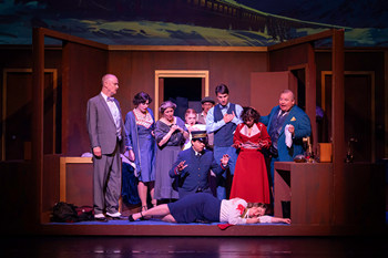 Having just solved his latest, trying case in Syria involving "an army officer, a beautiful girl, and a bad check" that "did not end well," Monsieur Poirot is in Istanbul for a few days of winter vacation in 1934, only to be called back to the home office in London to handle an emergency. The only way to get there is on the famed Orient Express, "the greatest train company in the entire world," so says his old friend and company manager, Monsieur Bouc, who offers Poirot his private cabin on the totally sold-out train. As he meets the other passengers in his car–passengers with accents from Russia, Sweden, Scotland, Hungary, Germany, England, and America and with titles like Countess, Colonel, and Princess–Poirot tells his friend Bouc, "I sense something is wrong, that there is tension ... someone does not fit in ... I am frightened." We too know something is amiss. After all, this is an Agatha Christie creation which means there is definitely a planned murder afoot, with one of the ten on the train (not including Poirot, of course) to be killed and one to be the killer. Also, before the lights and curtain came up, we heard voices from a scene play out in the dark where a little girl was being put to bed by her parents and nanny, only to scream in evident terror as she was abducted from her bed by a stranger. It does not take a world-famous detective to deduce that the girl's misfortune is somehow going to be connected to whatever is soon to happen on this train. And even as the train leaves Istanbul, there are clues that there are reasons to wonder with suspicion about the various passengers. One claims to be receiving letters of death threats and seeks help from the famous detective on board. A woman slaps another passenger for being too fresh and suggestive with her. One irritates the other sleepy passengers to no end with her midnight singing of "Alexander's Ragtime Band." We hear a nervous young woman tell her companion, "I'm frightened; we shouldn't be doing this." And then there are the repeated reports of a second conductor rushing through the narrow corridors on a train that in fact has only one conductor–a supposed conductor whom one female passenger wakes up to find in her room. And all this happens before the Christie-required, middle-of-the-night murder–discovered the next morning and setting Poirot into action, where interviews and a mountain of clues begin to mound into a tall pile of possible suspects. Michael Champlin could hardly be more perfect as the embodiment of the neatly dressed, purse-lipped, somewhat dandified Hercule Poirot–a character probably most audience members already feel they personally know through film and television depictions by a long line of actors including Albert Finney, Peter Ustinov, Tony Randall, Orson Wells, and John Malkovich. His twitching of the famous, trademark mustache; his exacting pronunciation of words in Belgian French; his hilarious knee-raised, funny-armed run through the corridors; and his penchant to flirt with subtle and polite airs around a beautiful woman–all these and more are signs that we are watching on this stage a Poirot whom we fondly recognize. Equally delightful and stage-commanding is Zachary Vaughn-Munck as Monsieur Bouc, the big-hearted train manager whose undying admiration of his fellow Belgian friend Poirot is genuine, often to the point of comical. His range of "eeks" and "ahhs" are only outmatched by grand and gigantic gestures as he swoops in to soothe a passenger's complaint or to quash a passenger's sudden rudeness. His always attentive sidekick and the train's conductor with lovely French accent and manners is Michel (Patrick Rivera), whom we first meet as a rushing, bumbling, hotel waiter with the kind of 'héhéhé, 'hon-hon-hon' laugh often used to mimic the French. And then there are the passengers, each worthy of a paragraphed description of their oddities, bombastic manners, and/or stereotypical depictions of national origin. Kyle Dayrit bursts into any scene his Samuel Ratchett populates as a rude, demanding, loud-mouthed American importer/exporter–one who wrongly believes his offers of big cash can get Poirot to be his onboard bodyguard of sorts. His secretary, Hector MacQueen, is quite his opposite, with Brandon Silberstein ludicrously embodying the guy who seems to run into every doorway he enters or person he passes, who stutters just enough to announce his nervous nature, and who is clearly naïve about most of what is happening around him. Linda Piccone does not miss a chance to display the royal airs of the now-exiled Princess Dragomiroff, who is quick to make her opinion known but also shows sympathy for those even less fortunate than she, like her companion, a prone-to-fright-and-tears Greta Ohlsson. Brigitte Losey's German Greta is a returning missionary from Africa, who is on her knees praying about as often as she is in any other position–a woman "married to God" and says Jesus showed up in her garden to tell her to help the babies in Africa. In no way like Greta, Helen Hubbard (Patty Reinhart) is a Chicagoan who seems to thrive in the spotlight of any conversation she engages in with a voice piercingly loud and a constant demand for immediate attention. Her flirting eyes quickly target the cute conductor Michel, with no care in the world that her fourth husband is not joining her on this trip. Also traveling without her husband is Countess Andrenyi (April Culver), a physician now quite Hungarian but with a background much humbler than Countess and maybe not natively from where her heavy accent points. The final two passengers–and thus final two either victims or suspects–are the quick-to-anger Scot named Colonel Arbuthnot (Will Livingston), who is extremely protective in a chauvinistic manner of the woman traveling with him, the English Mary Debenham (Michelle Skinner), who appears always nervous as if looking over her shoulder for someone/something. With that host 
