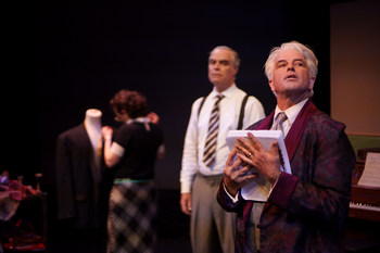 Two of the greatest, most-beloved film comics ever had never worked together until in 1952, Charlie Chaplin invited Buster Keaton to join him in a couple of scenes of what was to be Chaplin's last American-made movie, Limelight. In his new play Chaplin and Keaton on the Set of Limelight, Greg Lam imagines what might have transpired in the dressing room between the two silent-movie giants as they meet for the first time in fifteen years, reminisce fondly about the days before talkies, and argue vehemently about their opposing philosophies of the purpose and value of movies. The Pear Theatre's two-hour (with intermission) production is a fascinating, educating, and highly entertaining world premiere in which funny and thought-provoking walk hand in hand and the performances of the two leads are nothing short of striking. After the talkies led to the demise of the silents, Charles Chaplin continued to write, produce, direct, score and star in his own movies, with each starting to take more and more years to conceive and actualize. At the same time, he was not shy with his own views about the injustices of the world. He even tried–unsuccessfully, unfortunately–to use his 1940 movie The Great Dictator to warn the world about the rise of Hitler. By 1952, he, like so many other Hollywood greats, was under great suspicion by Joseph McCarthy and an increasingly hostile press, especially since the English-born Chaplin had never become an American citizen and was rumored to be Jewish (which he never denied but definitely was not). Facing probable deportation, he viewed Limelight as his farewell movie–one he meant to be his greatest ever. The interim years after the silents had been quite different for Keaton. Bad judgments about contracts where he had no control of his career led to drinking problems. However, he still found ways to share both his stunt and his comedic talents through the circus arena and increasingly through the upstart threat to movies, television. His fame had definitely faded a bit by the time his old friend Chaplin asked him to be in his latest movie, with Buster hoping this could be the beginning of a new collaboration to revive their comic antics of old. In this show, we see that by 1952, Chaplin and Keaton have wildly different views about moviemaking and what audiences want versus need. Buster firmly believed movies are solely to be "entertaining," with laughter to be the goal of gags galore. Charlie sees filmmaking as "important," with "laughter not enough these days." In the post-Hitler/Holocaust world now in the midst of a Cold War and so many like himself suspected to be Communists, Chaplin asserts, "There is a battle for the soul of this world that has to come first [in moviemaking], before art or laughter." Greg Lam's brilliant and often innovative script highlights these two opposing views while also leaving plenty of space for laugh-out-loud comedy as well as wonderful, live and film glimpses of the silent-movie stardom of both men. From the moment he walks into the dressing room, David Scott knocks it out of the ballpark in his portrayal of the sixty-something Chaplin. The first thing noticed are perfectly round eyes that pop and sparkle with volumes of expression–bulging eyes like one remembers from silent screen close-ups. Every move he makes is dramatically exaggerated, often purposefully tongue-in-cheek by a man who does not care that this is only a dressing room and treats it just as he would a screen set. With a voice that vibrantly swings an octave or two in the matter of a sentence and that rolls in hills and valleys with an effect a bit effeminate when combined with hand movements that flit and flutter, this Charlie Chaplin is no longer just The Tramp, but has matured into an actor/man whose personality overflows with charisma. But this Charles of 1952 also has his serious and stubborn side, especially when it comes to his priority of message-making over just comedy in his final venture into filmmaking. Gingerly but firmly he reminds Keaton who is in charge of his masterpiece when Buster makes suggestions on how to heighten the humor for his cameo moment. Humor is definitely to take a backseat in Chaplin's vision. With great passion he warns Keaton against the "fear mongering, public aggrandizement" currently occurring in the U.S. for which he asserts, "America will be the worse place for it"–clearly an inclusion Greg Lam inserts to ensure this play about the 1950s is also timely and relevant for 2024. Even with several slight stumbles of his lines on opening night, David Boyll is also overall impressive and memorable as Buster Keaton. Our first and lingering impression of his Keaton is a mouth that remains for long stretches of time a stationary, straight line across his expressionless face, giving proof of why Keaton's trademark face led to his nickname as "The Great Stone Face." At the same time, his Buster is full of twinkle and life and has innumerable ways of drawing our laughs just by being in our presence, much like his screen character of old. He particularly loosens up when around Chaplin's fast-paced, rapid-speaking assistant, Beverly, played by Laurie Goulart with her own immense array of subtle glances and telling expressions to draw many, well-deserved laughs from the appreciative audience. In and out of the dressing room also come Claire Bloom–the co-star and tragic heroine of Charlie's film–and his latest-of-four wives, Oona. Both are barely out of their teens, dashing in looks, with airs of dignity and elegance. Both are also ably played by the same actress, Selin Sahbazoglu, leading to a riotous scene when Keaton mistakes wife for actress and decides to unload his pent-up, not-too-complimentary thoughts about the great Charles Chaplin. As the two comic giants remember what it was like to be on the movie sets of the twenties or as they recall favorite scenes and moments, their famed characters often appear (unseen by them) a