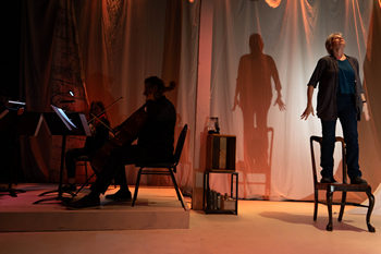 Accompanied by a string quartet and music composed by Sarah Kirkland Snider, Ellen McLaughlin launches into Penelope, an ancient, epic story (with some modern edits) of this unnamed woman and her damaged, also nameless ex-husband, a work she created in 2008 for the Getty Museum. With sea waves and a boat's sails at her back, she sails into a journey where he becomes the wandering and lost Ulysses and she, his faithful wife Penelope, awaits his return from years away from home. In the intimate setting of The Pear Theatre's co-production with Bootstrap Theater Foundation, award-winning playwright and acclaimed on-and-off-Broadway actor Ellen McLaughlin astounds the audience with a ninety-minute performance that is engrossing and enchanting, heartbreaking and heartwarming. As she looks at a blank chair where we are told sits a man who now appears like "a starved animal who's finally found his sanctuary," she notes with a far away and almost vacant voice, "We are waiting for him to arrive, both of us ... to come home ... days, weeks, months." As will be the case as she both reads and relates in her own words the story of Ulysses, the man in the room and the man in the book in her hand become interchangeable as their stories intermingle in details, time and geography. After hearing from her friends who wonder why she is harboring him–a man who was such a liar and bastard those many years ago–she half-talks, half-sings, "I'd give a lot to hear him tell me lies like that again." As her voice suddenly rises in volume and register, she implores him, "Try to remember." And as she relates the story of Ulysses–a story "I do make up ... [to] make it mine, to make it his"–she achingly admits, "I miss him so much ... I think we both miss him." She seems to sense that there are horrible reasons why he is so adrift, unable to come home yet. She sings in soft, hypnotic lines–all the time accompanied by the beautiful strings of the Ives Collective–that, like Ulysses, "The world wants her travelers to stay lost ...no, no, you can't go home ... the world is never done with you." There are prices to pay for deeds done. Jumping on the empty chair as she attempts to enter the mind of the man sitting there, she describes with gnashing tones the terrible slaughter of Troy by Ulysses, hoping to stir memories of what she suspects is "the terrible business of his own story." Mixing the translated words of Homer, her own imaginations of likened events that happened for this man during his time at war, and songs that reflect and expand on both, she leads him through an odyssey and stops with the pleasure-producing Lotus Eaters, with the sorceress and goddess (and lover) Cerce, and with the nymph Calypso who reads his fortune after he selects the Hangman card from a Tarot deck of cards. There is also a side trip into the Underworld, where she sings in a ghostly voice, "Dead friends, forget me ... I've forgotten you," as both the Ulysses of old and the Ulysses sitting in his chair are clearly haunted by the men they left behind dead on the fields of battle. And while Ulysses has his stopovers, our unseen ex-husband, ex-soldier has experiences hitchhiking, wandering around in silk pajamas, and being rescued by a small girl on a soccer field. Or at least he has these and other adventures as imagined by his ex, the storyteller trying to help him recreate the path that got him to the house they once shared. As her story progresses and switches between a book's pages and her images of this silent man's story, lines both sung and spoken illustrating both stories are emotionally stirring and plaintive–lines like "Just take my hand, I will lead you home" and "Why should I have been saved for this?" Adding to the feelings of any one song or story is the score, which is beautifully played by the string quartet, there often being much like a Greek chorus reflecting in notes things that words alone cannot adequately communicate. Not only do Susan Freier and Kay Stern on violin, Jill Van Gee on viola, and Stephen Harrison on cello mesmerize the audience with their music, they each become sources of an entire soundtrack of special effects through strings picked, bows rubbed on music stand, hands slid across the wood of an instrument, and more. The result is that we hear sails unfurled, birds singing, and wind whispering. While the stage just a few feet from the audience is mostly blank, the set designed by Giulio Perrone is nonetheless powerful in providing a setting where Lisa Rothe can nimbly, sensitively, and powerfully direct the sole actor to capture our every minute of rapt attention. A single lantern lights the way for both stories being told as lacy curtains unfurl to become sails or to become a remembered mother's shawl. The sea's ever-presence of waves under a night's sky of shooting stars become a landscape for imagination and escape as created in video by Sinjin Jones, who also has designed a lighting scheme that seamlessly and wonderfully shifts moods, locations, and our focus to add more meaning to the words we are hearing. As Ulysses reaches his final destination where he can at last seek forgiveness for all his past atrocities, we learn where this journey has taken both the man and the woman in front of us–one seen, one not. What is clear, they–like us–are not quite the same as any of us was in the story's onset. For our part, we now have new memories that will stay with us for a long time of a stunning performance by both actor and musicians in a co-production by The Pear Theatre and Bootstrap Theater Foundation, a Penelope whose four scheduled stagings are much too few. Penelope, a co-production with Bootstrap Theater Foundation, runs through March 30, 2025, at The Pear Theatre, 1110 La Avenida, Suite A, Mountain View CA. For tickets and information, please visit www.thepear.org. |