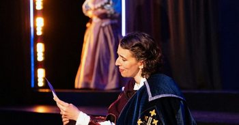 Everyone even vaguely familiar with any written, staged or filmed version of Rostand's Cyrano carries one image in mind of the title character: a large nose that becomes the brunt of jokes, puns, and pranks–some made with much pride and self-deprecation by Cyrano himself and others leading to Cyrano drawing a sword to prove his widely held reputation as a deadly dueler. Gone in this Lo/Tachis adaptation is any reference to the presence of a bubble-blossoming mound on Cyrano's face; and gone is much of the resulting, over-the-top hilarity that tends to spill forth, often with vaudeville-like banter and buffoonery. The reason this Cyrano is reluctant to reveal his deep-felt love for Roxane–his closest friend from childhood–is not related to his looks, but because Cyrano is a she; and there is an unsaid implication that such same-sex love in seventeenth-century Paris is not to be spoken aloud by Cyrano to her Roxane. The switch leads to humorous situations and remarks in the adapted script and certainly to a different perspective that is intriguing; however, the script and director (also Max Tachis) must often rely on other means for seeking the laughs that other Cyranos have received. One of the innovations of this script that works the best is the inclusion of a four-person Ensemble that acts much like a Greek Chorus, making snarky, snippy, or just plain hilarious comments on the side and switching roles multiple times as rowdy theatre audience, gossiping townspeople, war-weary soldiers, googly-eyed admirers of Roxane, and even rapping bakers using French buns as microphones. Lines are often delivered one or two words at a time as a spoken line shifts in split-second perfection from one to the next person. Multiple vocal ranges, styles and tones are employed as personalities shift along wide ranges. Jonathan Amores, Chayenne Greenberg, Patrick Rivera, and Zachary Vaughn-Munck becoming a starring role in this Cyrano–one eliciting many of the evening's biggest laughs and one helping pick up the pace and the energy level that at other times seems a bit slow and low-key. (Vaughn-Munck is especially a hoot as Emile, a clownish announcer/town crier loyal to the corrupt Count who is quite willing to spout forth "fake news" to bolster the Count's inflated ego.) Maria Giere Marquis brings spunk and spark, brass and bravado to the title role as a woman in pants whose reputation as a fearless fighter of entire regiments of seemingly stronger men becomes fodder for an Ensemble to stumble over themselves in expounding and exaggerating her feats. One of the best moments of occurs when she irritates the pompous fop, Count de Guiche (Emery Mulligan), to the point that he challenges her to a duel. As she fights him without a sword in hand, she dodges his flimsy thrusts while reciting first an insulting limerick, then a smearing sonnet, and finally a six-verse villanelle–all created on the spot before she overpowers him with not only words, but now with sword in hand. When Cyrano's loyal friend with a penchant for bad booze and writing damning articles against the Count, Ligniere (a gender-bending Brittany Mignano), introduces her to a meek but strikingly handsome cadet named Christian (Jonathan Covey), Cyrano soon learns that here is her rival for Roxane's affections. At first, as Roxane is trying to tell her best friend Cyrano about someone who has captured her love, Cyrano's eyes sparkle and her heart seems ready to burst out of her chest in hope it is her. When she hears it is the handsome but tongue-tied cadet she has just met, she is crest-fallen and near uncharacteristically speechless. Soon afterward, when Roxane asks Cyrano to encourage the shy boy to write about the love she sees in his eyes, the disappointed but ever-devoted Cyrano cannot refuse her. That pledge sets up a deluge of letters coming from her own heart but sent in the name of a cadet who can barely muster a stumbling phrase of "I love you" to win the heart of a Roxane, who craves not just beauty but also wit in a man. The words and tones of delivery that Cyrano creates and often delivers like a background puppetmaster for a lip-syncing Christian outside Roxanne's window would make Shakespeare proud. As the ruse continues to work and solidify the love between the other two, Cyrano continues relying on words to be her solace and her silent way of being the loyal, true lover whom Roxane really adores but does not realize. As Roxane, Vivienne Truong is elegant in manner and word and always sincerely gracious in gratitude to Cyrano. But at the mention or sight of Christian, her Roxanne flutters and flits and waxes in similes and metaphors as she act like a teenager bursting with anticipation of her first kiss from the person she believes is truly the love of her life. As the story builds toward the climactic turning point of a bloody battlefield, both the original playwright and the these adapters populate the scenes with other characters who often add spurts of levity. Jeremy Ryan is first a bumbling and hysterical disaster of an actor, Montfleury, whom Cyrano hates because of his massacre of Shakespeare ("What light through yonder breaks my window"). Later, he is a wannabe poet chef, Ragueneau, whom Cyrano helps become a proud poet of culinary versed recipes. His cream puffs and silly lines are enough to win the heart of Roxane's protective companion, Diana, played with eyes of suspicion and distaste by Lisa Burton Guevara whenever Cyrano approaches Roxane but with eyes full of desire when around Ragueneau. The adapters have curiously included a new, rather central character in the form of Countess de Guiche, played with determination and often grit by Gabriella Goldstein. First a mirror of her silly, puffed up, and arrogant husband, the Count, the Countess undergoes the most dramatic of character developments of this adaptation, bringing surprises of motive, courage, and love interests that once again add gender-bending turn