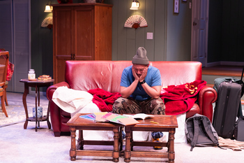 Aspiring playwright Jay has just lost his job at American Theatre, his girlfriend of eight years recently walked out on him, and his notebooks are full of empty pages as his writing slump is now feeling permanent. That was not the greeting he wanted but probably the one he expected. After all, Mary Beth and his deceased father, Ronaldo, immigrated to the U.S. as a young couple from their beloved Philippines in order to make a good life for not-yet-born him. And here he is at 40 asking to move back home with his pockets and life totally empty. This is Jeffrey Lo's set-up for one of the funniest, yet most heart-felt shows I have seen in a long time. Hillbarn Theatre & Conservatory is presenting the world premiere of Lo's latest play, Writing Fragments Home, in a production that is very much a love letter to his own mother, a Filipino-American nurse, and to immigrant parents of all nationalities who arrive on these shores hoping for the best lives possible for their current or yet-to-be-born children. With a stellar cast of five under the direction of Reed Flores, who pumps both imaginative jocularity and emotion into scenes soliciting loud laughter and eventually silent tears from the audience, this is a production that is definitely a must-see. To ensure her son does not take up permanent residence, Mary Beth plops a couple of blankets on the living room couch, telling Jay his old room is off limits. As the first week passes, it does not appear to us or to her that he has done much more than sleep in his pajama bottoms with beanie on his head–except to make a mess, leading to one of their many and ongoing blow-ups. To witness Jomar Tagatac's Jay, one can only think of an overgrown teen who is in a seemingly permanent funk full of pout and poor-me. To watch Jen Cuevas' Mary Beth, one is just waiting for the next exasperated and irritated outburst of "I told you so" or "Clean up your mess." Both provide the audience much fodder for laughter–especially those of us who are parents (or children) and can imagine ourselves and our reactions to the same situation. Jomar Tagatac and Jen Cuevas are fabulous in their roles. There is a tension between the two that is clearly not new-born; there are buttons each knows how to push to set the other one off, and there is a love that is evident in its depth, even when the spoken words or their shouted volume seem to indicate otherwise. Jay is haunted by dreams that at times are like recurring nightmares–memories of the scene when his ex, Jasmine, walked out on him, or of the series of "thank you, but no's" that he heard from director after director about his submitted drafts of play after play. As he dreams, the people in his dreams suddenly appear to us (but not to him), with Jasmine, for example, hovering over the tossing and turning Jay while she tells him over and again, "You aren't the person I fell in love with ...You were someone with ambition ... the man I fell in love with was a dreamer." Or in later dreams, two rather pompous theatre directors exchange their "sorry, no's," explaining "our audiences" / "our funders" ... "are not ready for you." But even as these dreams seem to zap his energy and motivation to move ahead, Jay finally picks up his pencil and writes a few words into a notebook. And as he does, his words become real life. "Outside the auditorium, Mitch appears–... his right arm in the air." Ta-da, unseen by Jay, a guy walks in the front door and raises his right arm obediently but with a curious, puzzled look on his face that seems to imply "Really?." "After a moment, Sage enters ... [her] left arm is up in the air." And a young woman immediately appears from behind the living room's gold drapes, raises her left arm, and looks at Jay waiting more instructions. As Jay writes, words come from their mouths, only often to be taken back and re-said as Jay shakes his head frustrated and erases what was just written/said. "Yo" (guy). "What? Yo? (Jay, erasing) "What up girl!" (Guy) "Gross" (Jay, rubbing out as fast as he can). "Hi" (guy) "No" (Jay, pencil going scratch, scratch). And so it goes as the audience can hardly contain themselves, especially as now there are also body, mouth, and eye movements that the two would-be lovers do and re-do at the pencil's command that are usually in reality more comic than romantic. Jamiel St. Rose and Brigitte Losey are brilliantly hilarious in every respect as Actor and Actress, respectively. What becomes particularly uproarious is when Jay sees them for the first time; but even funnier, he is not able to do so until after Mary Beth walks in and wonders, "Who are your friends?" After a torrent of "Oh my God's" from the near-terrified Jay, the presence of his written creations becomes a bit old hat for both son and mother as we continue to laugh at the absurdity, especially when Actor walks in dressed exactly as Jay in a scene he writes too close to home or when Mary Beth decides what Jay is writing is too ridiculous and starts to act as a director, giving Actor instructions to make the scene more realistic. However, Jay's writing still continues to be very real. His frustration grows even as his mother tries to convince him she wants him to succeed as a playwright (and no longer as a nurse) and offers more and more encouragement (usually through suggestions he does not want to hear). But Jeffrey Lo is not done with these two yet, and what follows is a story that is not just funny, but one that is intriguing, educating, and heartwarming about what it means to be an immigrant–especially an Asian immigrant–in the United States. Into memories of both mother and son enters the fifth, very poignant character of the play, Ronaldo, the long-deceased, beloved husband and esteemed father. Jepoy Ramos emotes a calmness, an understanding, and unconditional love as he appears in his son's memories and daydreams while in Mary Beth's memory, he is delightfully once again a young man full of eager anticip
