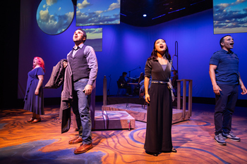While there is no overall plot, almost no spoken dialogue, and no characters whose identities remain the same throughout, each of the sixteen songs is a complete story unto itself, with one or more people facing a decision, a hardship, or a transition and discovering some new-found clarity or a committed resolve how to move on. Their paths and journeys, occurring any time from centuries past to maybe just yesterday, all have universal and timeless themes and emotions. Together, they ensure Songs for a New World is not just a revue of Brown's incredibly clever, hard-hitting, and meaningful lyrics set to music ranging from pop to gospel, show tune, and jazz, they guarantee that it rips with messages loud and clear that the decisions we make, the choices we take for involvement in our world, and the people we seek to befriend and to love can and will make a difference not only for us individually, but for us as a whole. Cindy Goldfield creatively and astutely directs both the action and the employed movements of the cast in a setting beautifully designed by Eric Olson in which the stage floor is like a fabulously conceived map with distinct markings such as "The Lonely Desert," "The Isle of Regret," and "The Road of Shaded Responsibility" and surrounded by "The Ocean of Desire" and the "Sea of Tranquility." The rippling waves of rivers and oceans and dappled shadows of beaches and forests that appear across this mini-continent are just a fraction of Pamila Gray's array of lighting artistry. In the background is the three-piece band directed by Jad Bernardo whose active interaction, echoing, and duets with the singers make the band a gorgeously intoned fifth partner as the quartet of actors convey the powerful, captivating stories of Brown's compositions. But it is the decision by Cindy Goldfield also to harness the visual potency of six various-sized screens that truly makes Hillbarn's Songs for a New World a production that deserves every seat sold for every curtain's opening. Projected photographs and videos, all designed by Director Goldfield, ring with recent-and-current-event relevancy and transform the words of each song to become messages about the images and headlines we see and read every day concerning our troubled world. When Sidney Matthew Román stirs our souls with a voice that cries out in deep supplication as a sea captain prays for the safety of those under his command ("On the Deck of a Spanish Sailing Ship, 1492"), on stage two, frightened, wave-battered women clutch their babies as we also see projected pictures of immigrants waiting in lines, people packed tightly in small boats, and frightened children whose pictures could have been from yesterday's latest ICE raids. Sophie Oda's deeply affecting soprano seeps into our beings and caresses our hearts as a young woman reacting to the news of her pregnancy. As she sings of "the future of the world inside me" ("Christmas Lullaby"), multiple photos of pro-life and pro-choice protesters flash before us along with pictured locations of a local Planned Parenthood and a "testing for pregnancy" office. In sung notes that strike like bullets, a mother in 1775 searches for meaning in a war she does not quite understand since it has taken away her son from her. As Jessica Coker holds us in stunned empathy for this Revolutionary War-era mother's alternations between grief and anger in "The Flagmaker, 1775," she also sings with a resolve to do what she can to help by picking up a needle and sewing another star, another stripe on a flag. Concurrently, we see photographs of flag-draped caskets and thousands of grave markers at a national cemetery–all taking on increased significance given the events of the past week in the Middle East. In a scene too familiar to anyone who has walked through San Francisco's Tenderloin or Mission District, two down-and-out residents of the street (Coleton Schmitto and Sidney Matthew Román) sing a rousing "The River Won't Flow" and how "you gotta live" and "you gotta do" when that "river never flows for you." As they are joined by the two female cast members in rolling harmonies of "flow, flow, flow," scenes of tent cities and photo after photo of the life-hardened faces of those living on the streets parade across the screens. Each of the four actors has several chances to wow the audience with performances that zing with assuredness, cry out in regret, or even delight with a surprise bit of humor. Jessica Coker sings with fierce energy and melodramatic scorn in a Kurt Weill-flavored "Surabaya Santa," as Mrs. Claus decides to escape the "claws" of Santa Claus. Her gutsy, powerhouse vocals raise the roof as a woman stands on the edge of an apartment building's 57th floor ledge and desperately tries to get the attention of her neglecting husband ("Just One Step"). With a voice that is crystal clear in tone, Sophie Oda impressively and intensely demonstrates multiple vocal variations declaring "I'm Not Afraid of Anything" as a woman realizes how others' fears are holding her back from moving ahead with courage. Time and again, Coleton Schmitto not only makes his mark vocally but also highlights the meanings of songs like "She Cries" and "The World Was Dancing" with expressive eyes, telling poses, and arresting facial expressions that add increased meaning to the words so well sung. Sidney Matthew Román's tenor voice haunts with its raw vulnerability combined with radiant hope as a dead soldier coming to grips with his fate on a journey to his afterlife in "Flying Home." Each of the songs presented is well worth the price of the ticket given the combined artistry and insights of director, band, actors, and creative team. Hillbarn Theatre & Conservatory strikes deep chords with its timely, touching, and thought-provoking Songs for a New World in a production well worth a night at live theatre. Songs for a New World runs through March 22, 2026, at Hillbarn Theatre & Conservatory, 1285 East Hillsdale Blvd.