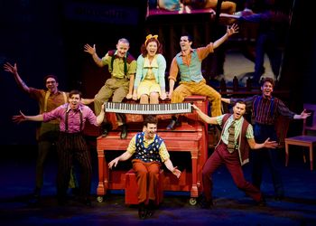With storyline and concept by David Atkins and Max Lambert and book by Larry Buttrose and Kathryn Riding, Hot Shoe Shuffle begins with a montage of scenes from the 1940s that pay tribute to dance and more dance. And just before you tire of the extended intro, we meet the seven Tap Brothers: Spring (Sean McGibbon), Slap (Michael M. Sakelos), Buck (Thomas Sutter), Wing (Kurt Csolak), Tip (Austin Carroll), Tap (Jonathan Eisele), and Slide (Jared Alexander), all clad in Jim Buff's colorful and garish costumes. While the get-ups fit the personalities of the characters, when placed against the backdrop of Michael Versetti's elaborate and stylish set pieces, the scenes beg for contrast when the visuals start to blend together. Nothing and no one can be highlighted when everything in those moments is bright. Luckily, the superb dancing of each of the actors goes on to distinguish one from the other. Following their spirited and skillful intro, we learn that the brothers are gathered together to find out about the sizable inheritance left by their estranged and deceased father. In order to obtain the moola, they have to perform their dad's show Hot Shoe Shuffle in just four weeks. The smaller problem is that they need an actress to star in the show. Before you say "wherever will they find one?" with chin in hand, their long-lost and supposed unknown sister April (Alex Kidder) pops in to assume her place. The bigger problem? Though sweet as pie and pretty to boot, April has two left feet. How will they get her ready in time? The hows and the how nots that follow may not always make sense, but they make for a funny and lighthearted time. From lights up to lights down, Hot Shoe Shuffle keeps the laughs and the oohs and ahs coming, with flips, tricks, and everything in between. Choreographed masterfully by Justin M. Lewis and directed by Jonathan Van Dyke, the septet shine together just as well as they do in their solo work. As to be expected, the dancing surpasses the singing in this dance-centric show, but Kidder's vocals soar and ring with such clarity that they cannot be denied. Kidder is a stunning songstress who breathes life into the American big band standards that are interspersed throughout the show. And to round everything out, the pizzazz of the 10-piece live orchestra draws the audience deeper into the show within the show. Hot Shoe Shuffle is a dynamic and energetic showcase for its cast and a comedic treat for its patrons. After two hours, with a 15-minute intermission, you're likely to exit happier than when you first walked in. Hot Shoe Shuffle runs through November 10, 2019, at the Wick Theatre, 7901 N. Federal Highway, Boca Raton FL. Performances are Thursdays, Fridays and Saturdays at 7:30 p.m. and Wednesdays, Thursdays, Saturdays and Sundays at 2 p.m. Tickets $75-85. For tickets and information, visit www.thewick.org or call 561-995-2333. Cast: Understudies: Orchestra: Crew: |