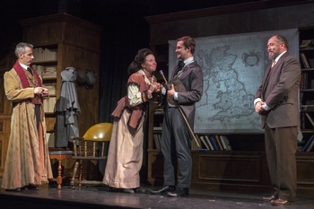 But that's also one of the problems in this Insight Theatre Company production of Ken Ludwig's Baskerville. Ludwig (most famous for Lend Me a Tenor) pushes Sherlock Holmes even farther into the background as a result, when the great detective is absent from most of the second half of the original book already. Thankfully, John O'Hagan is perfectly believable in the role, under the direction of Maggie Ryan. He plays much of the part in a solid, realistic manner, but still manages a few moments of fine manic gesticulation in act one. And his thoughtful explication of the presence of a mysterious walking cane before that sets Mr. O'Hagan up right away as a master of observation and deduction. In the end, though, Baskerville is based mostly on the same gimmick as the recent stage version of The 39 Steps: two or three other actors frantically change costumes off-stage to play a constellation of characters from the 1901 serialized novel "Hound Of The Baskervilles." This newest incarnation, at the .ZACK theatre, is likewise a costume farce, based on the impossibility of making it all work in the first place. At least in The 39 Steps (originally conceived by Simon Corble and Nobby Dimon and adapted by Patrick Barlow) we were in on the frantic challenge, as the changes took place before our eyes. In Baskerville, Kent Coffel, as always, is very likable and reliable here as Dr. Watson. And Ed Reggi is very charming as the American heir to the Baskerville estate, Lord Henryhe's also great as Lestrade, Holmes' glowering nemesis from Scotland Yard and in a few other roles too. But we must stand in awe of the remaining two cast members, Gwen Wotawa and Elliot Auch, as they unleash a cavalcade of suspects both in London and upon the deadly moors. The whole show depends on their ability to each trot off as one character and then come bouncing back just a moment later as someone entirely different. And this they do, delightfully, dozens of times. But the outstanding Ms. Wotawa and the ingenious Mr. Auch never seem to break a sweat, in their many guises, and we become complacent. Perhaps they make it look too easy. Conan Doyle's puzzle still fits together as nicely as ever, but the amazing costuming caper swamps everything else (overwhelming the mystery of how the previous Lord Baskerville died, and whether or not it was premeditated, and whether or not it's about to happen all over again). It really is hard to believe Ms. Wotawa can embody (and clothe) so many characters with such great fullness and range, and so quickly; and Mr. Auch isn't very far behind in his own mad repertoire of incidental (and not so incidental) selves, in all sorts of haberdashery. Interestingly, in at least three Ken Ludwig plays, all of the most important stuff happens offstage: in Tenor, the imposter performs in the opera concert during intermission; in Fox On The Fairway, the key moment in a golf match is off-stage; and here, the most crucial points of this reimagining of Conan Doyle's novelthe many costume changesall occur backstage, too. Make of that... what you will. But I think the larger point here is that the stage version of The 39 Steps is an even more episodic and style-driven piece. Conversely, Arthur Conan Doyle's "The Hound of the Baskervilles" is very tight and plot driven, and all that just gets a bit trampled in Ken Ludwig's "fast-change" rewrite. When all is said and done, the immortal Holmes and Watson seem to be left hanging on the wardrobe rack themselves. Baskerville continues through October 29, 2017, at the .ZACK Theatre, 3224 Locust St. For more information visit insighttheatrecompany.com. Cast of Characters * Member, Actors Equity Association Design Team |