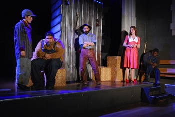 But then, of course, I realized director Thompson was right there on social media. So I messaged her, asking: why do all these actors each seem to be doing something new and exciting? (Her answers, from on-the-fly texting, are lightly edited.) "Yes, I absolutely challenged them to reimagine this world and make different/bold choices, bringing them to life. We added new 'given circumstances,' i.e. Candy, hoping to join George and Lennie on their dreamed-of rabbit farm, but 'gender-passing' for her own survival. We also have Lennie having the privilege of living in the bunkhouse with the white workers because of (his traveling companion) George, and because of the lighter shade of this Lennie's skin. We're color-exploring the juxtaposition between his skin tone and that of the ostracized, darker-skinned stable-boy Crooksin a variation on the status difference between house slaves and field slaves." The cumulative effect of both that and Natasha Toro as Candy adds unexpected tension, subtle new frictions, and a heightened sense of danger at SATE's usual home, a chapel just south of Washington University. And this version of Steinbeck's 1938 play seems far removed from the familiar Saturday morning cartoon parodies of our youthmade more real by vibrant characters. Steinbeck is best known for his working class men and women, and this staging finds new dimensions for its heroesand villains. Adam Flores plays George, the itinerate farmworker roaming California's Salinas River Valley in the dark days of the Great Depression; and Carl Overly, Jr. plays his problematic companion, the childlike giant Lennie. Director Thompson says it was Mr. Flores who suggested the recasting the role of Candy with a Latina woman passing as a man in the migrant fields, based on his own family history. And that opened the door to Ms. Toro as an earnest, unexpectedly tragic version of the disfigured ranch hand. It's an unsettling new twist and a compelling addition to the story. Omega Jones, as Crooks, gains surprising dramatic power from his reserved, but bitter clash with Lennie, over the latter's light-skinned privilege. Their big scene seems weirdly fresh and doubly provocative, as Crooks sows the seeds of doubt about George's expected return from a night on the town. It's not dissimilar in effect from the most notable inspiration of the production: Ms. Toro as a distaff Candy, her heartfelt plea for escape from a man's lonely life of migrant work becomes deeply, personally resonant as well. Michael Cassidy Flynn shows an entirely new side as Curly, the jealous, petulant son of the local ranch owner; and Courtney Bailey Parker is warm and foolish and vain as his new wife, who can't seem to stay away from the migrant workers. Her big scene with simple-minded Lennie is full of solitary confessions, with the seemingly innocent confessions from each character intertwining with disastrous results. It's a sort of "non-dialog": two monologs overlapping, hers and his, creating a dangerous resonant frequency between them. Another big surprise is the return of actor Jack Corey, here as The Boss, after Mr. Corey's 32-year absence from the stage. In terms of theatrical lineage, he came out of the same fine batch of St. Louis University actors that included Lavonne Byers and the late Russ Monika. He's lost none of his sense of stagecraft in the intervening decades. There are rich performances from everyone in the cast, which includes Joe Hanrahan as a bemused Slim, Shane Signorino as a rowdy farmhand, and Ryan Lawson-Maeske as a wily young rancher with a very funny, insider's knowledge of the local bawdy houses. The bluesy mood is heightened by stirring live music throughout, provided by Chris Ware. And, staged on a dimly lit altar, it all comes to look like parable in search of final judgment. Of Mice and Men, through November 18, 2017, at The Chapel, 6238 Alexander Drive, St. Louis MO. For more information visit www.slightlyoff.org. Performance Ensemble: Production Ensemble: |