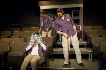 I don't know what I'd cutauthor Annie Baker is a restless philosopher, like any good playwright, and each character develops through little snippets of work chat, which is like the slow mystery of erosion as her people are laid bare. On top of that, with thorough staging at R-S Theatrics, director Joe Hanrahan makes any choice of cutting impossible. (He compares the experience of watching a nearly three-hour play to modern "binge watching" of a streaming TV series.) And, scene by thoughtful scene, the latest offering at the Kranzberg Arts Center adds up to an epic view of millennial work-life. You will finally understand that errant nephew of yours. In The Flick, you're a student of liberal arts and nobody's hiring. And halfway into the routine of your daily shift, cleaning a movie house, you realize you're doomed to be a stranger: thrust in with a wildly disparate bunch, clambering on a trash heap for survival. And then the very next minute, you're as close as two or three people can be, in strange and unexpected ways. But it's still the end of the world. We just didn't know it. Set in 2012, there are references to many fine movies, as these characters clean up the theater, including Pulp Fiction and Goodfellas (neither of which I've seen, though it doesn't matter). And while it's one of the few movies that doesn't get mentioned by these movie house workers, you can also see the outlines of The Matrix being drawn in the plot of The Flick, in the way these janitors and concessions workers and projectionists slog to keep up an illusion of escape in the cinema. The seating for us, viewing the play, is on one side of an arena stageand the seating for the movie, heavily littered with popcorn and empty soda cups, is on the other side. The two worlds are separated by the suggestion of a white projection screen, which flickers occasionally between scenes. Nevertheless, we are complicit. The problem is, all three (or four, eventually) of the characters are so devoted to the magic of moviemakingand the job market so fragilethat they are bedazzled and caught at the bottom of the ladder. The usually brave and bold actor Chuck Winning plays Sam here, who is quite the opposite: a 35 year-old, stuck at home with his aged parents in Worcester County, Massachusetts. It's an excellent performance, where he's gradually stripped of pride and position. He's at a crossroads, turning to find that every path suddenly looks like a dead end. Jaz Tucker plays Avery, a college student in a summer job. He delivers gentle, heartbreaking moments of pathos, along with a pretty amazing Samuel L. Jackson impersonation, in spite of his reserve and Urkel-like glasses. And, like the main characters in 1994's Clerks, Avery finds much of his time is spent relatively unsupervised amidst every form of earthly corruption, coupled with a frantic social requirement to reimagine one's selftill the lights come up again, every two hours. Jennelle Gilreath is smooth and languid and diffident as the projectionist, Rosethe unattainable beauty of the piece, even with neon green hair. Later, she will have to take command and make a life-changing decision for all of them, in a startling scene. But several other scenes are about whether or not Sam or Avery could ever have her. As that plot element develops, all three of them learn that sexual liberation only intensifies the pain of rejection. So that's all they have in this space, their dreams and desires, existing in the crackle along the optic nerve. And, surprisingly, each finds happinesseven if it requires a genuinely magical "Twilight Zone" ending for one of them, while the very last grain of sand is tumbling down through the hourglass. Through December 23, 2017, at the Kranzberg Arts Center, 501 N. Grand Boulevard, St. Louis MO. For more information visit www.r-stheatrics.com. Cast: Production Staff: |